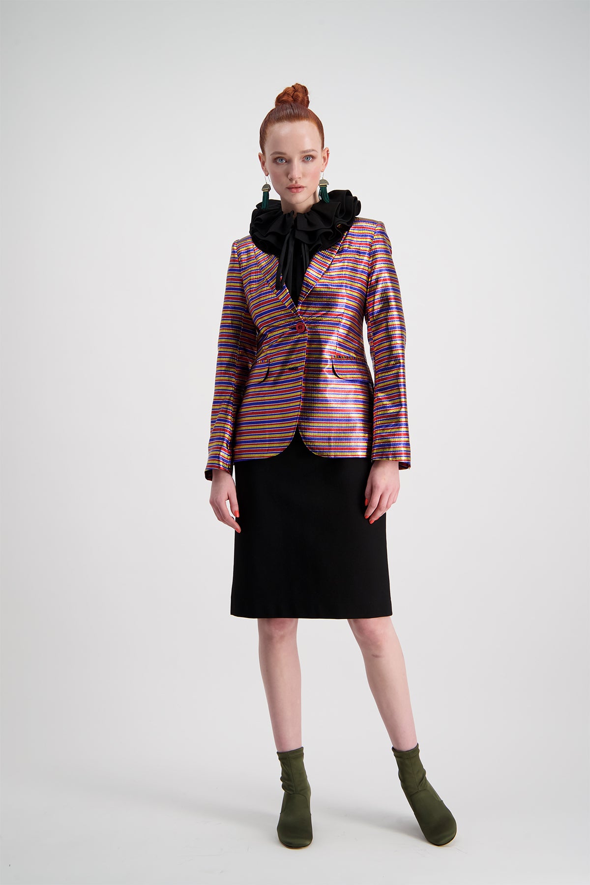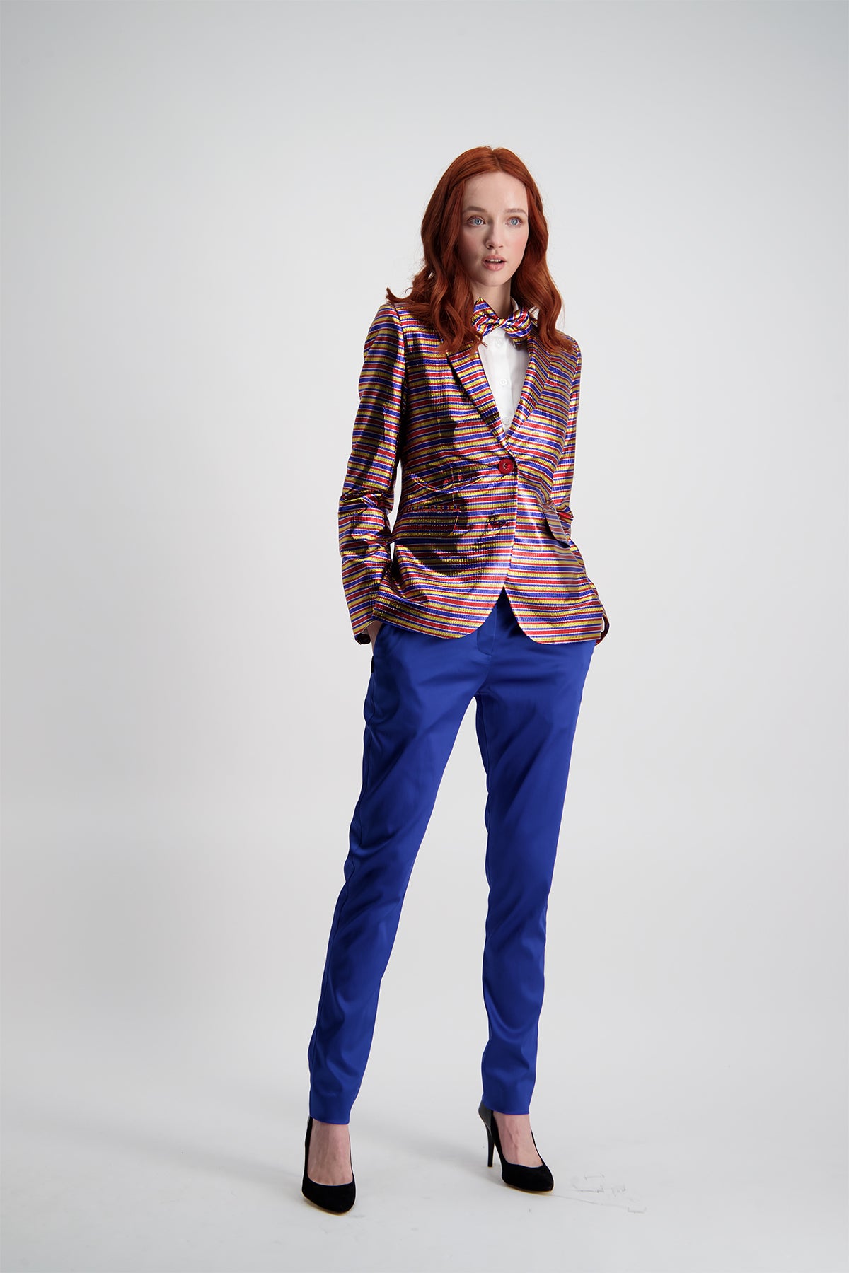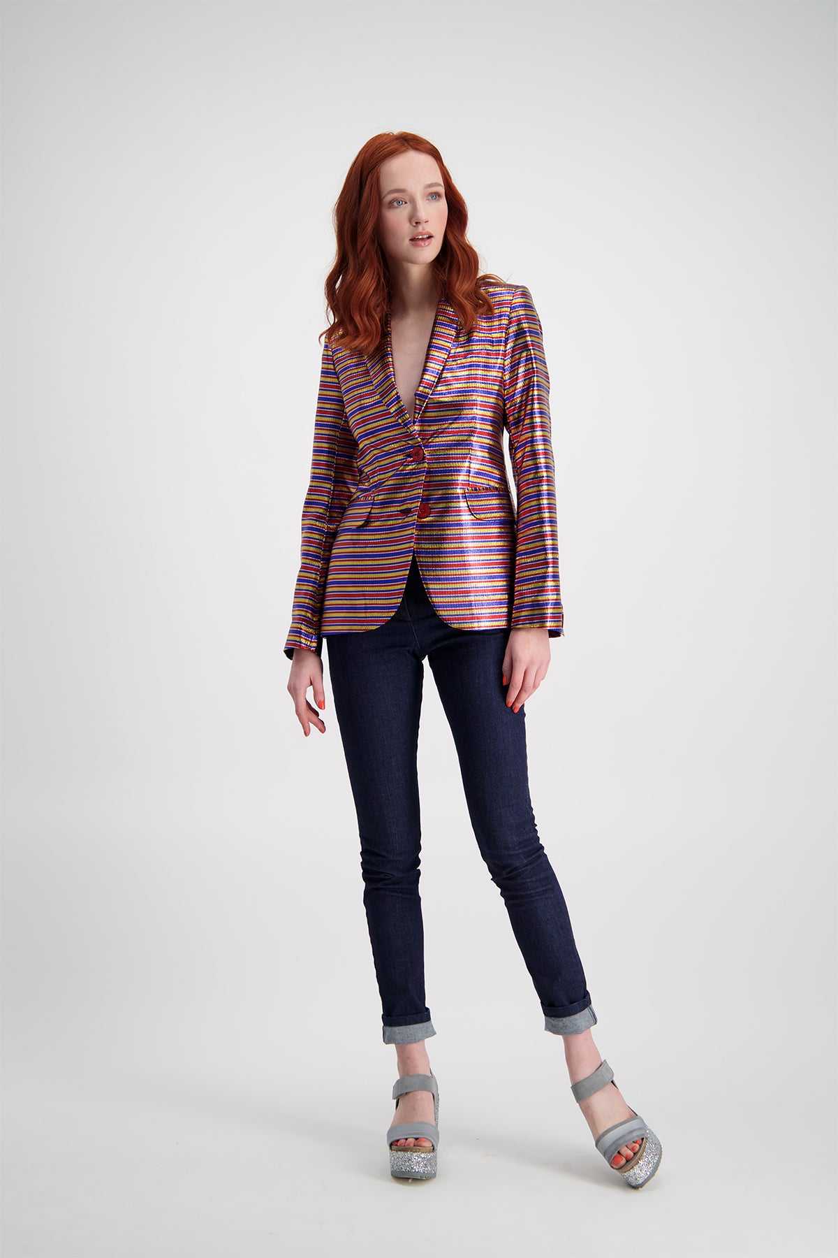 A classically shaped and styled single breasted blazer, two buttons with a double vent, cut from a electric metallic stripe. Turn up the volume on any and every outfit, put your casual comfortable self to one side and draw upon your dressed up party mood self! Take elegance with glamour and make a suit with power and presence.