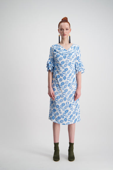 A classic shift dress with cowl neck and frilled sleeves in a weighted crepe chiffon that's been sunkissed with blue lipstick!Whether this joyful c...