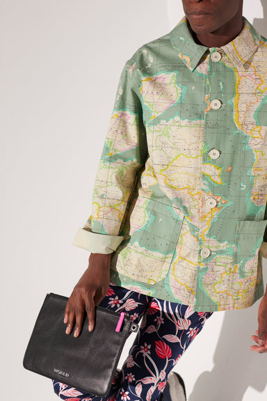 Black pebbled leather is contrasted by a hot pink pocket with the die cut ‘W’ on the exterior of this simple and sleek attaché. Lined in WORLD’s si...