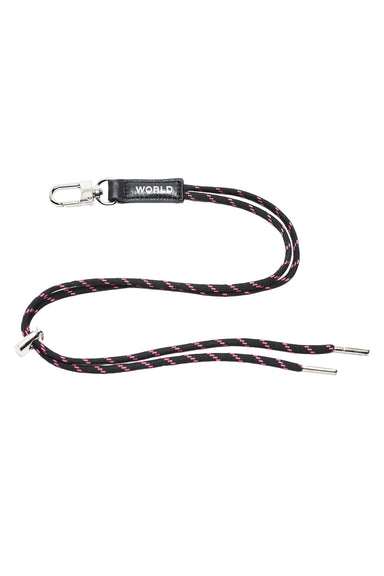 Black pebbled leather tab with silver carabiner and small silver foiled WORLD logo, attached to a lanyard cord with adjustable length. This lanyard...