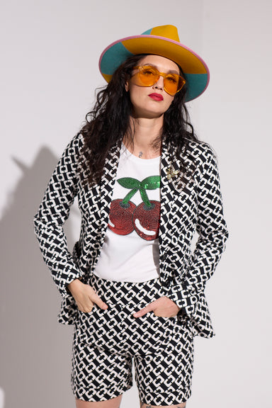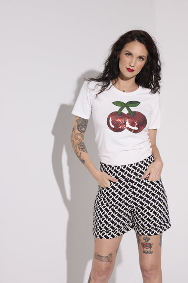 Style: Dress up T-Shirt that will tickle you pink with a playful feather print on a slinky stretch cotton base cloth. Fabric: Cotton Stretch Fit: S...