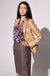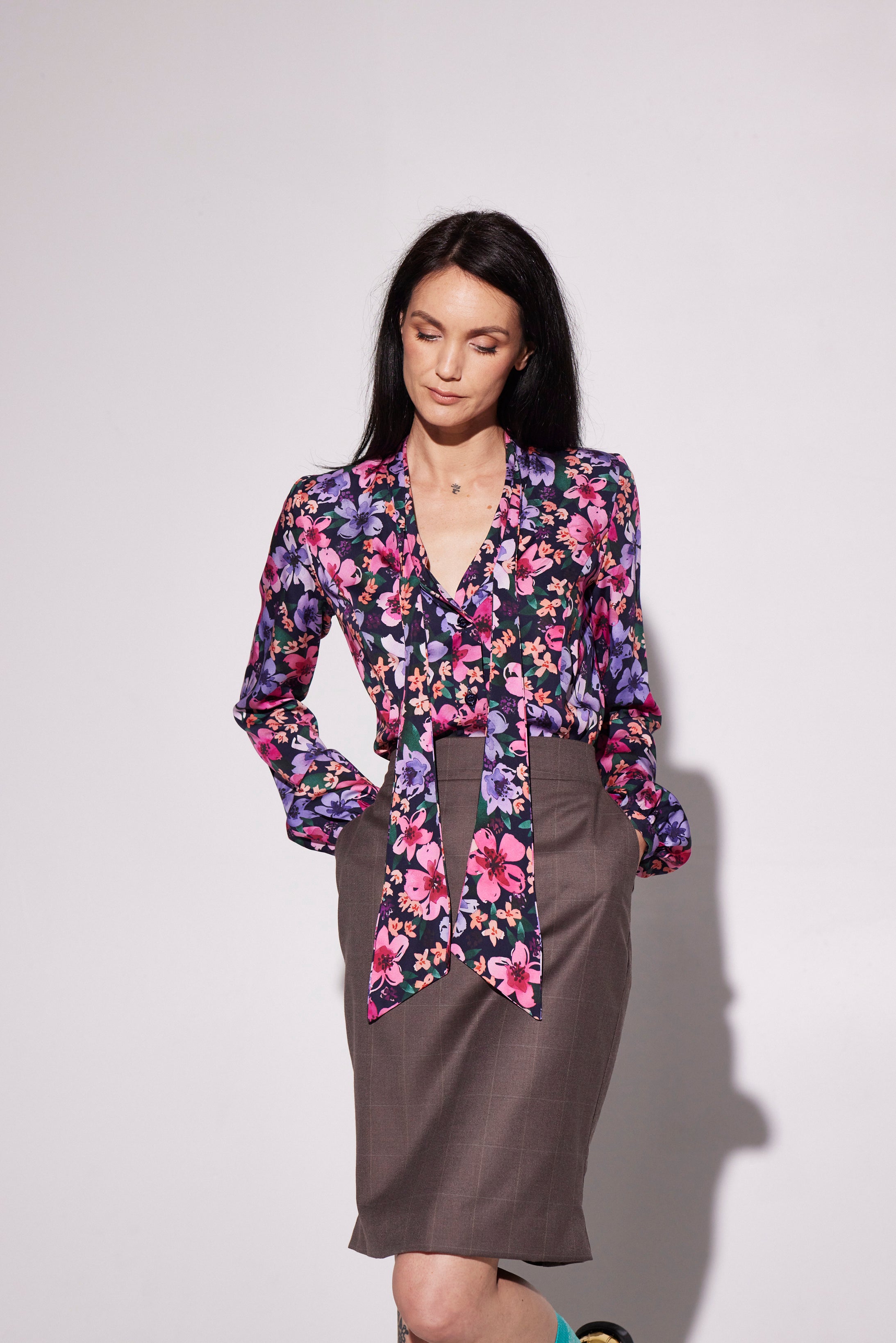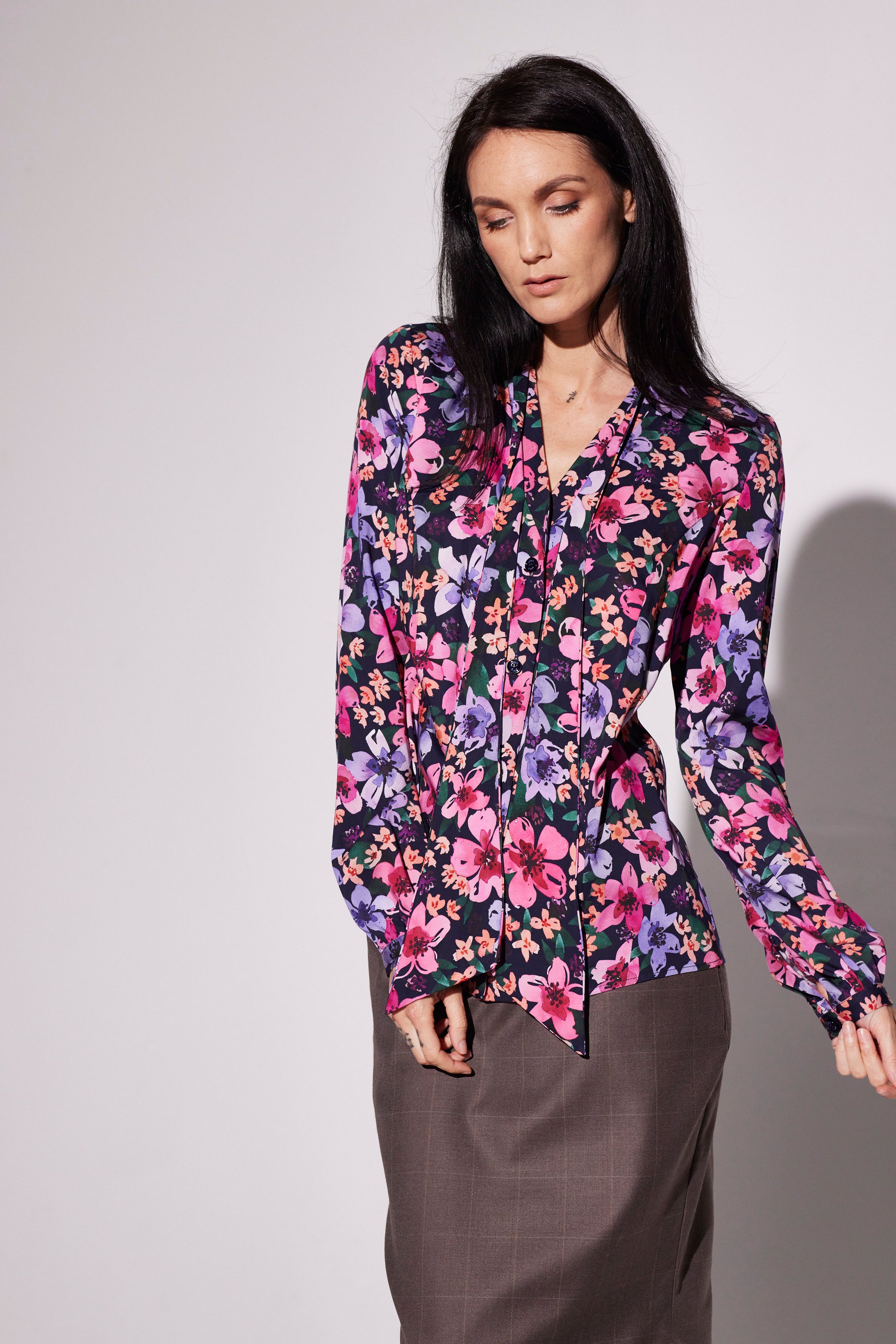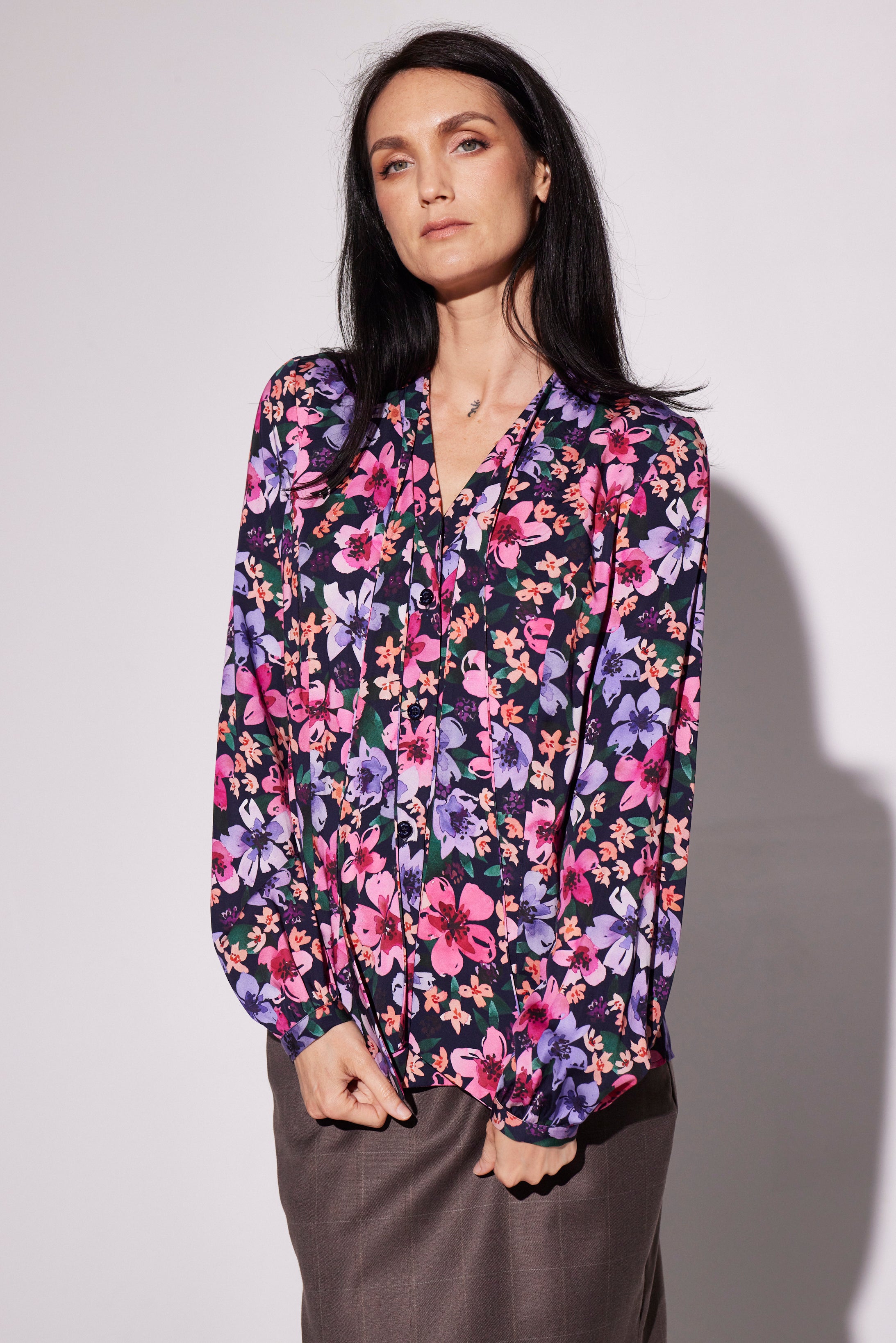 Style: Button-up tie-up collar, v-neck shirt style cut from a soft-touch, lightweight floral. With a draping feel this piece has a relaxed yet formal feel with some pouffe at the cuffs to add to the exuberant print.