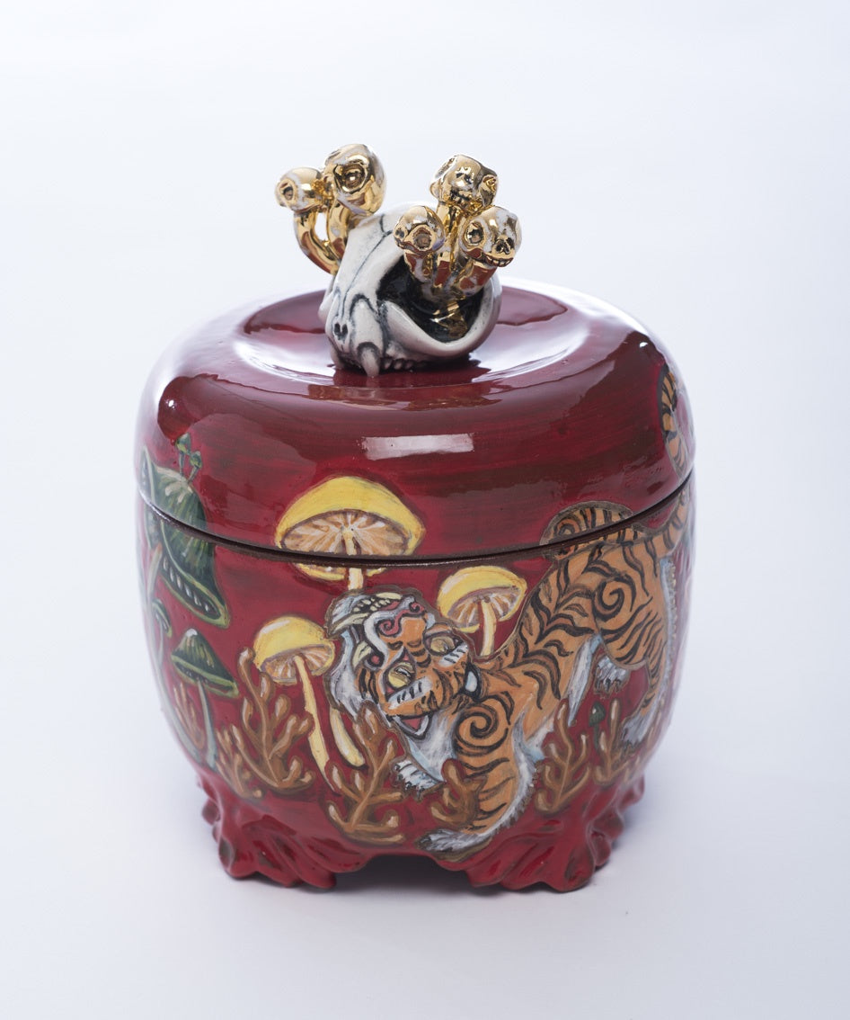 The collaborative practice of Rosy & Rich starts in art history, a perception, a sharing, a conversation, often an argument, leading to germination stages. The form is constructed through wheel throwing and hand-building techniques in clay. What follows is a surface response where graphic ideas are etched and painted. Colour and sheen bounce around between clay and glaze for several seasons and withstand multiple firings before each unique piece is completed. In this crucible of to and fro between the pair, surface and form, past and present, art and craft meet 1260 degrees Celsius to melt into an abundant, generously adorned function, ornamentally speaking.