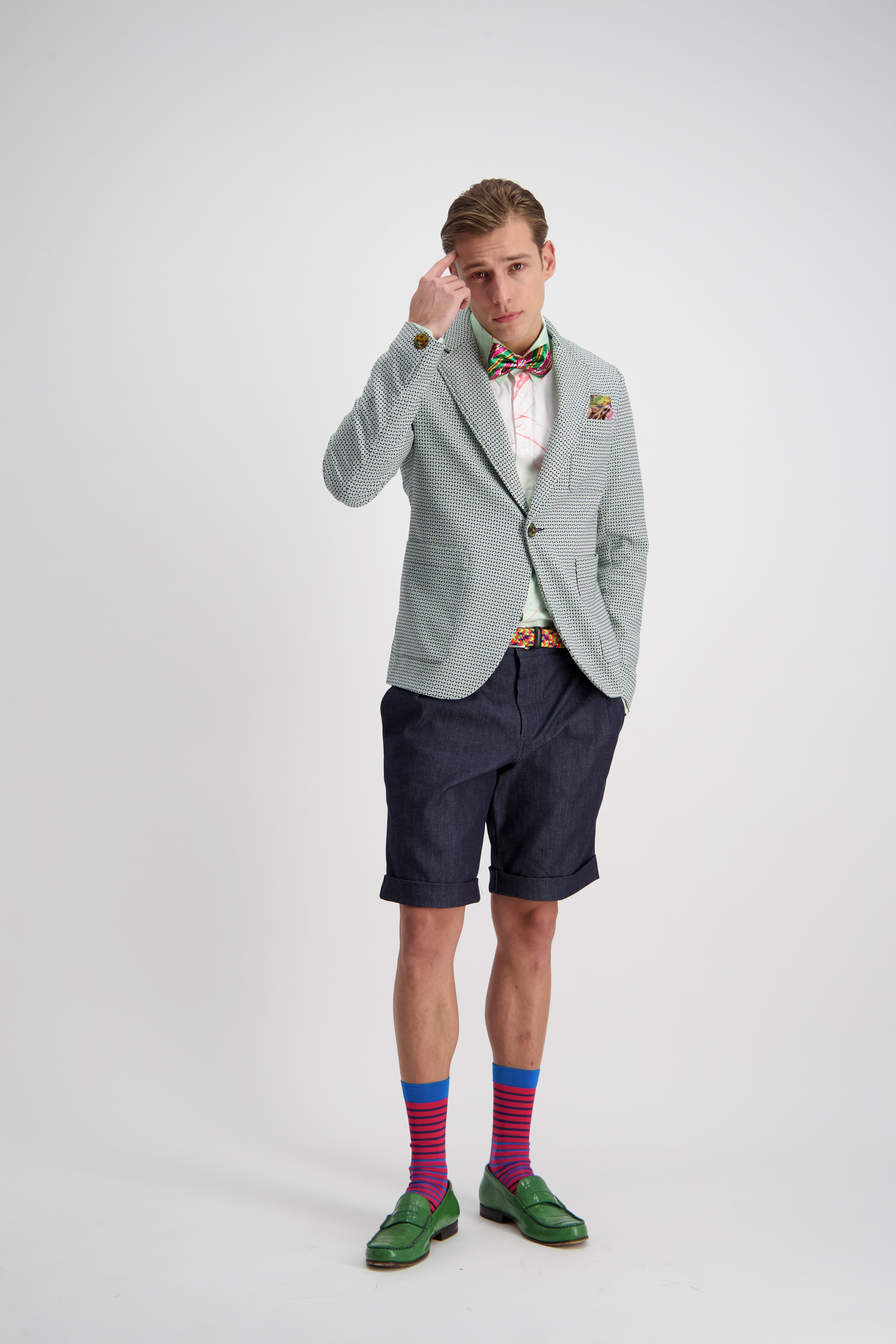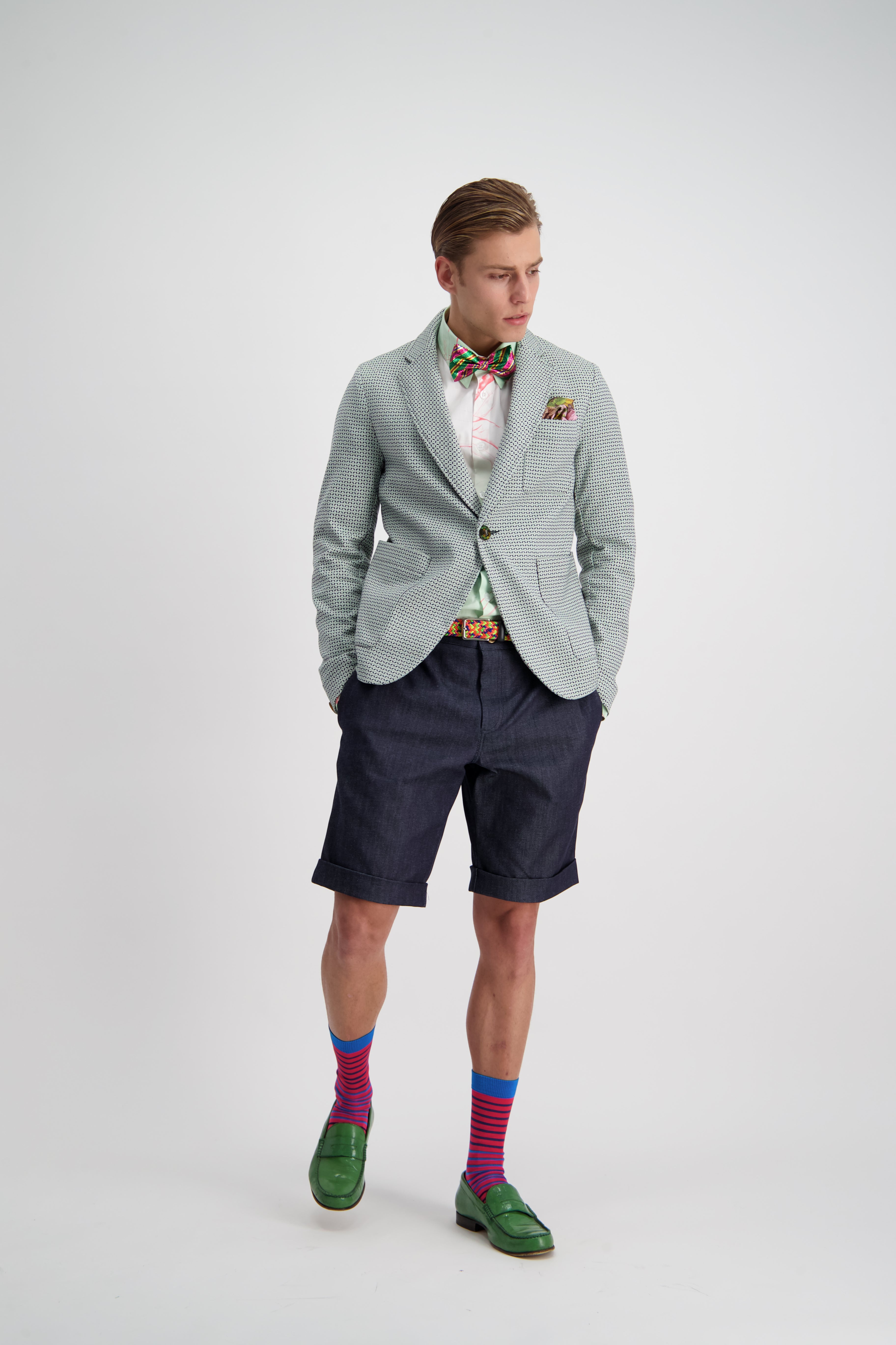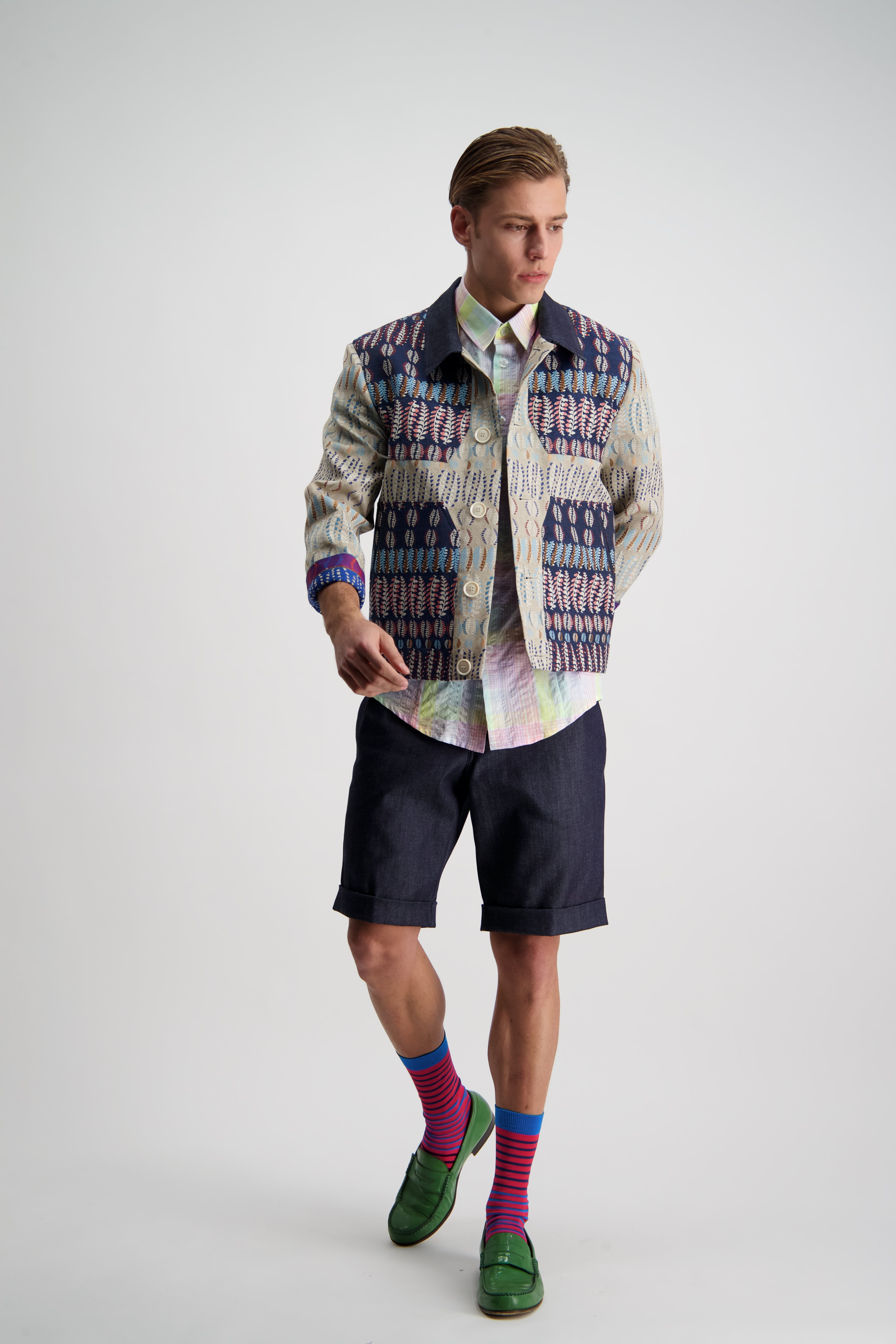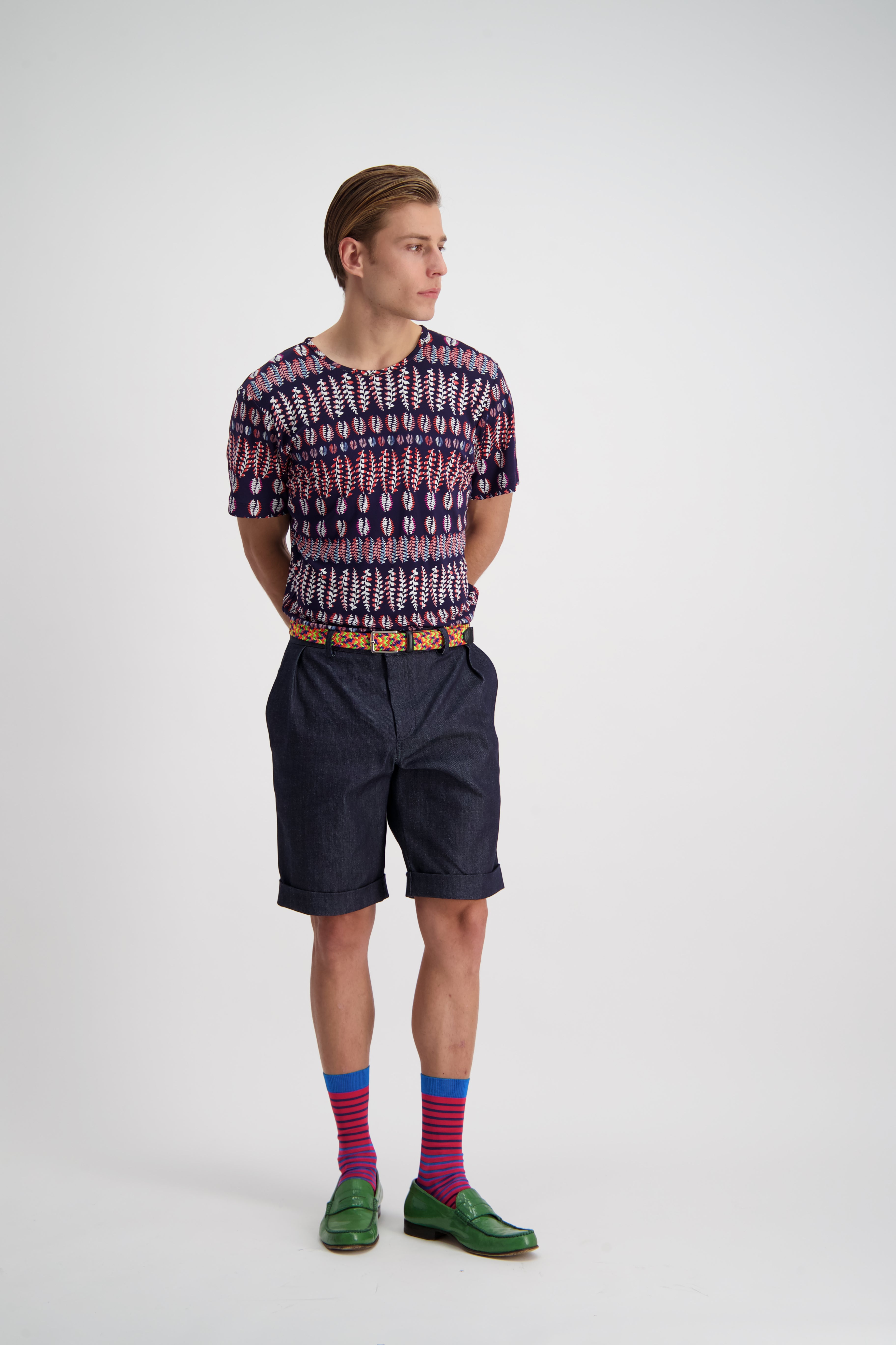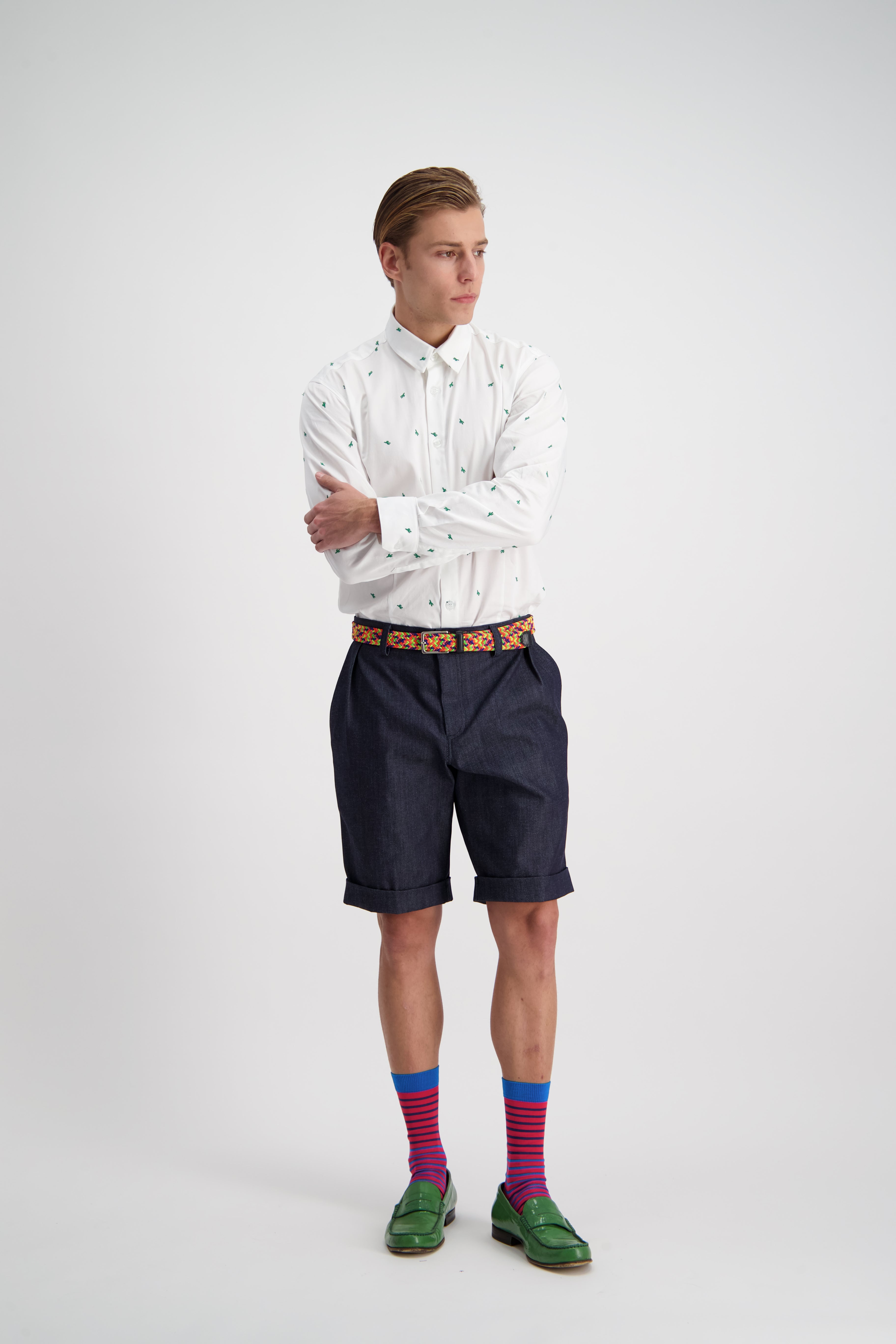 A relaxed pleat front shorts that can be tucked in nice and nerdy, or slouched down for ultimate summer comfort. A slightly taped leg with cuffed hem maintaining an elegance in the face of obvious comfort and casualness.