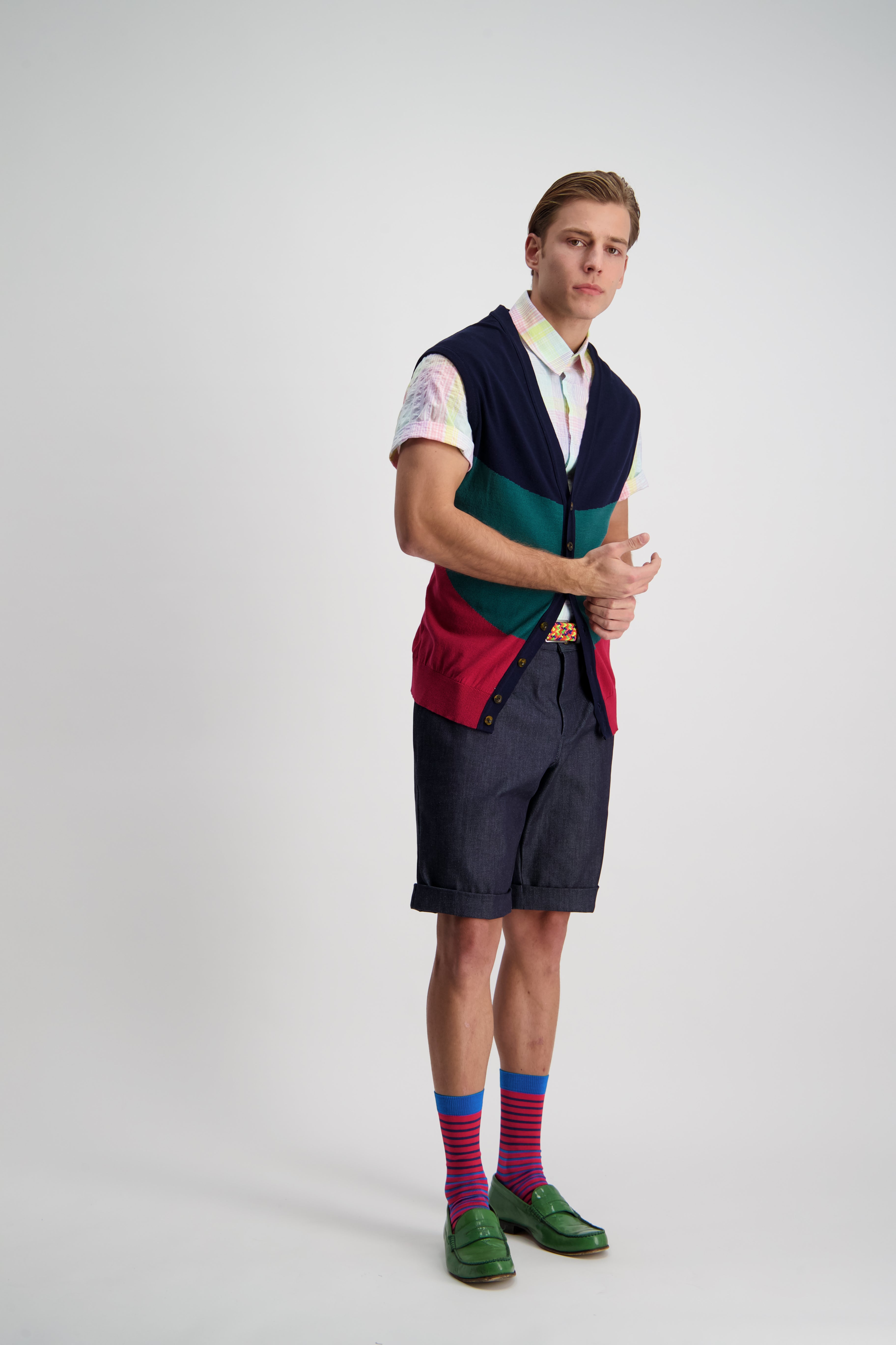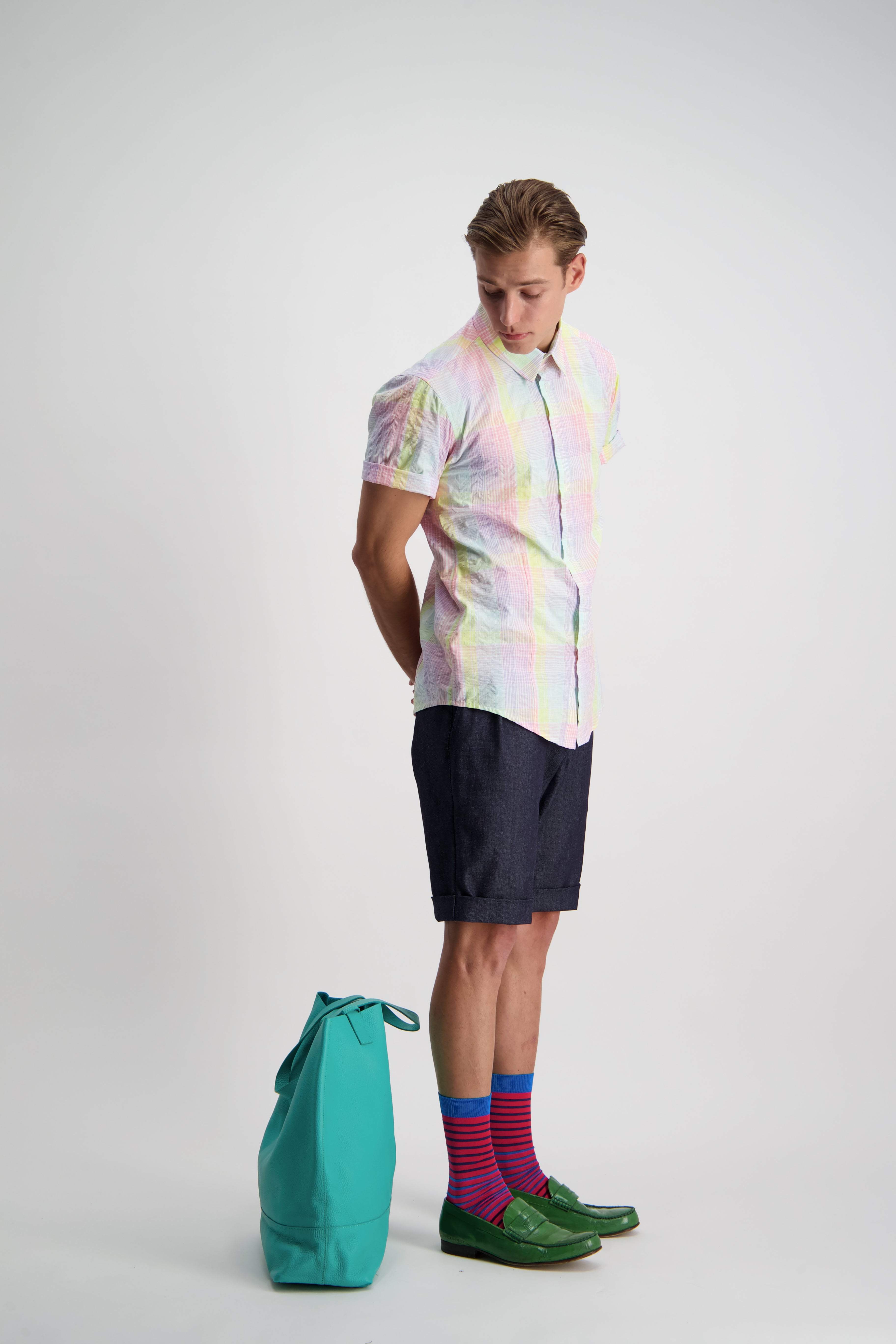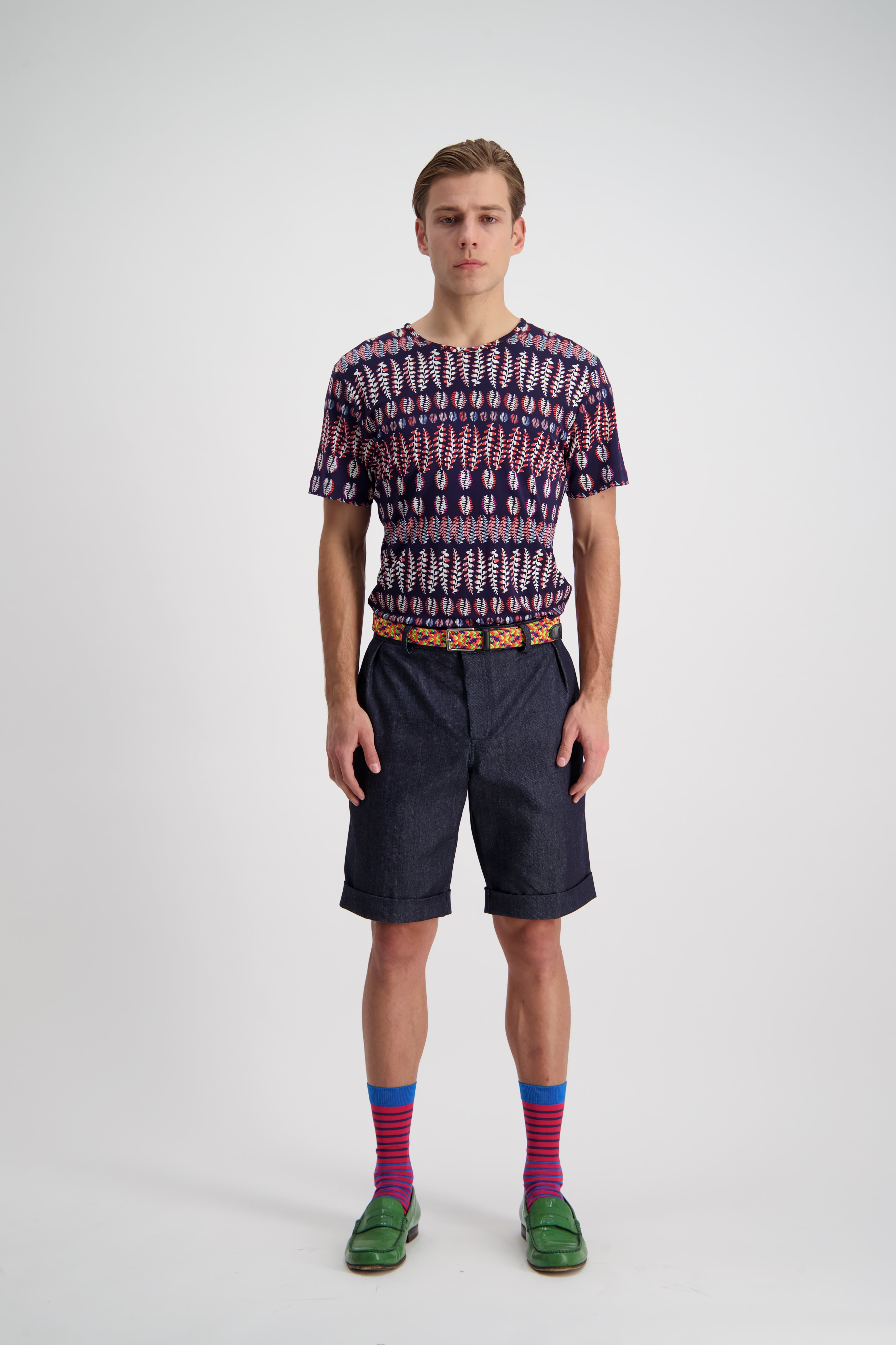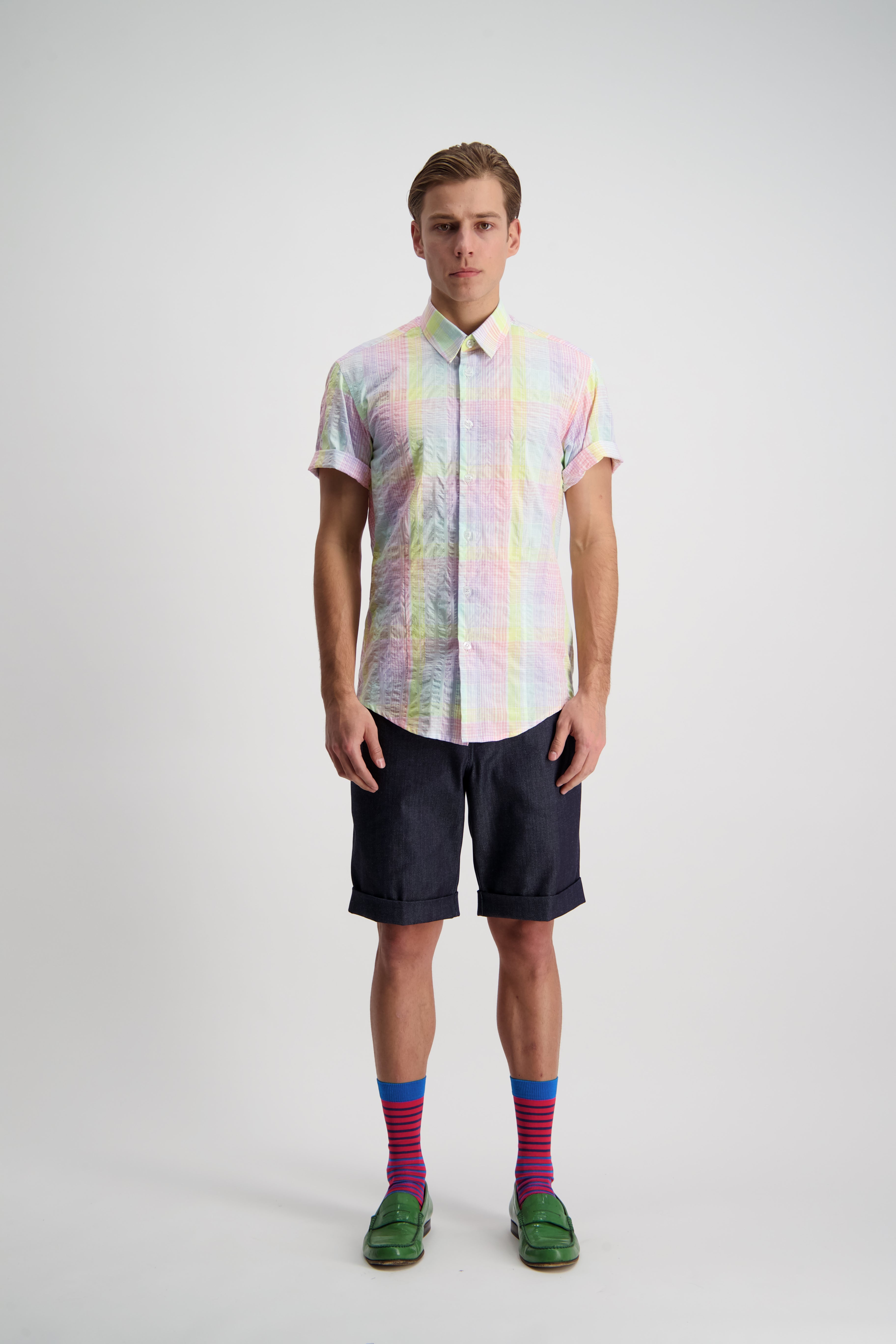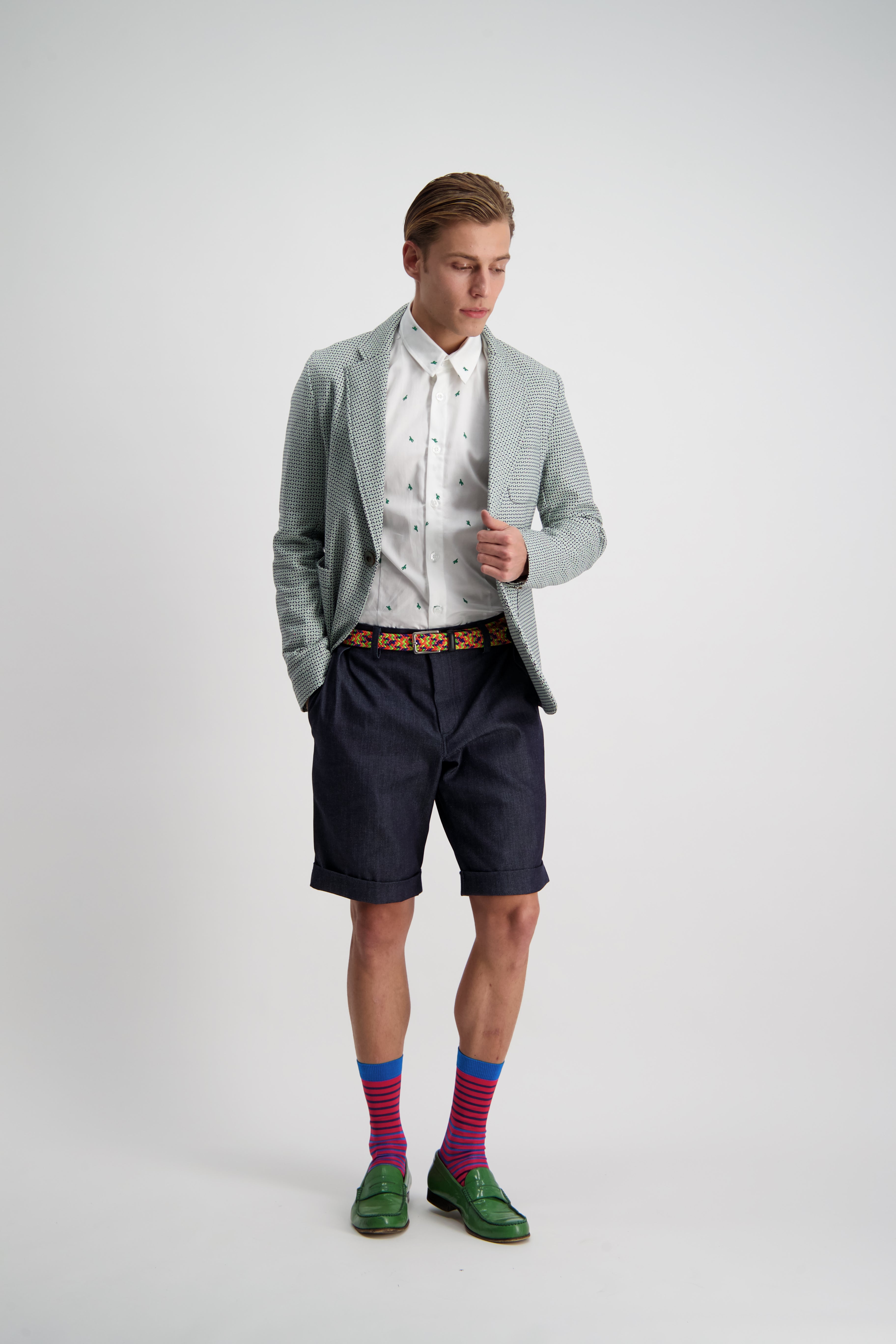 A relaxed pleat front shorts that can be tucked in nice and nerdy, or slouched down for ultimate summer comfort. A slightly taped leg with cuffed hem maintaining an elegance in the face of obvious comfort and casualness.