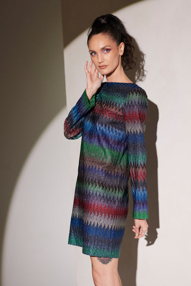 Featuring the label's signature metallic zig-zag knit, this minidress from Missoni has a boatneck, long sleeves and a fitted waist. Material: Visco...