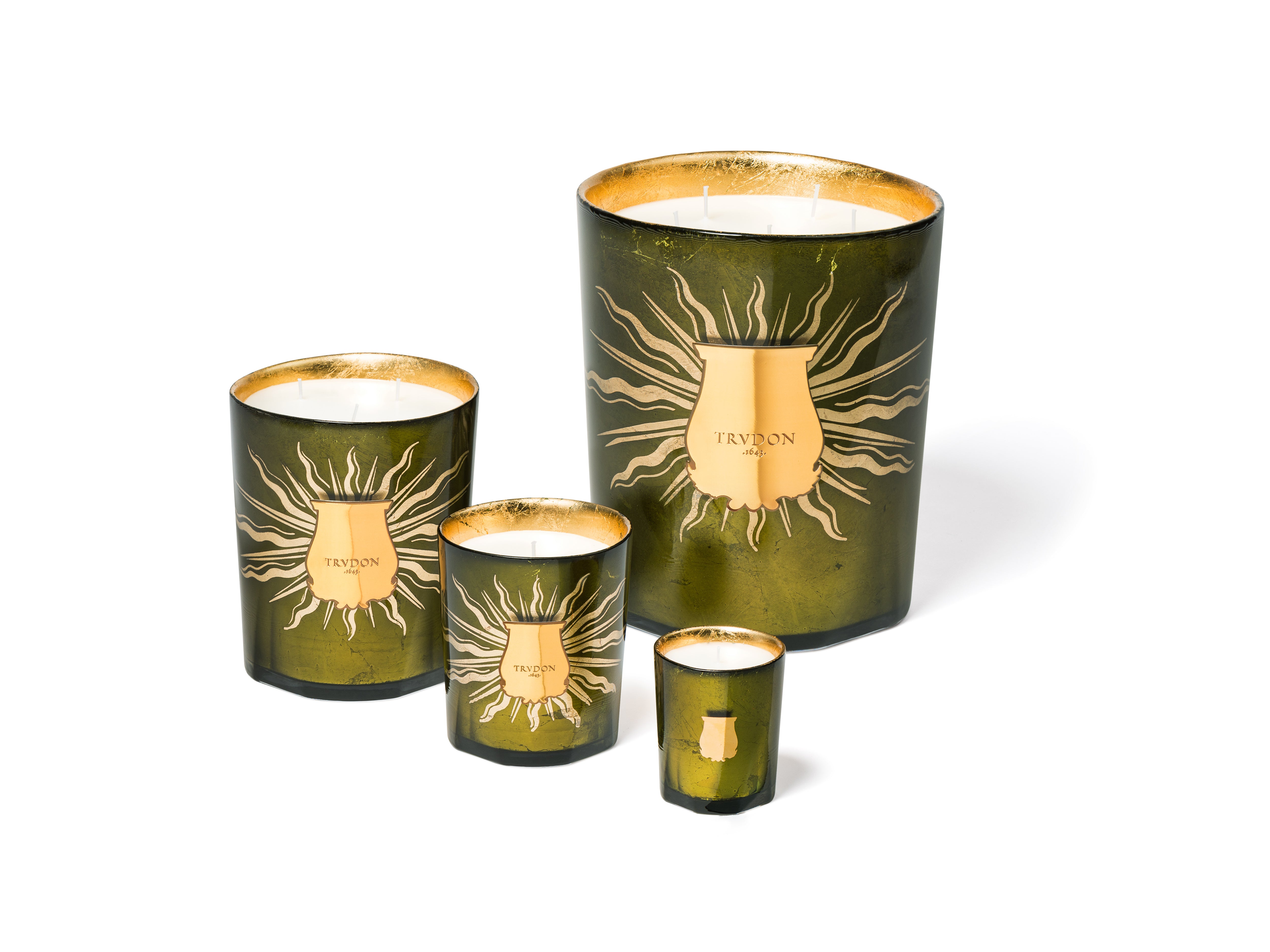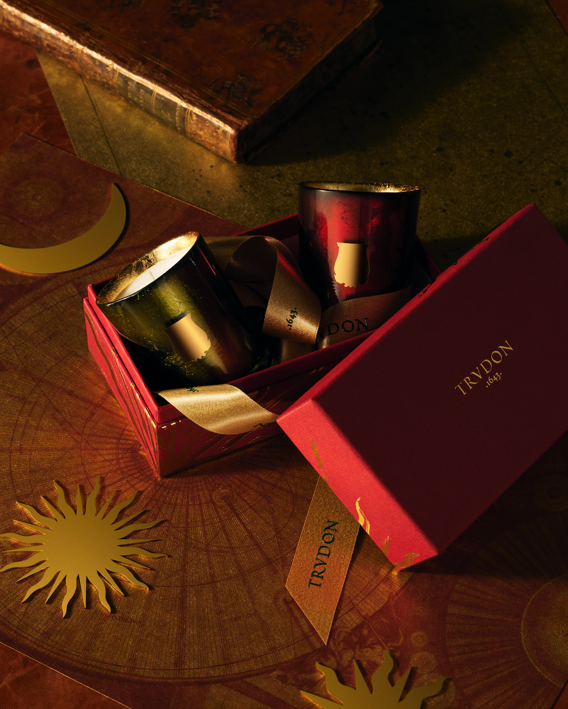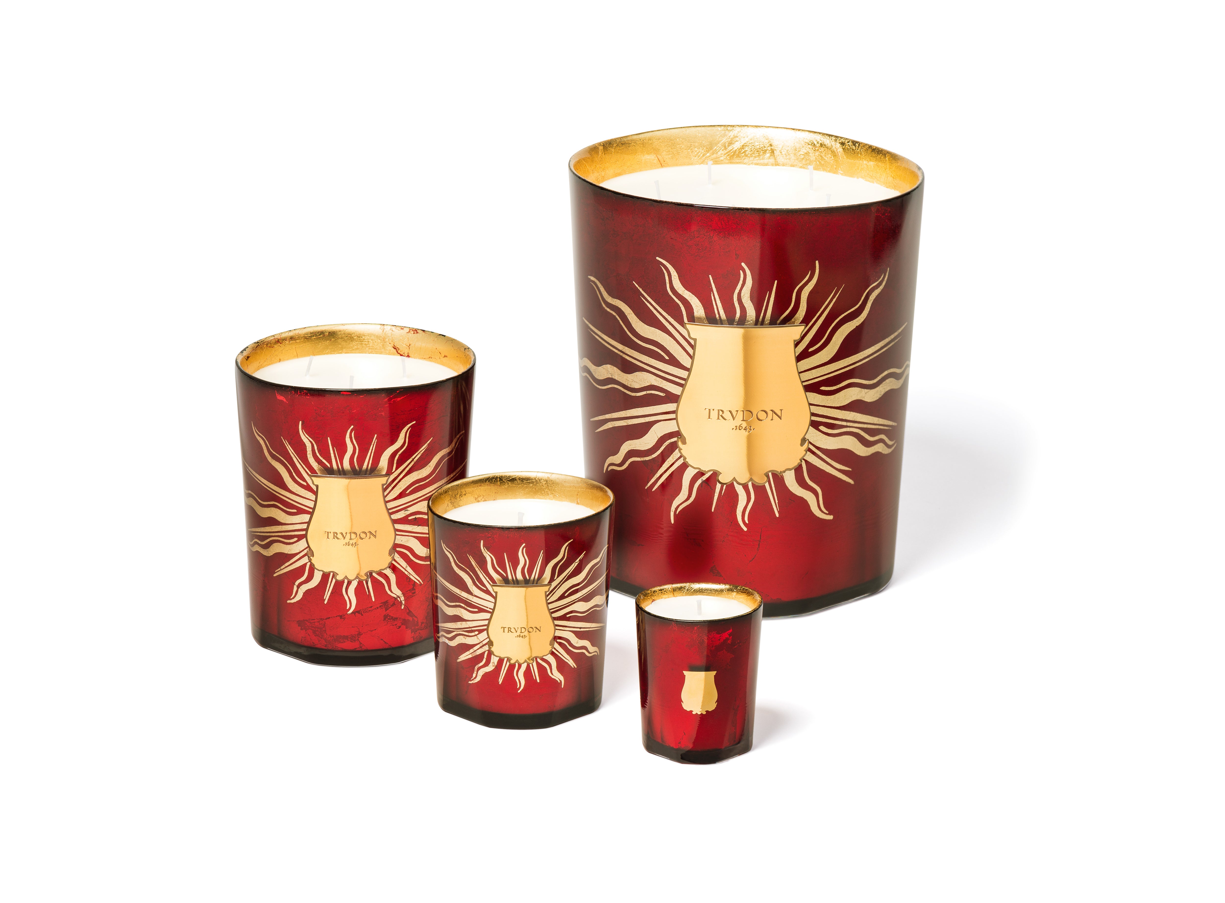 Crafted with care and a unique savoir-faire, the colourful glasses – red for Gloria, green for Gabriel – are adorned with gold leaf on the inside: shining through by transparency, a halo of golden beams surrounds a metalised Trudon emblem.