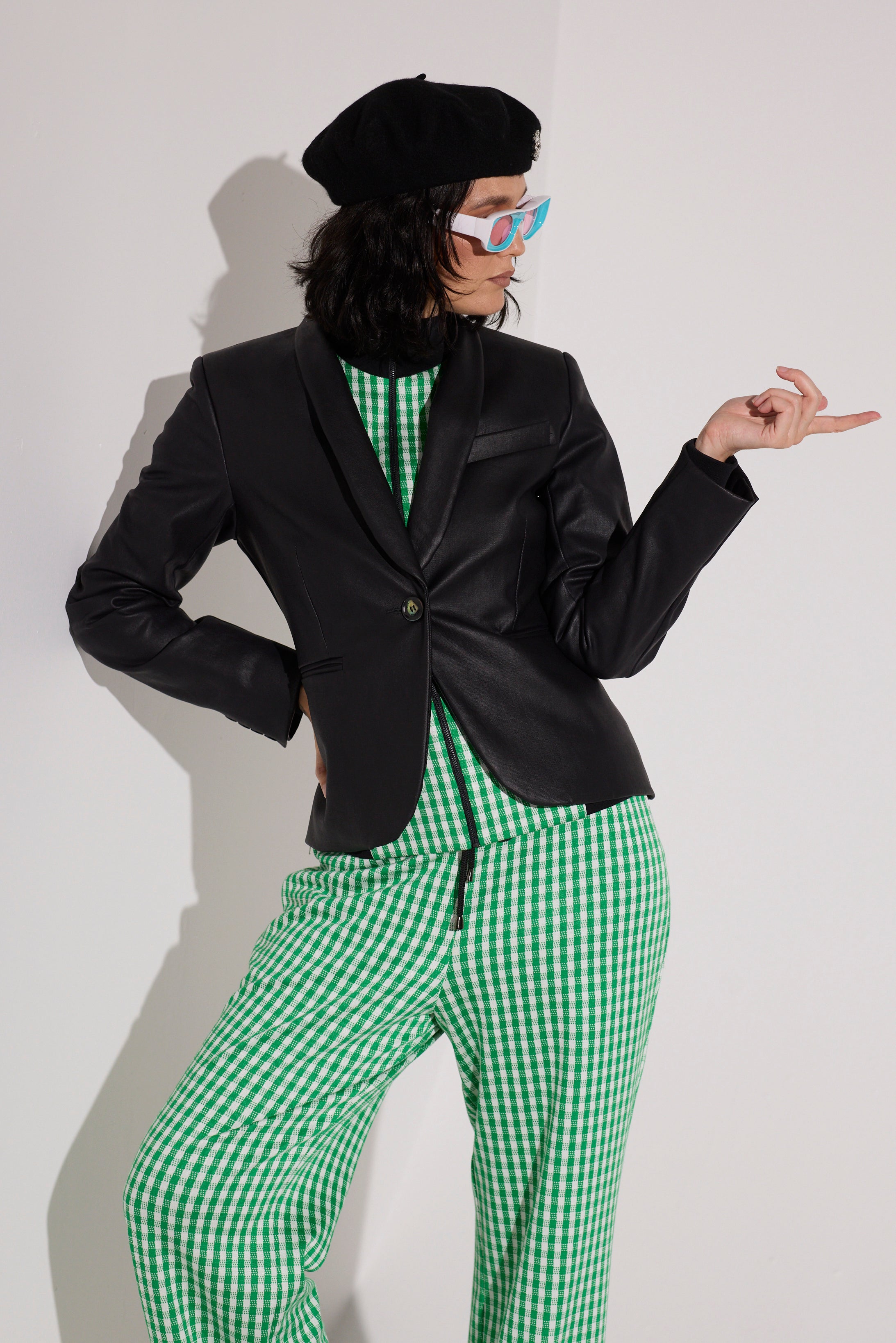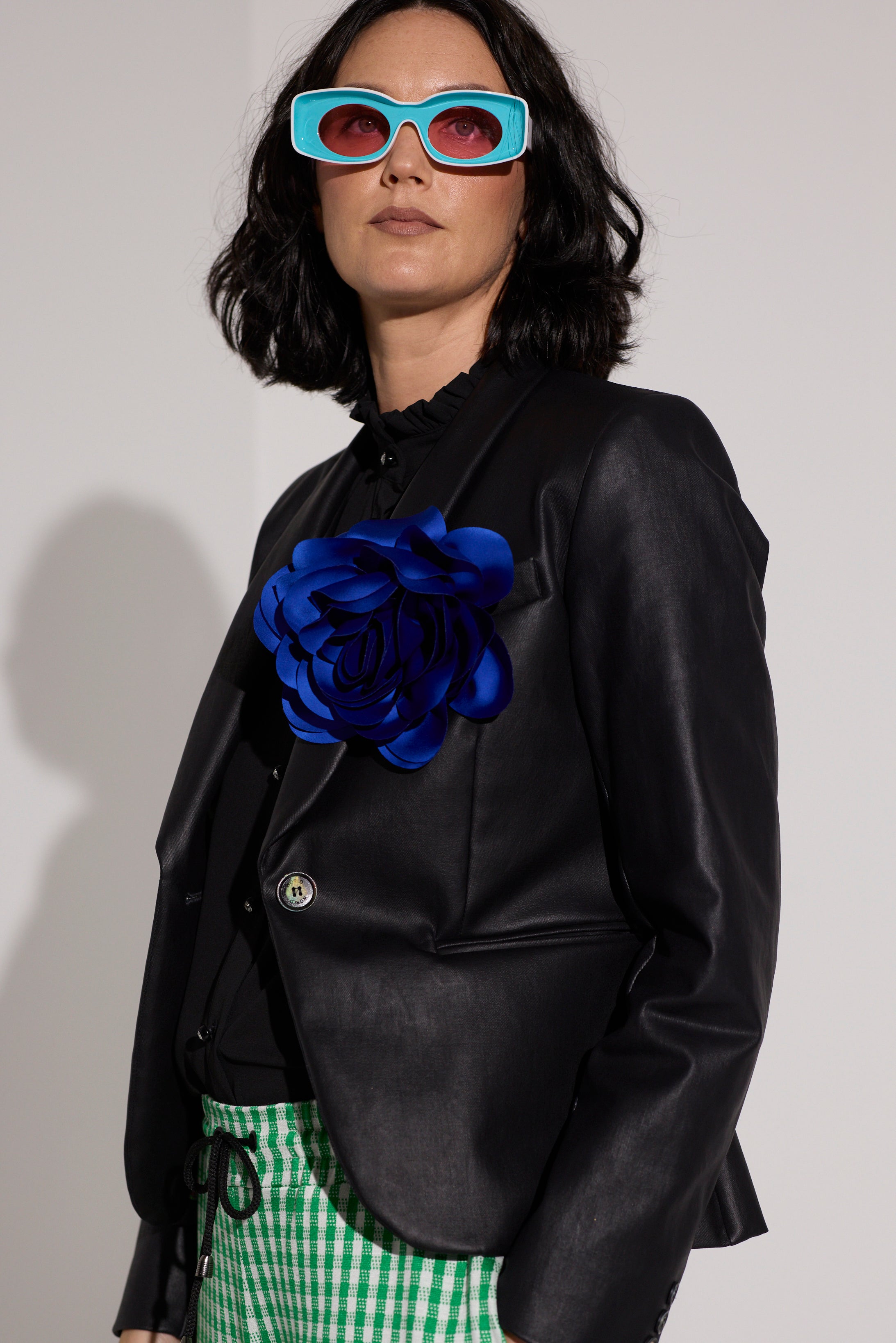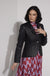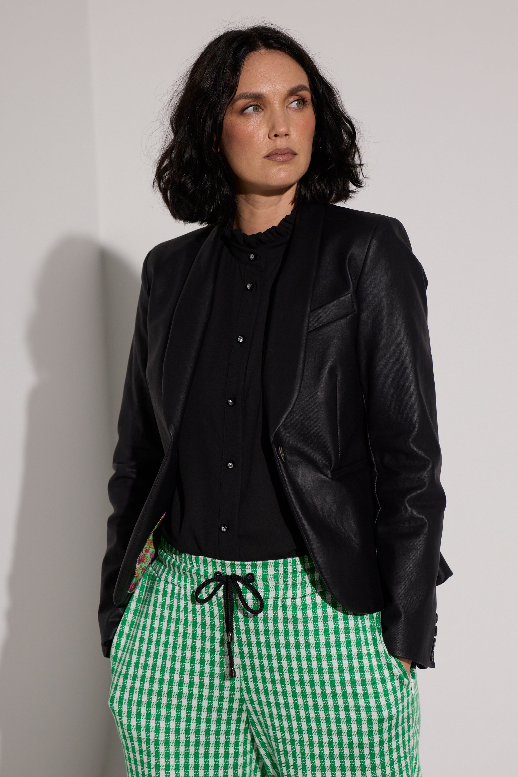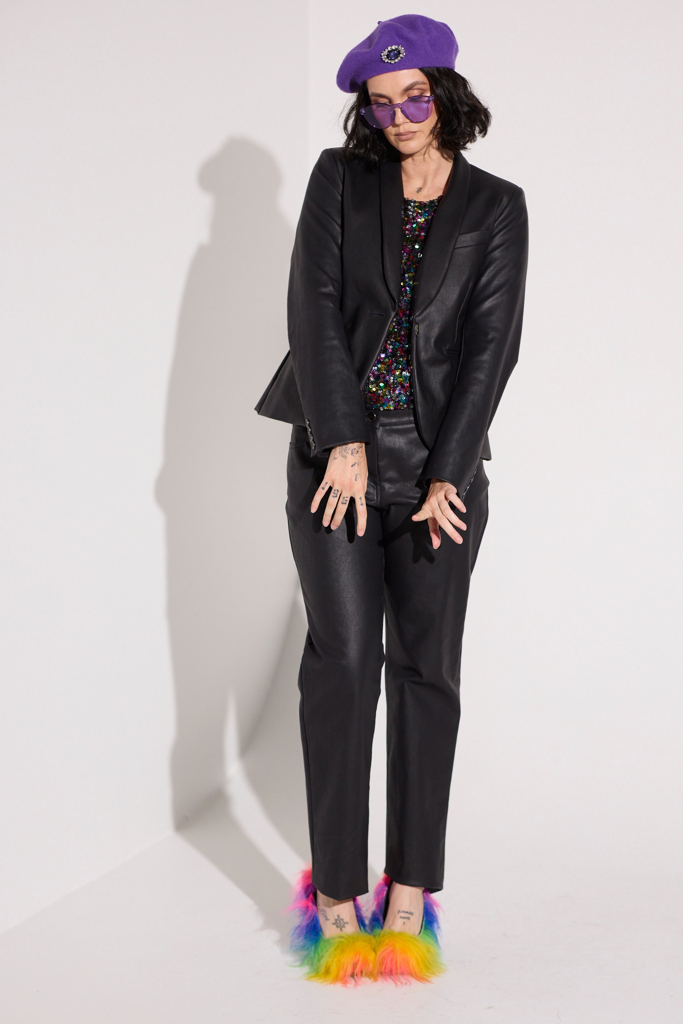 Formal fun...a tailored and elegant styled cropped blazer with a shawl lapel cut from coated denim with stretch that has a leather look and unique texture. Structured and formally made for a tailored look with expression, fun and personality in mind!