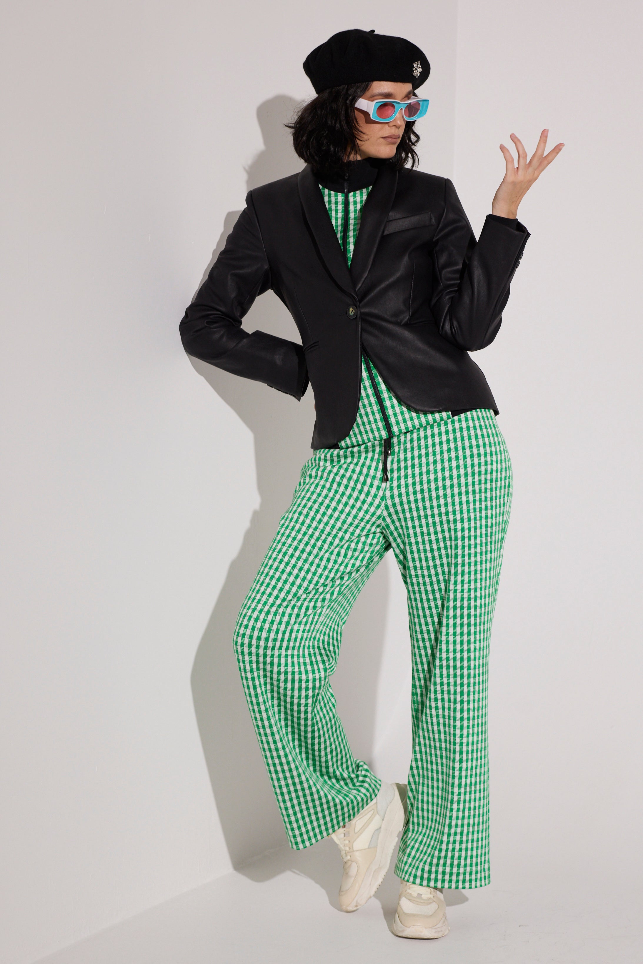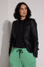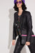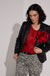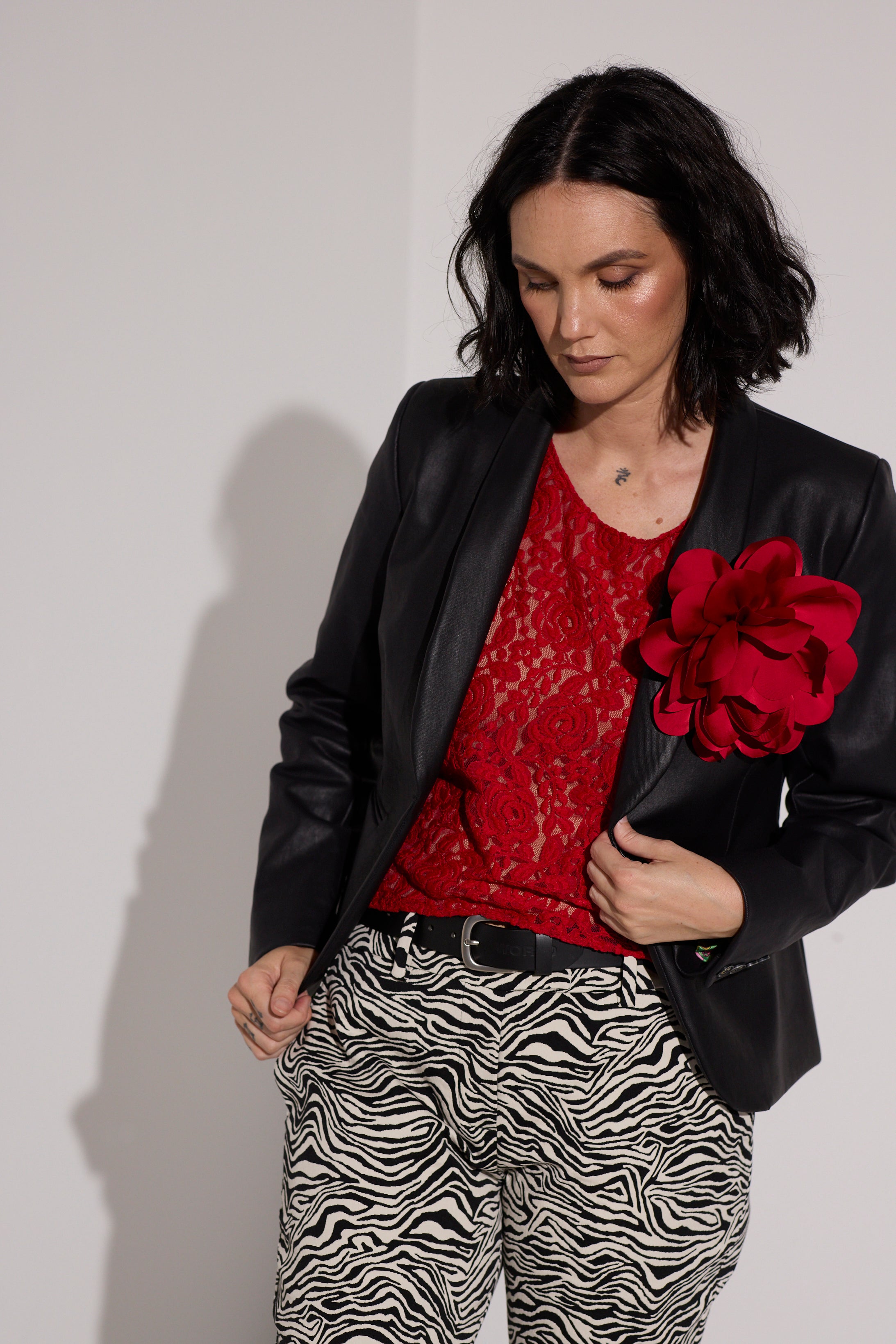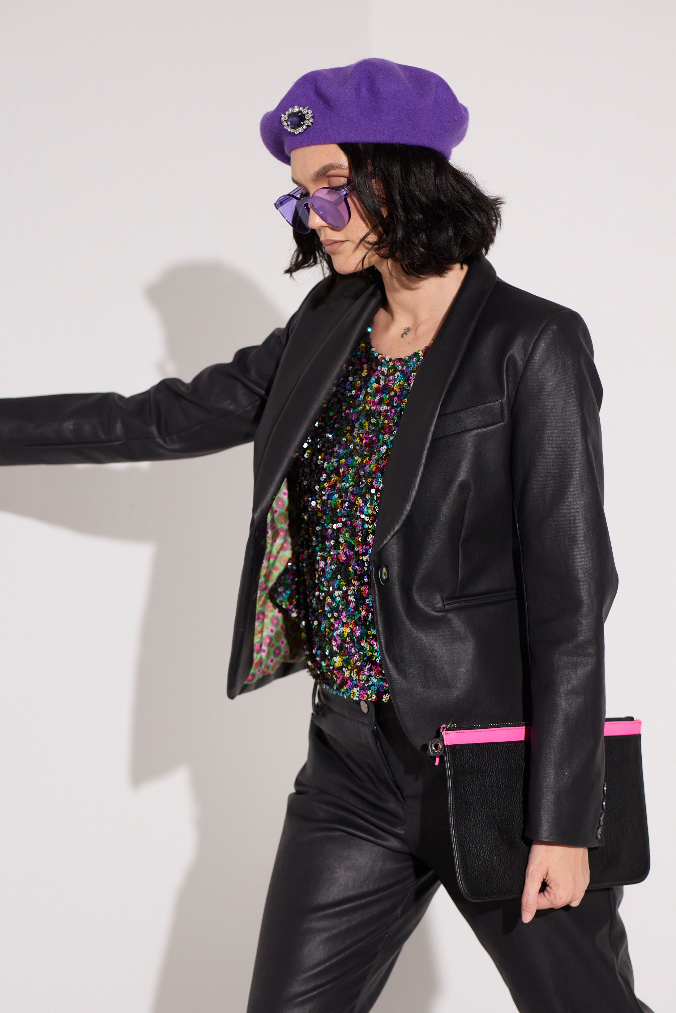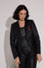 Formal fun...a tailored and elegant styled cropped blazer with a shawl lapel cut from coated denim with stretch that has a leather look and unique texture. Structured and formally made for a tailored look with expression, fun and personality in mind!