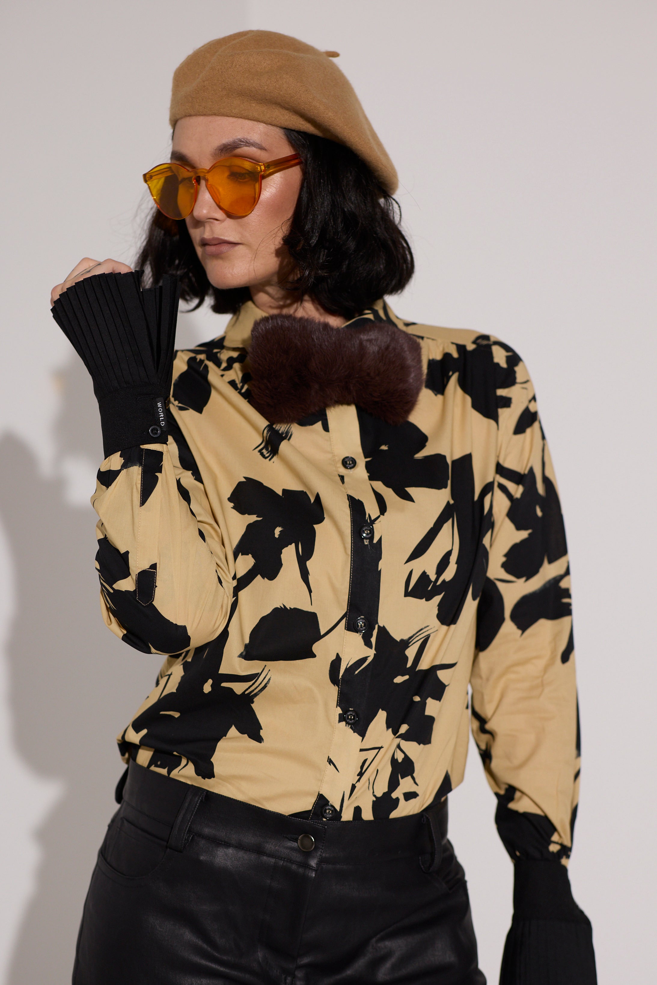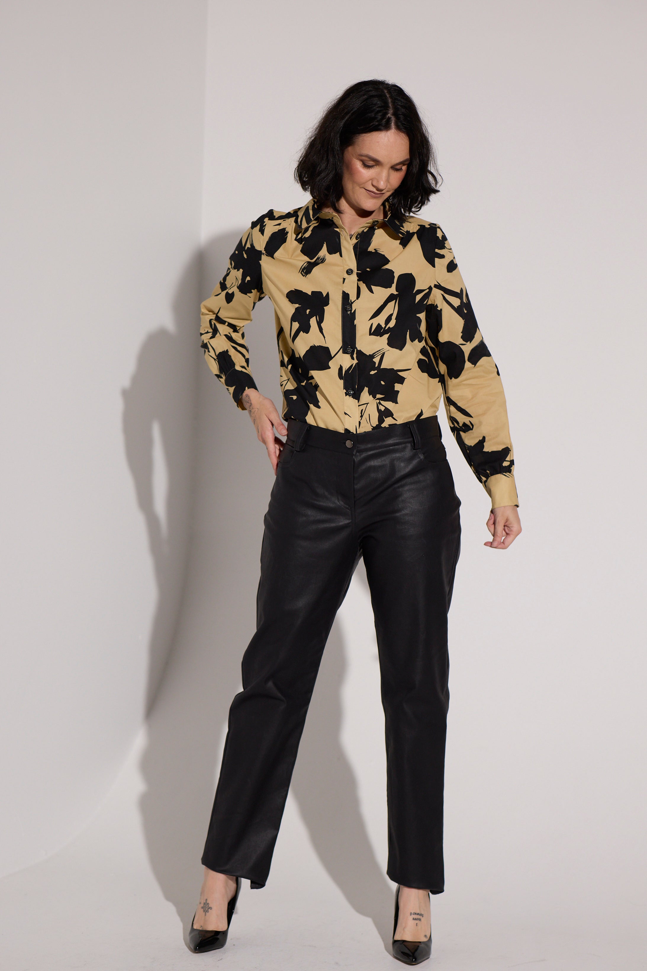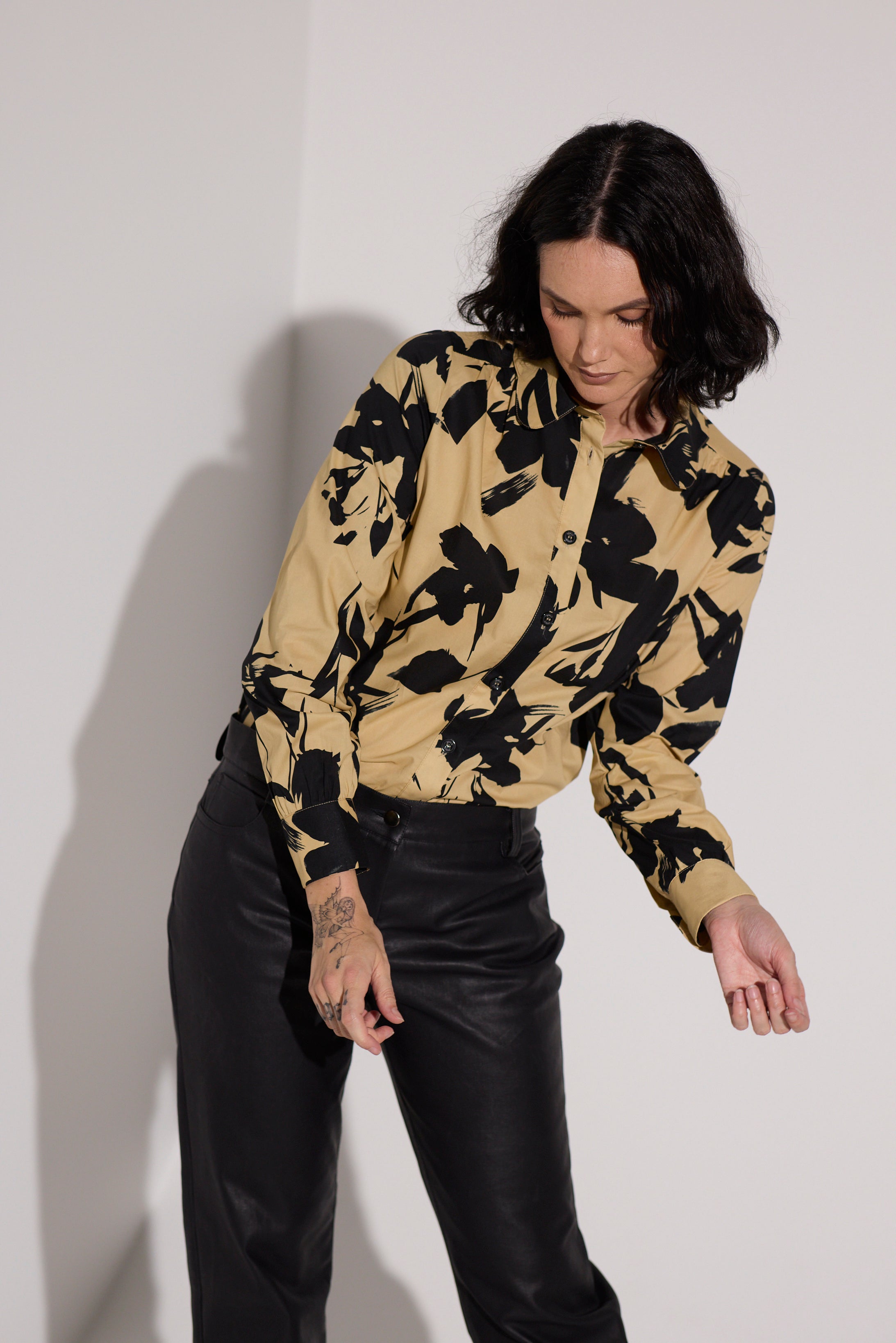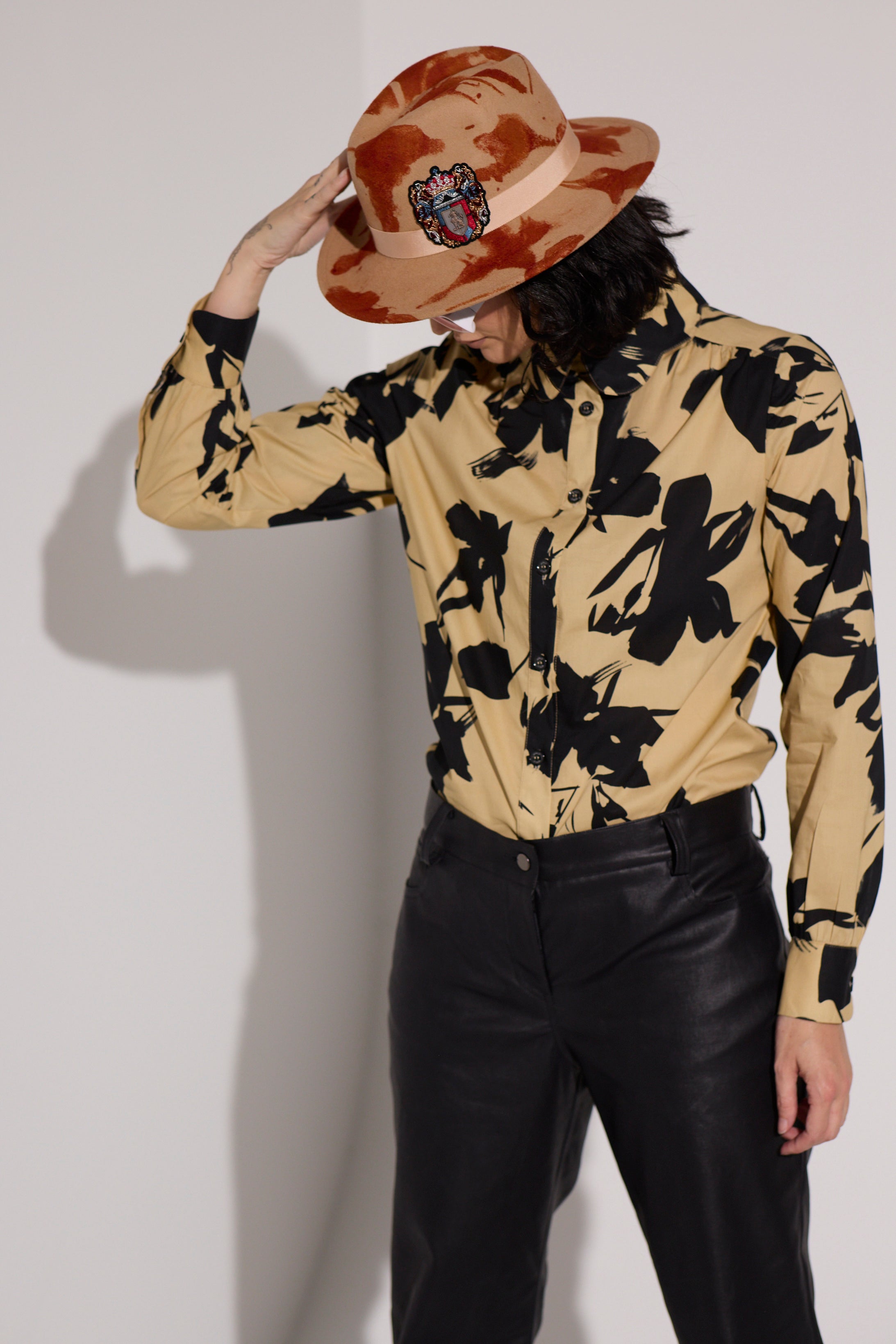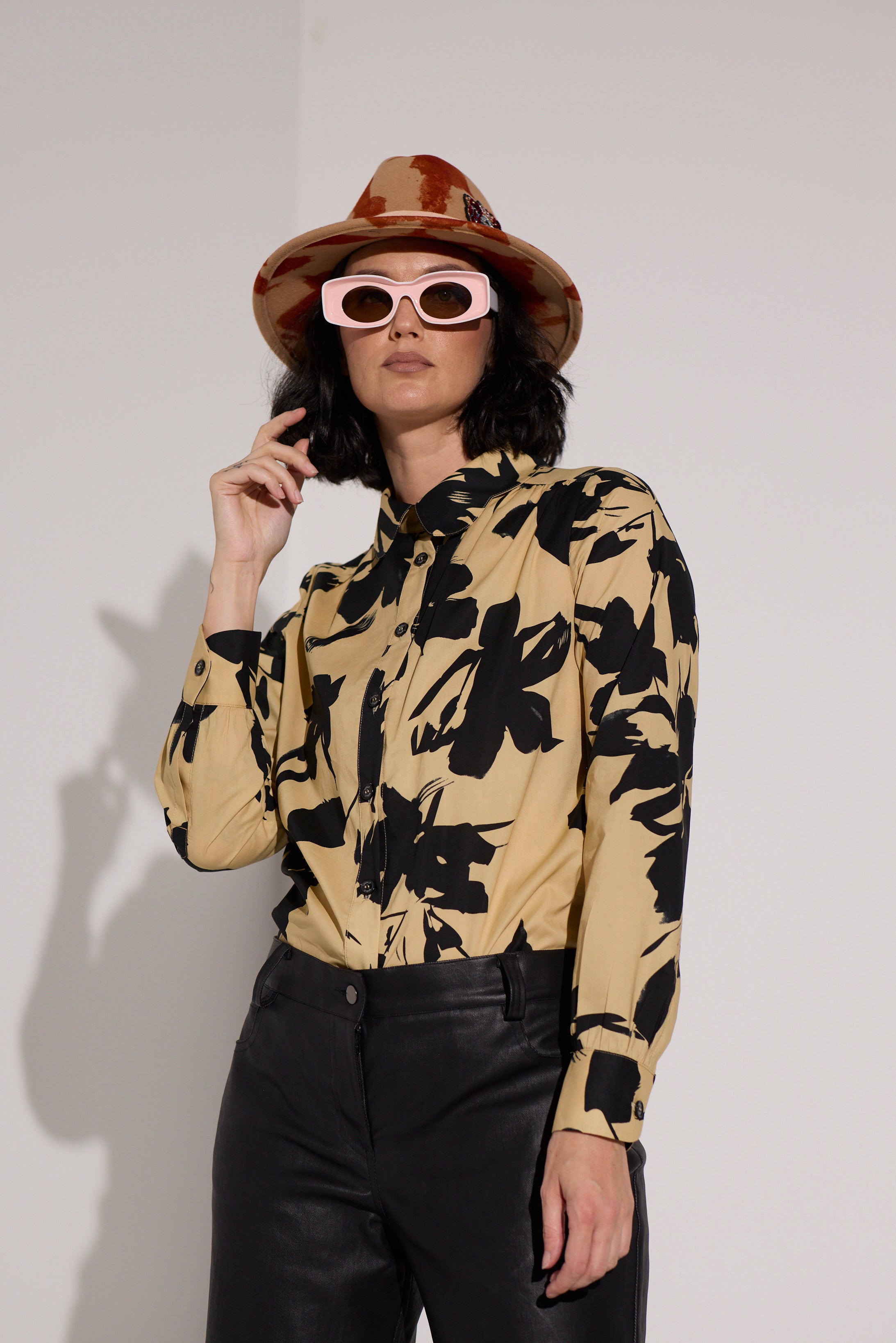 WORLD 5613 Peplos Shirt Tan Black Painterly Floral