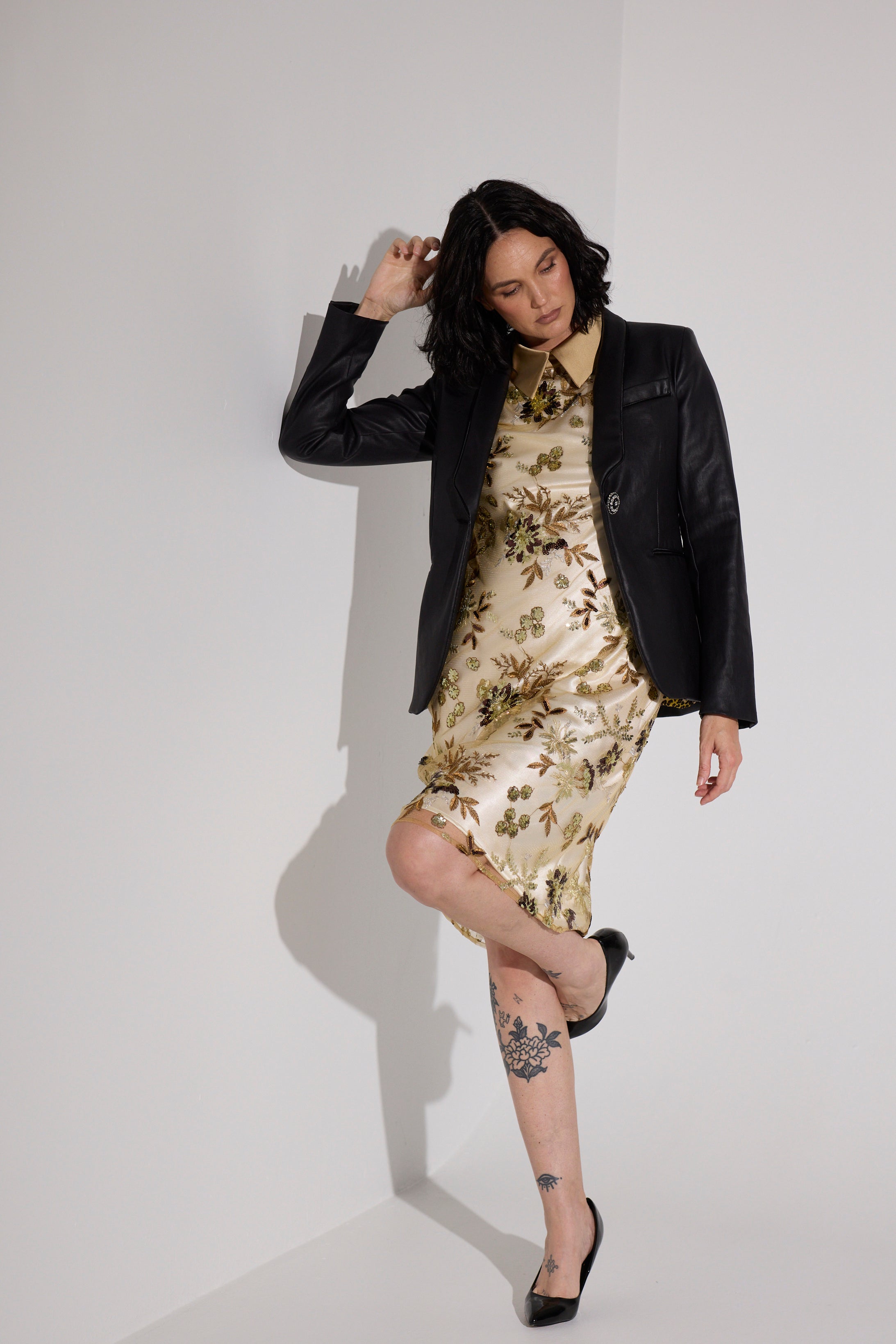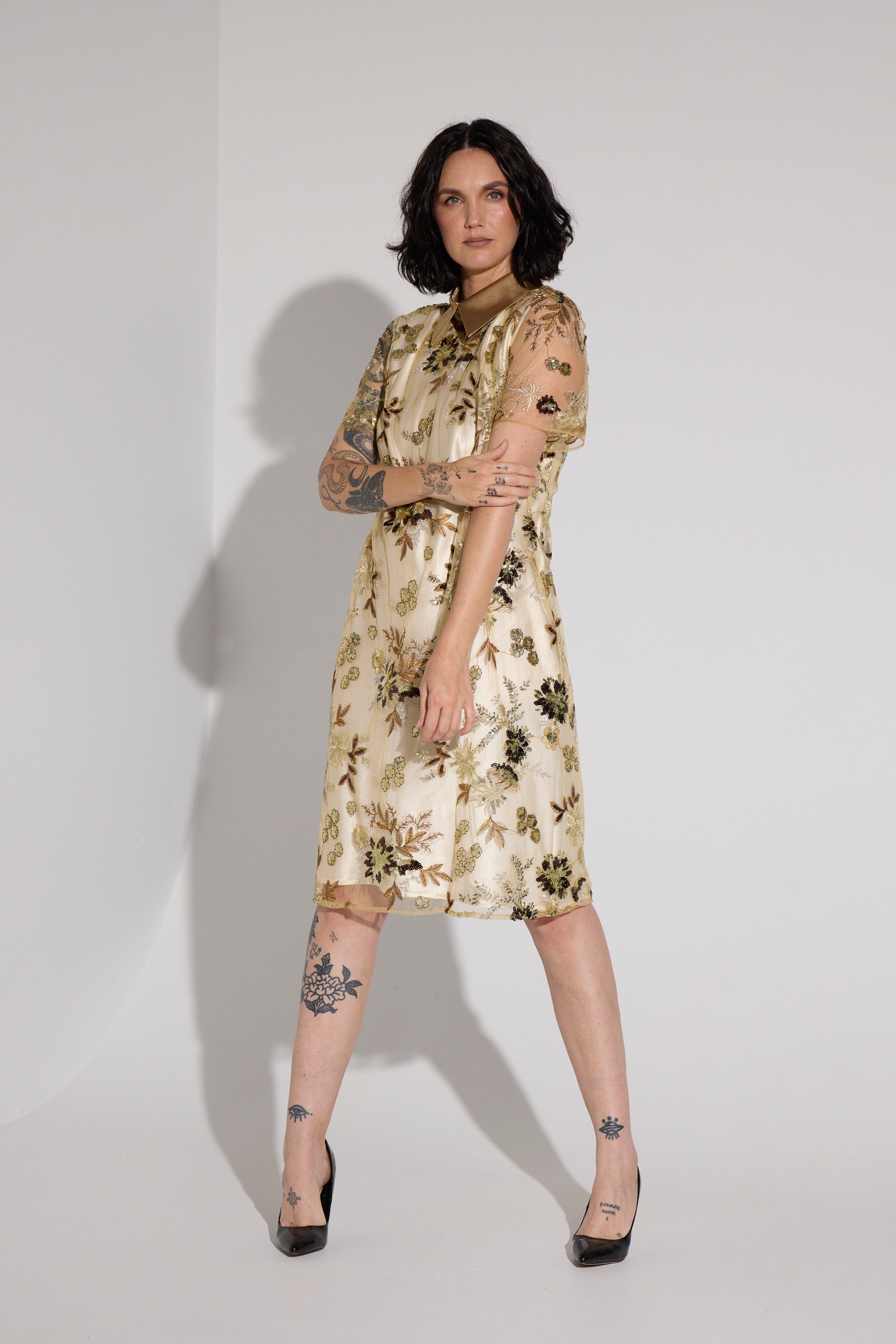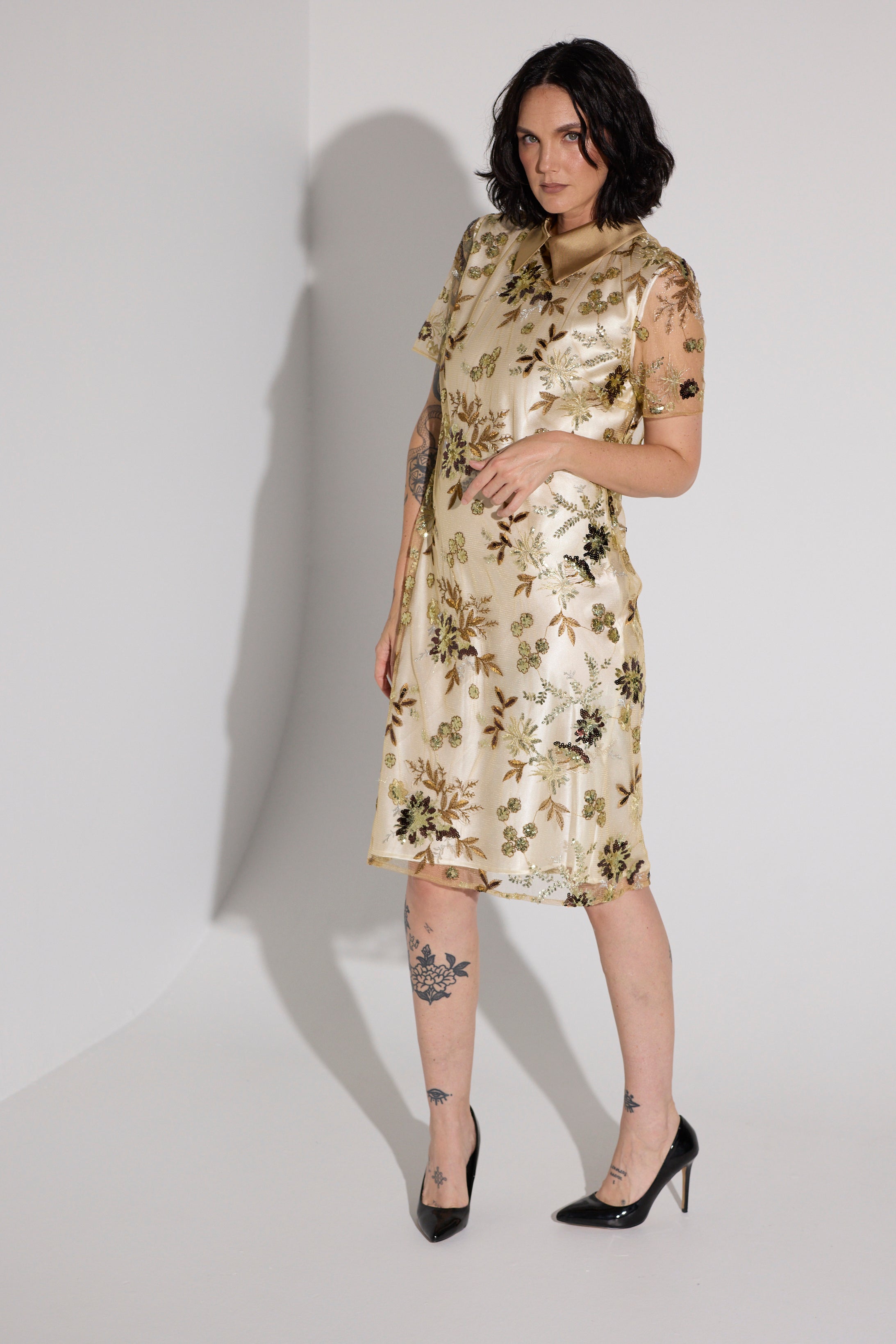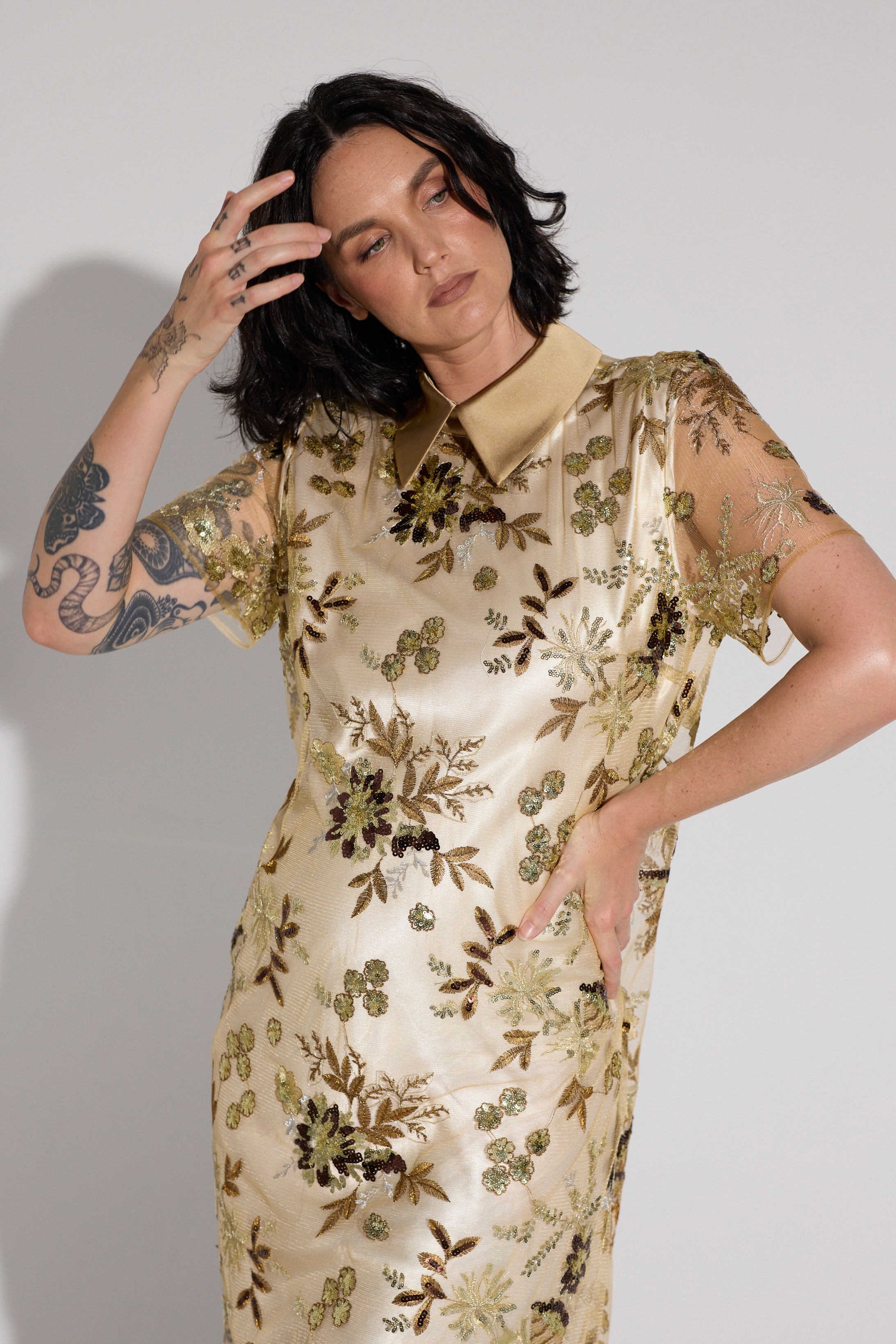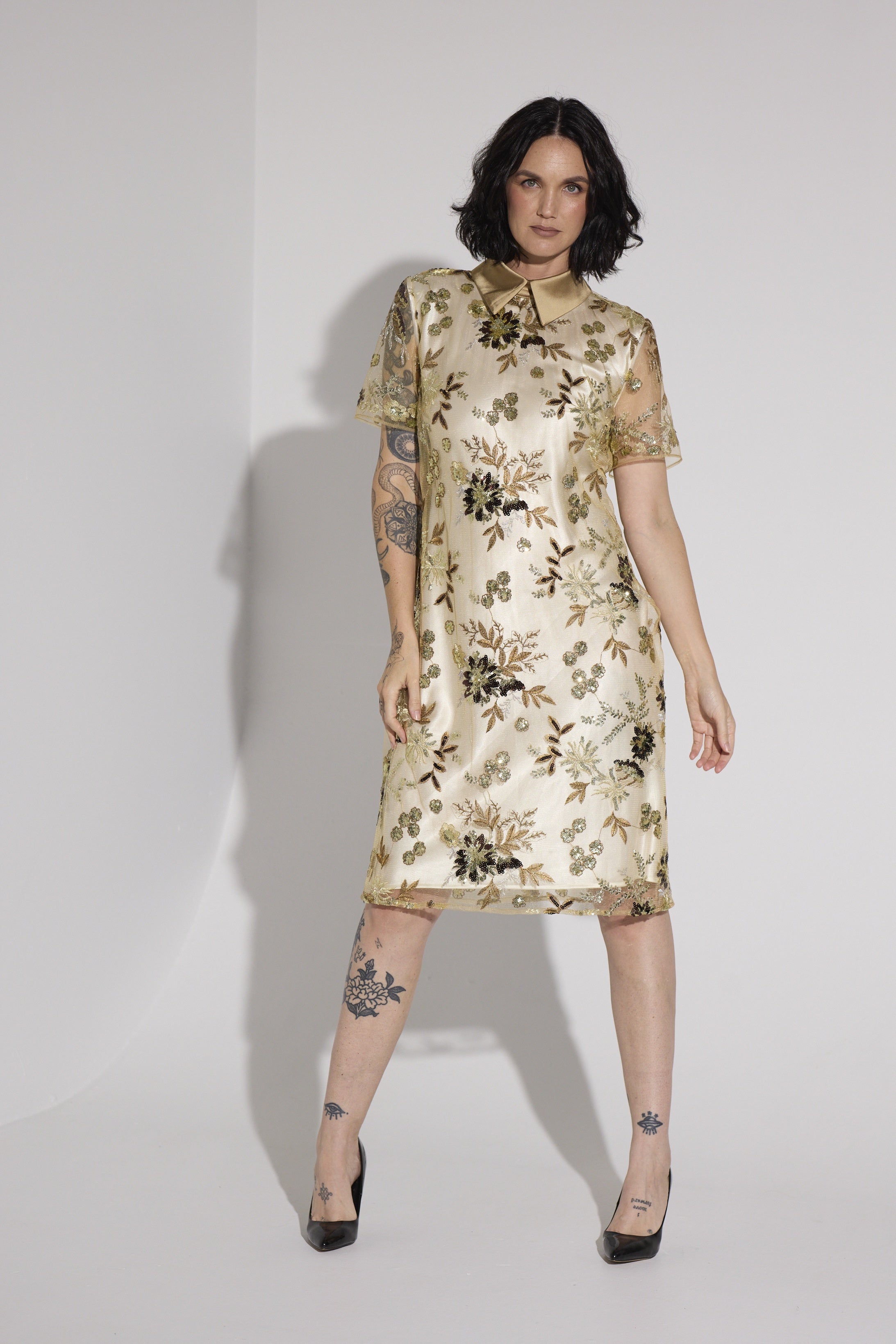 Style: Cut from a one-of-a-kind sequin mesh and lined in a silky satin, this collared shaped short sleeve dress is formal and elegant with an ease of shape.