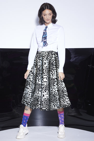 LIMITED TO 8 GARMENTS Style: A skirt with personality and punch, an exaggerated front panel of 4 box pleats in an A-Line shape with elasticated bac...