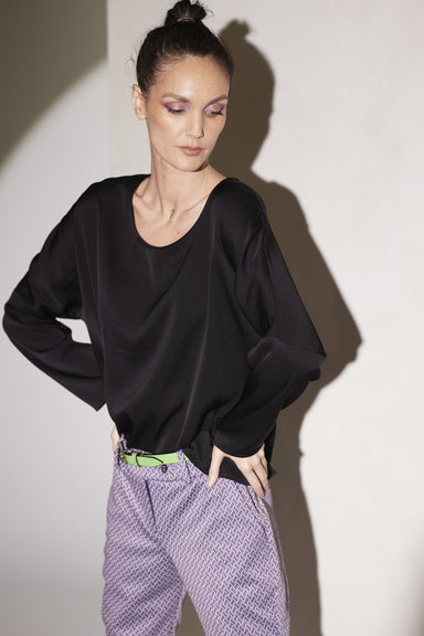 Style: Relaxed fit, crew neck long sleeve t-shirt slightly shortened and in only two sizes as designed to wear loose and draping Fabric: Silk Twill...