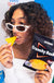 Pair of socks shaped as a bag of BBQ nachos.