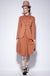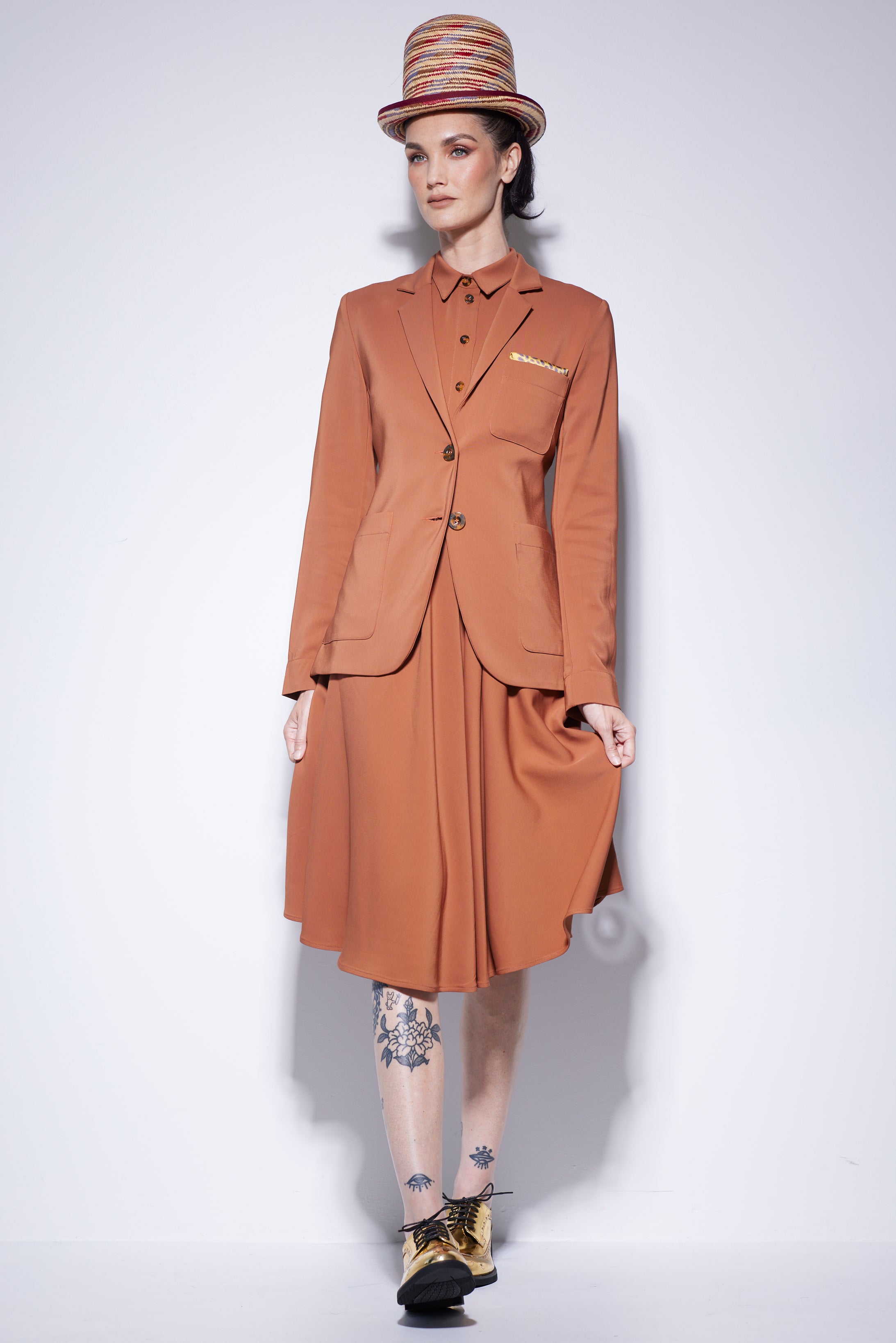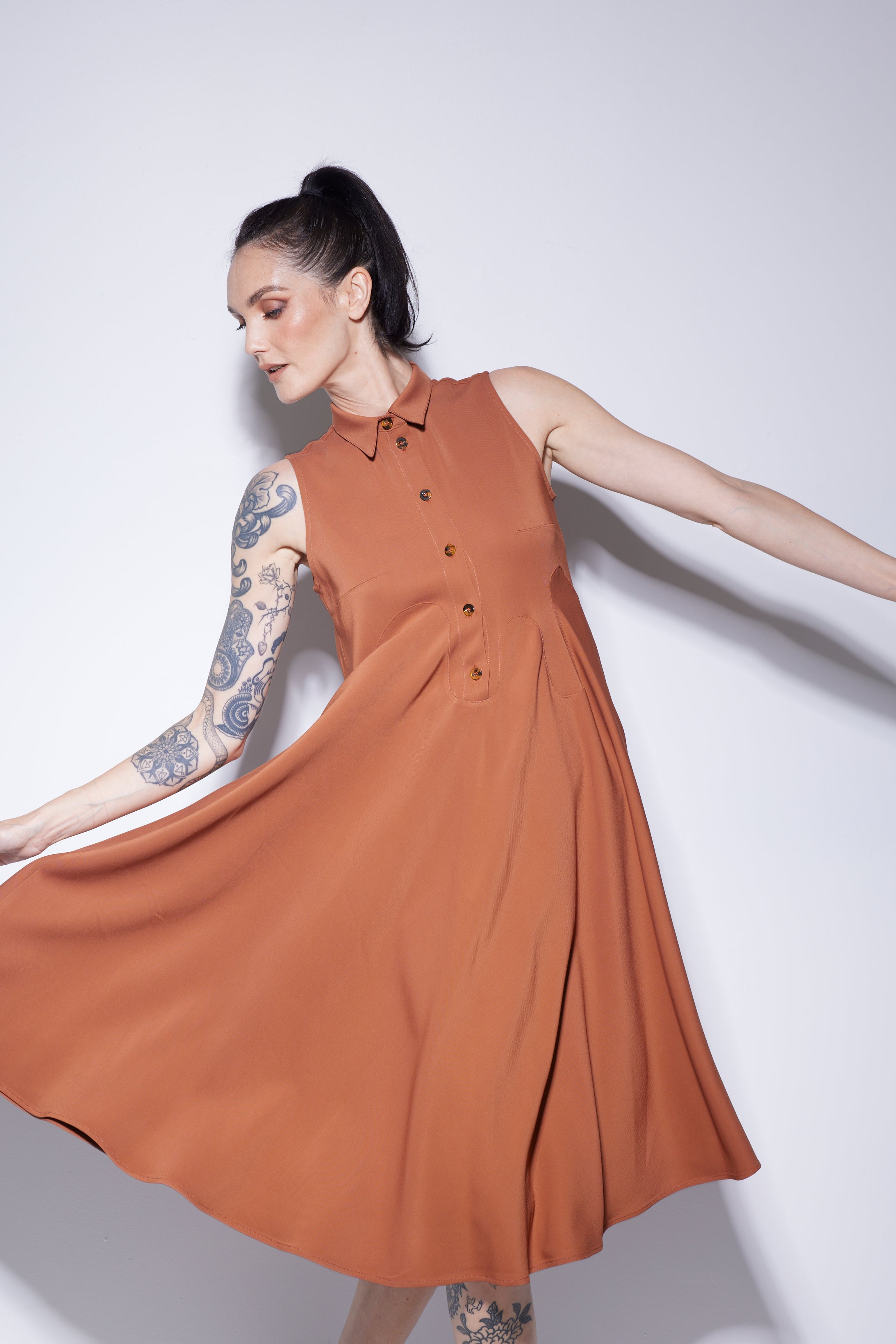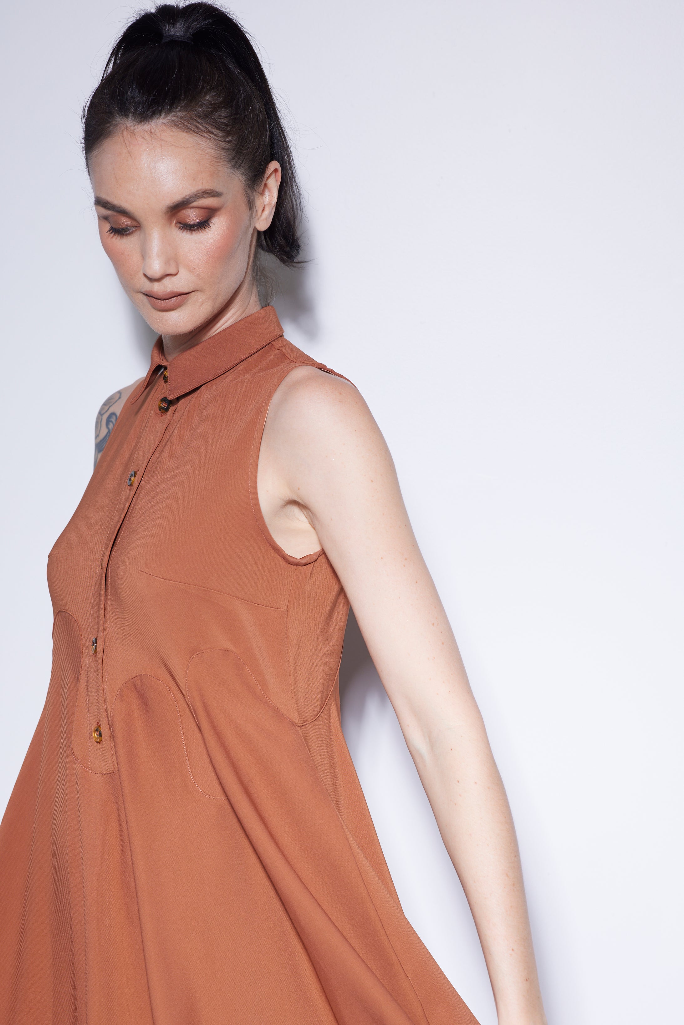 Style: Shirt collar and front placket which leads to a wave waist which creates an elegant draping skirt of the dress. Cut in a floating twill stretch cloth.