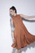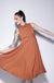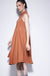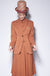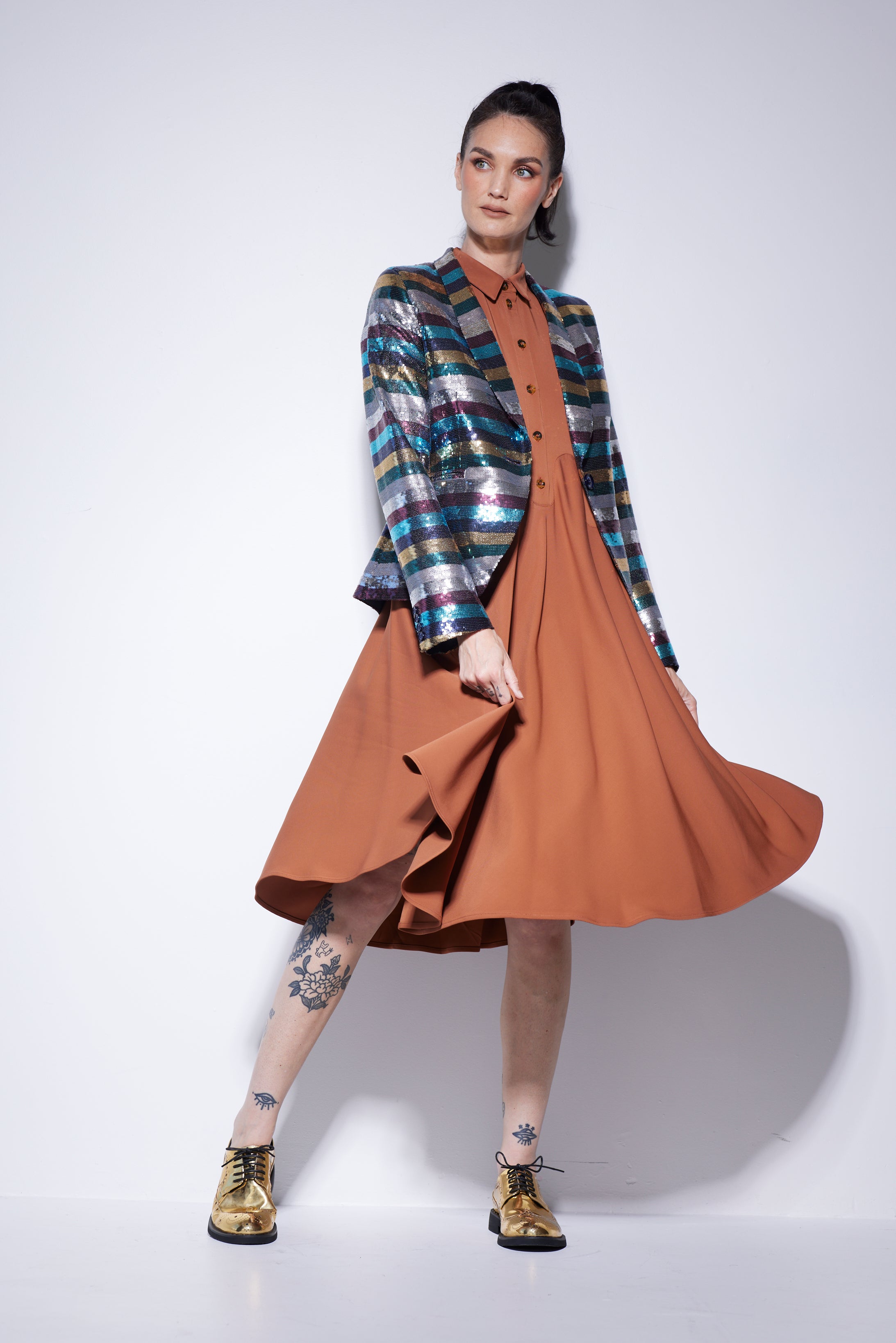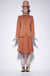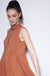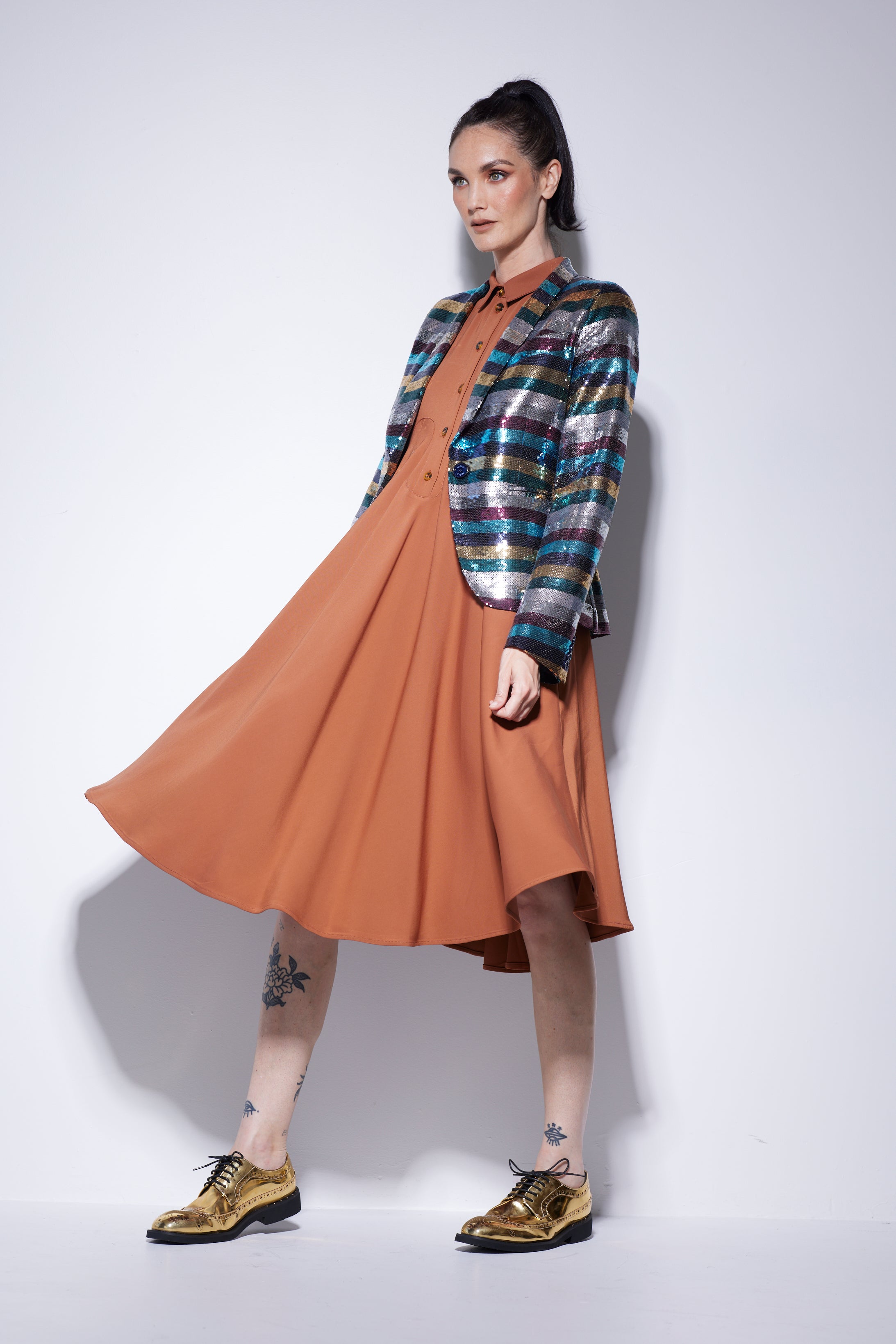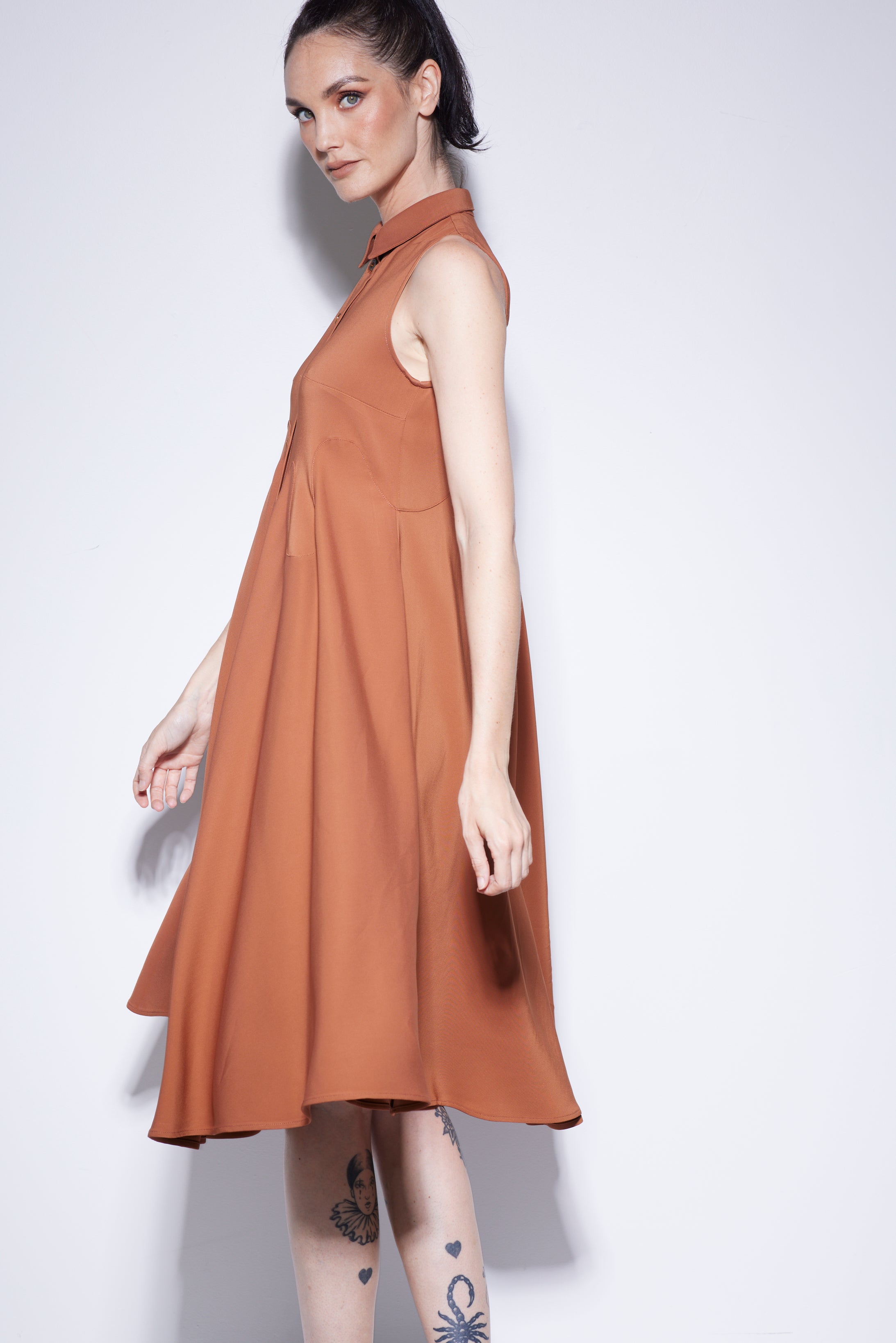 Style: Shirt collar and front placket which leads to a wave waist which creates an elegant draping skirt of the dress. Cut in a floating twill stretch cloth.