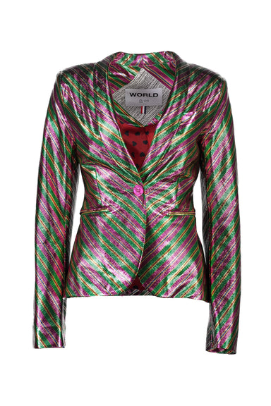 A classically shaped and styled single breasted blazer, two buttons with a double vent, cut from a electric metallic stripe. Turn up the volume on ...