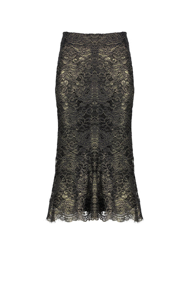 A tulip fitting trumpet skirt that sits high on the true waist and floats down to to the calf. A dense and formal golden lace skirt shaped to your ...
