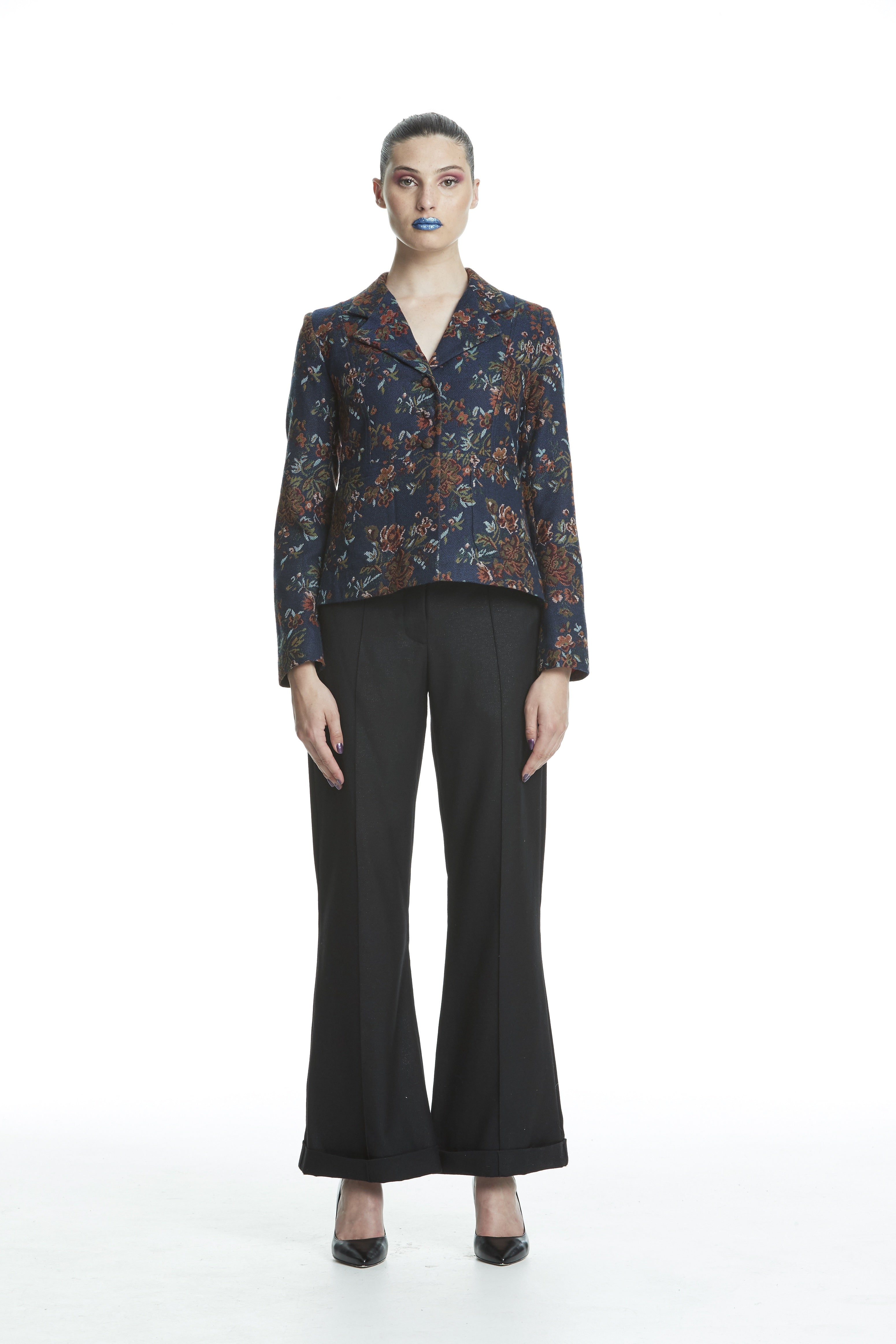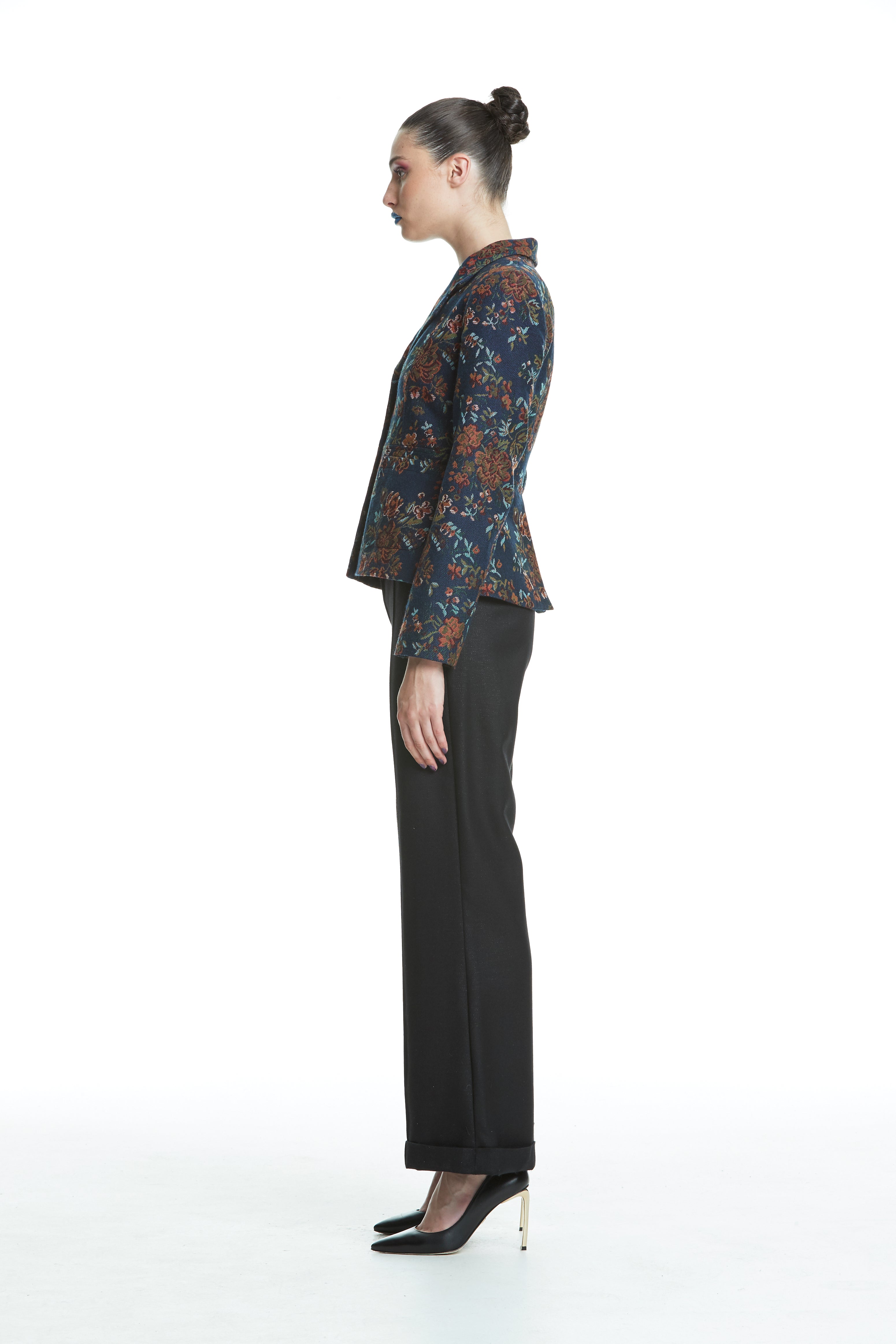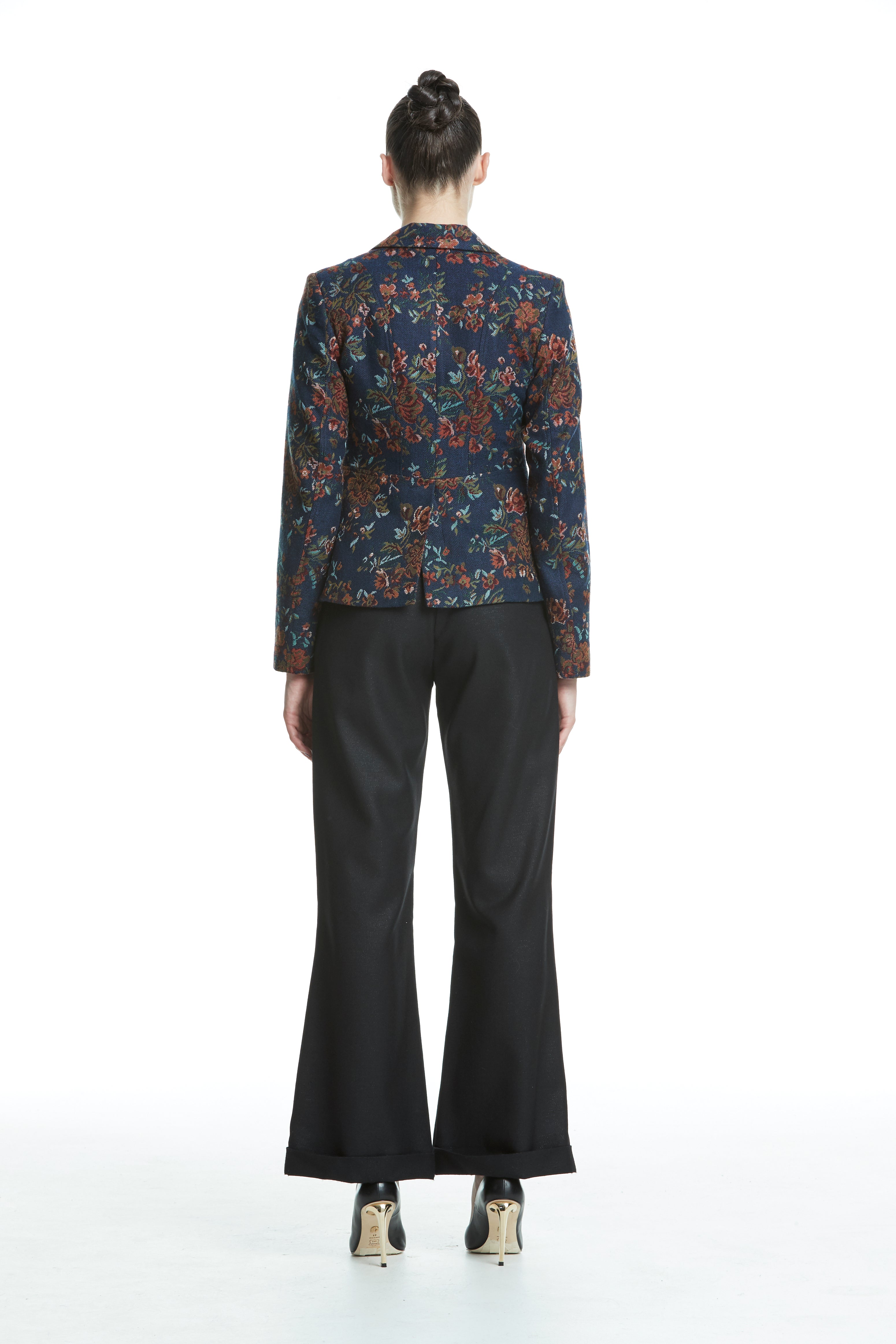 This formal blazer creates a serious but relaxed silhouette, three small buttons and a peplum allow the cloth plenty of room to fall gracefully. An elegant attire for the the desk or the boardroom with a little colour and texture. This is still an everyday suit that adds a little attitude to office life. A formal piece that will dress up any already already elegant outfit or dress.