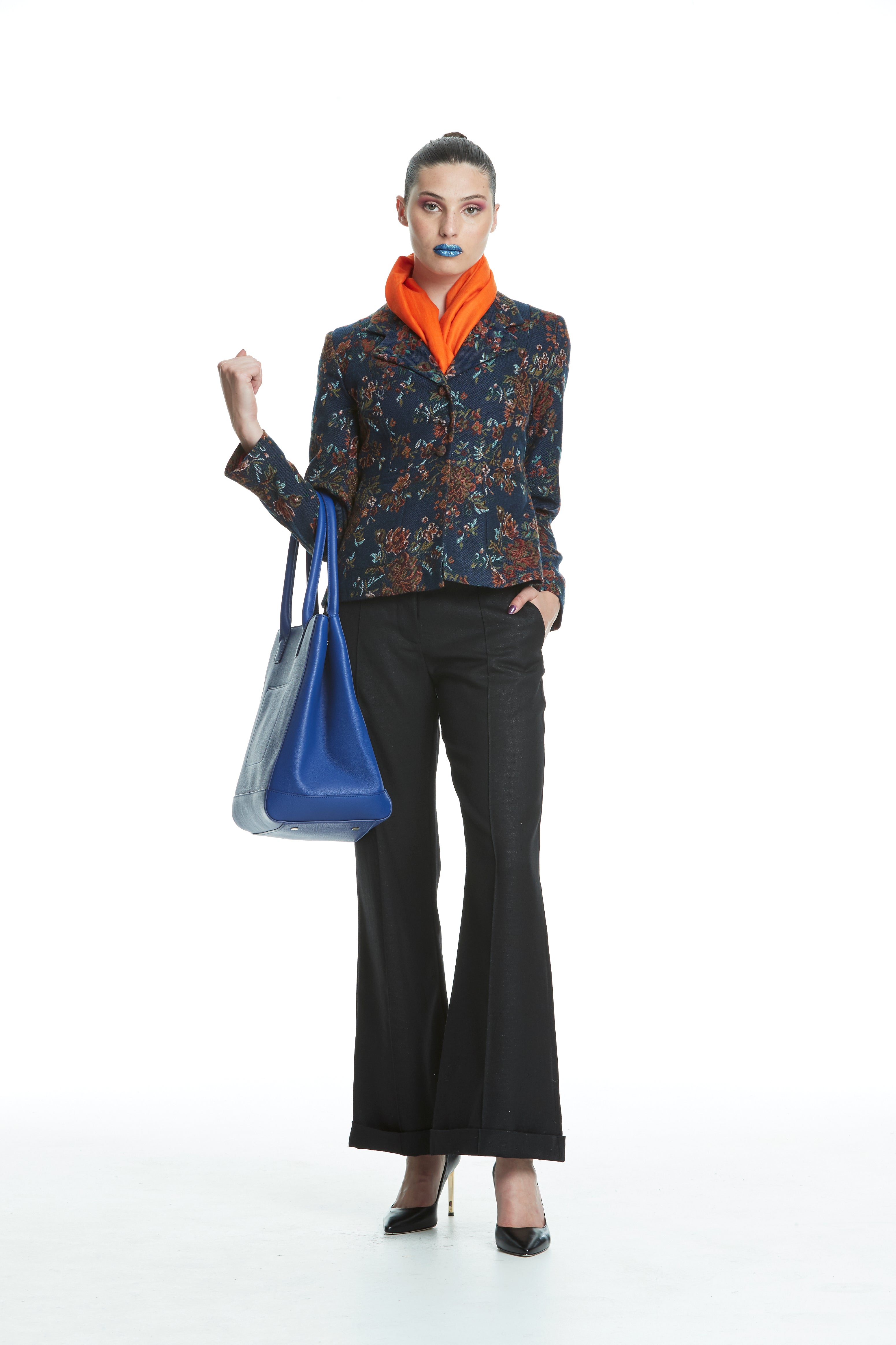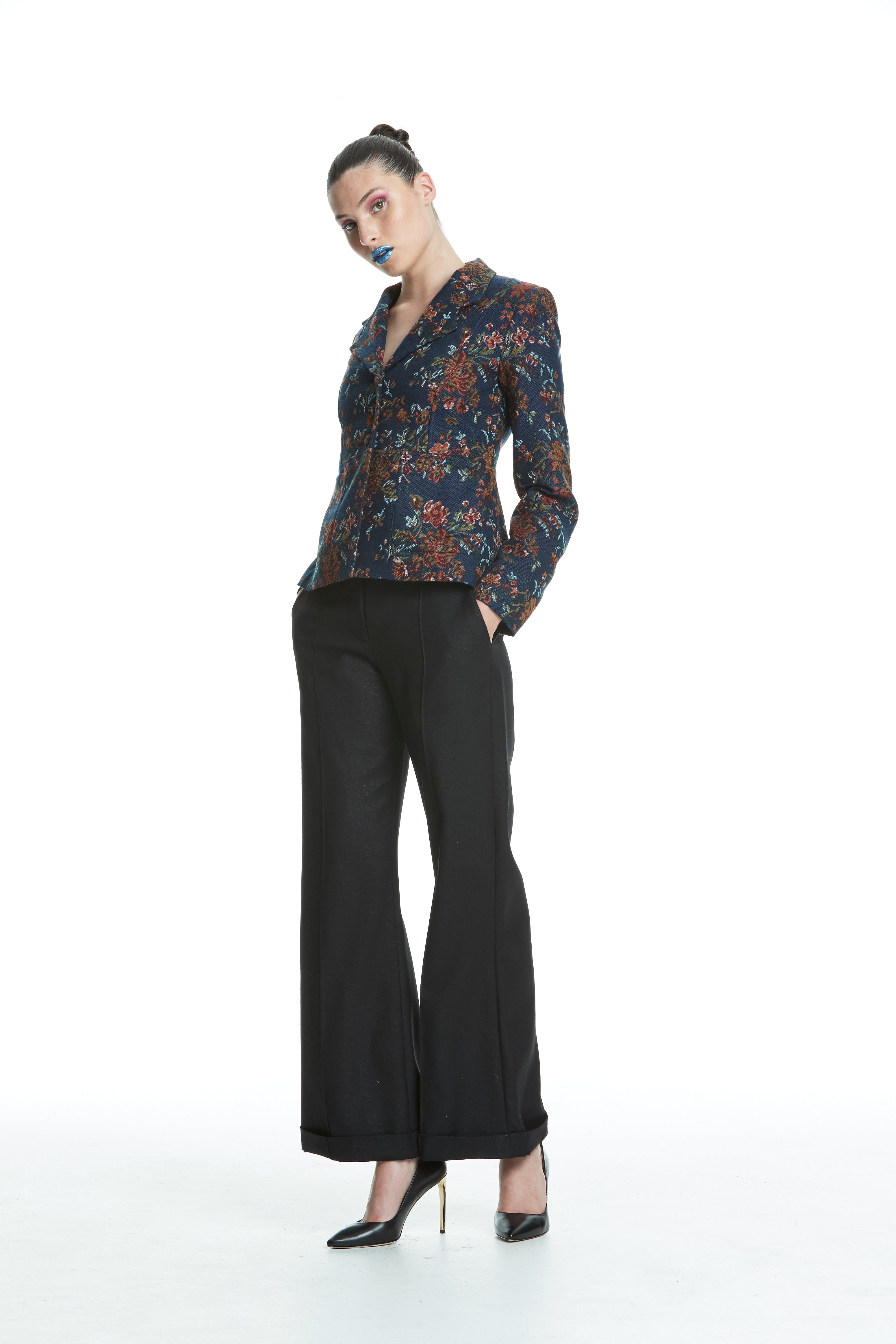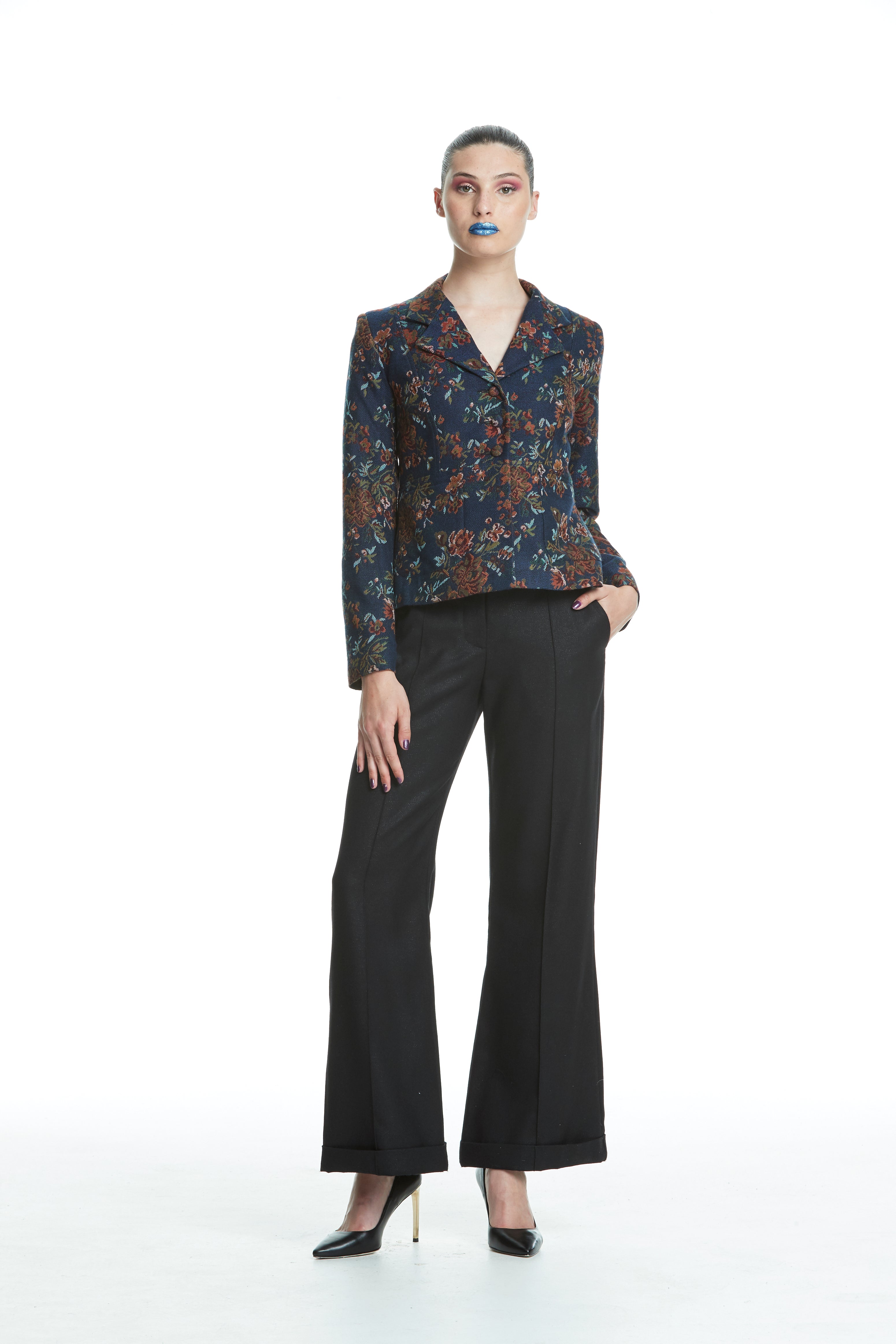 This formal blazer creates a serious but relaxed silhouette, three small buttons and a peplum allow the cloth plenty of room to fall gracefully. An elegant attire for the the desk or the boardroom with a little colour and texture. This is still an everyday suit that adds a little attitude to office life. A formal piece that will dress up any already already elegant outfit or dress.