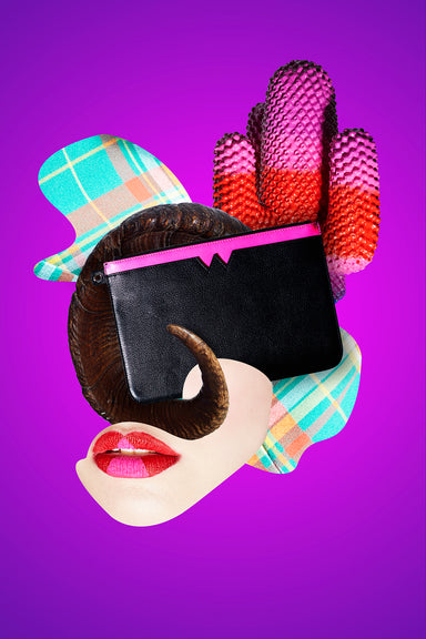 Black pebbled leather is contrasted by a hot pink pocket with the die cut ‘W’ on the exterior of this simple and sleek attaché. Lined in WORLD’s si...