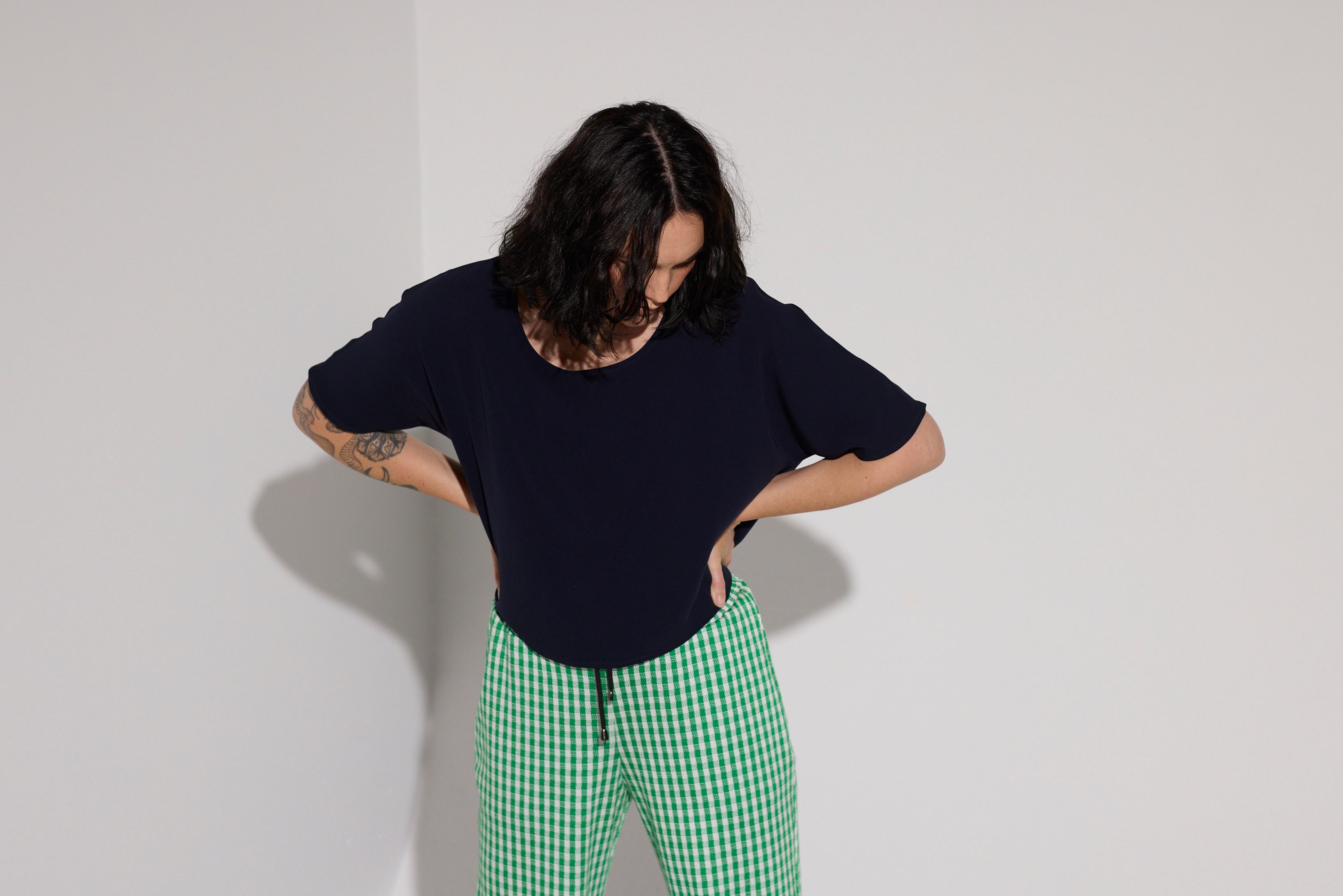Style: Relaxed fit, 2 piece crew neck t-shirt slightly shortened and in only two sizes as designed to wear loose and draping