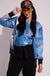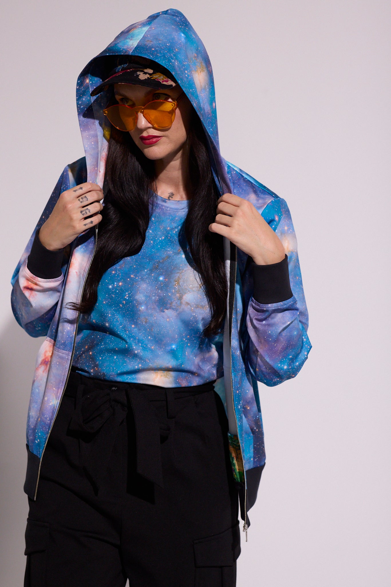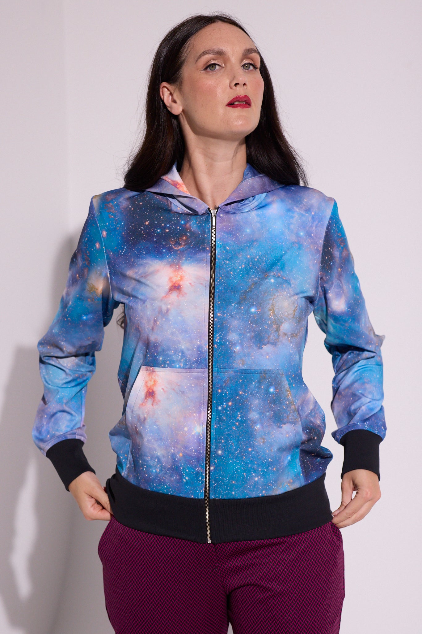 Style: Slouched and relaxed, a dressed up, zip-up hoodie with front patch pockets cut from a soft touch knit stretch printed with the galaxy.