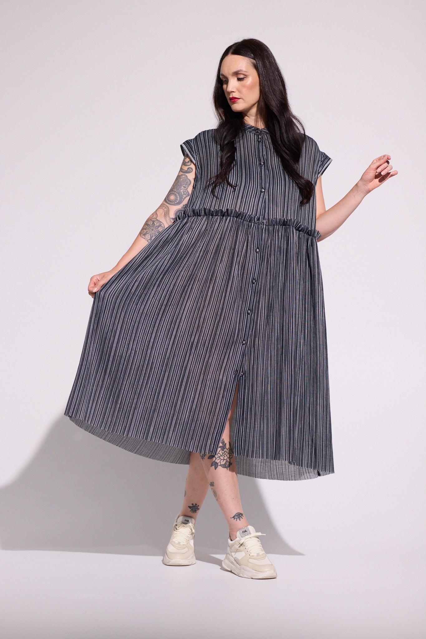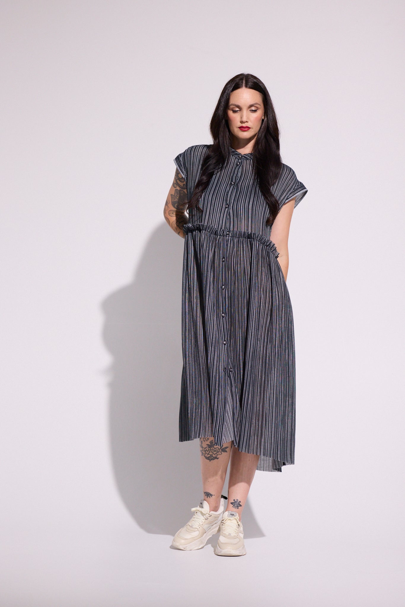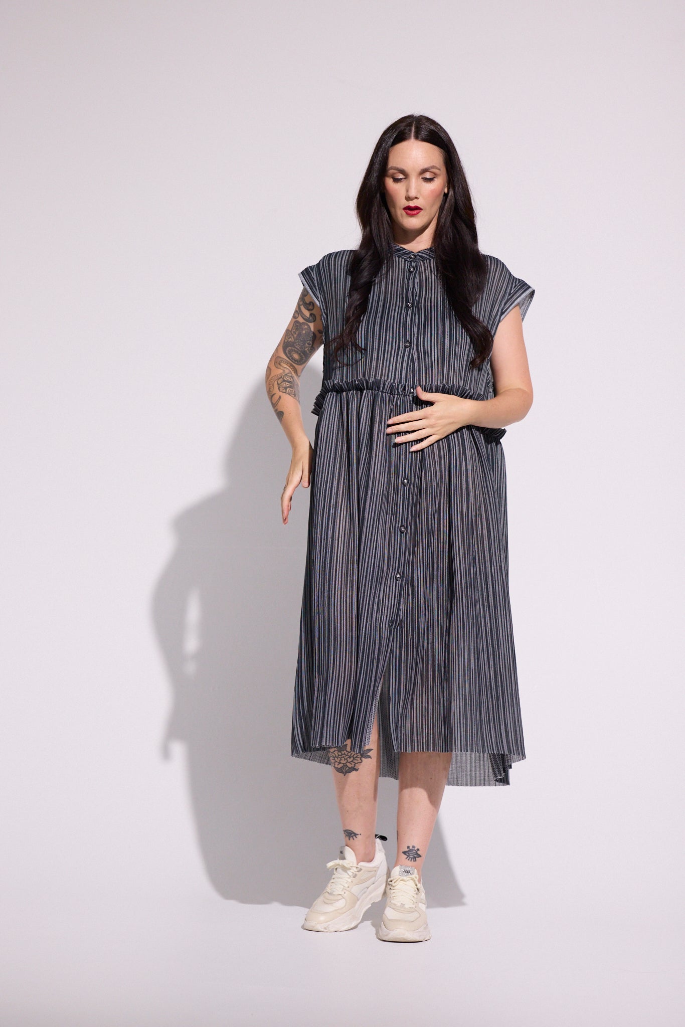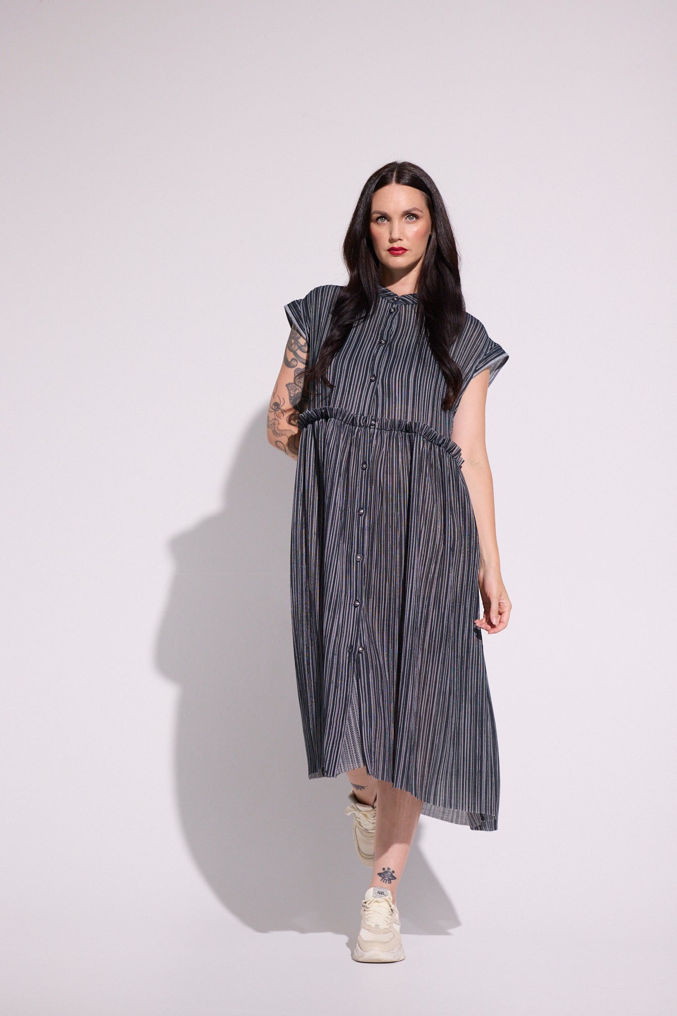 Style: Cut from a unique pre-pleated soft and lightweight cloth with stretch. A shirt styled over-dress, roomy and relaxed this gracious piece is a layering tool with texture and elegance.