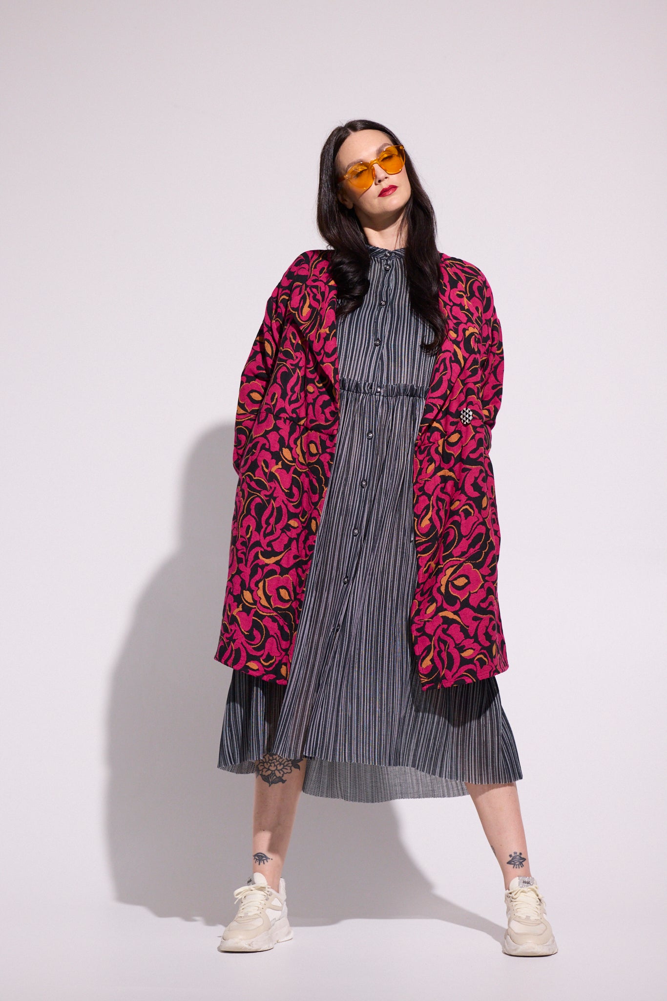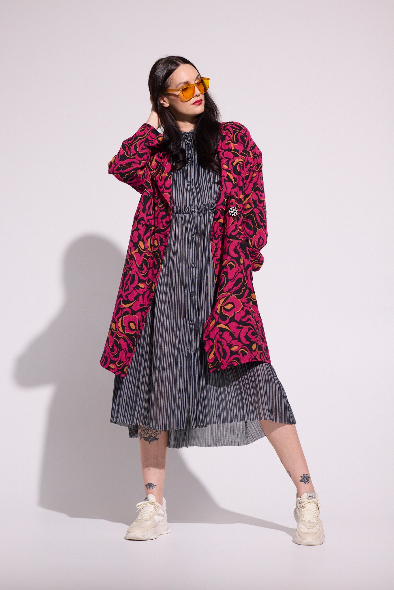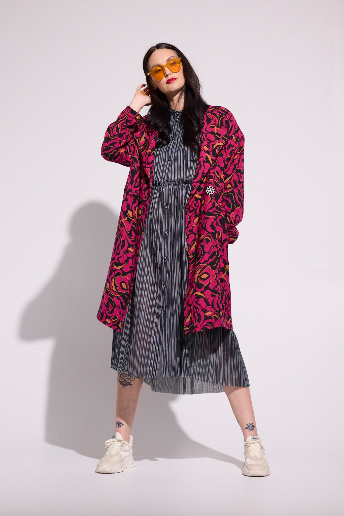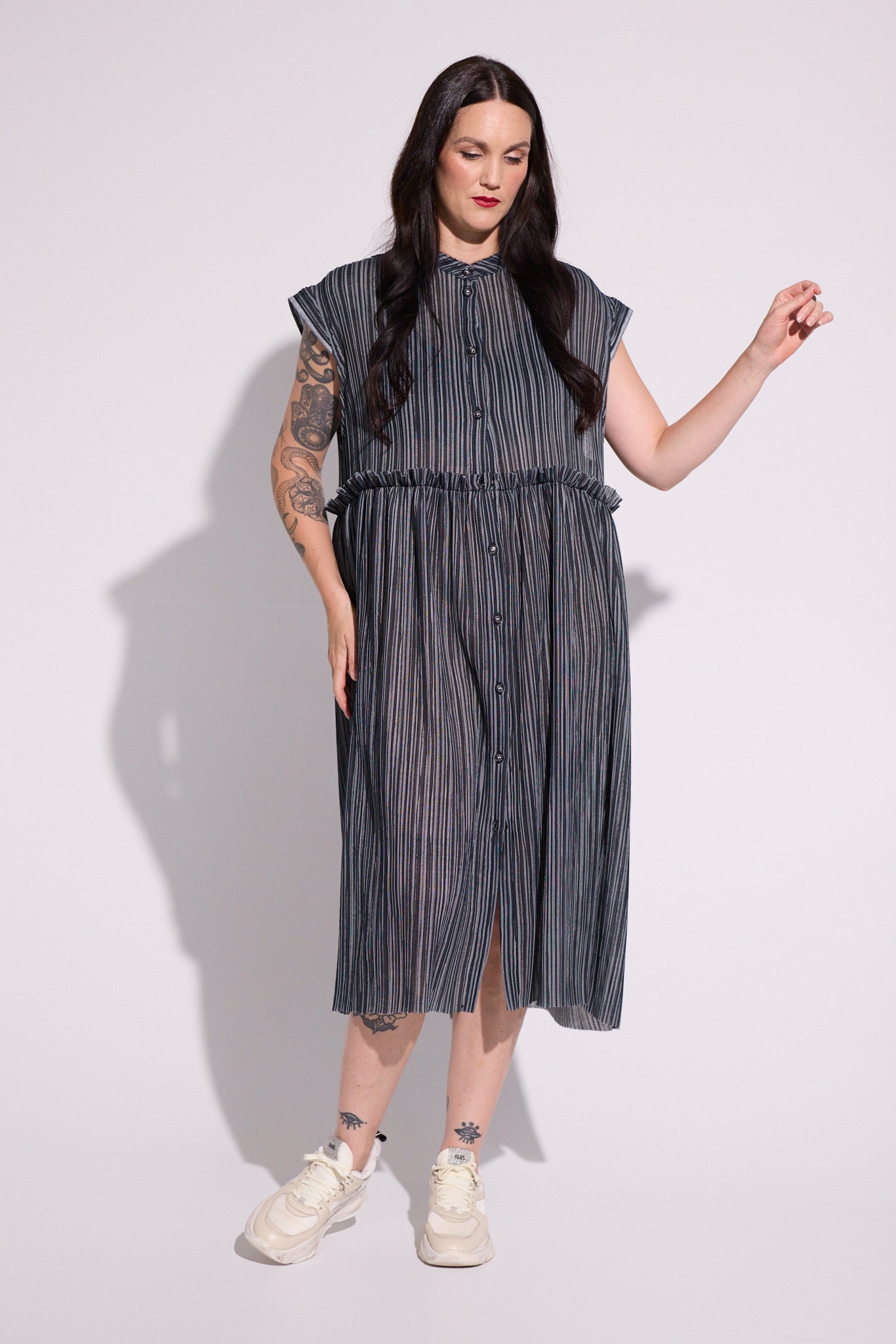 Style: Cut from a unique pre-pleated soft and lightweight cloth with stretch. A shirt styled over-dress, roomy and relaxed this gracious piece is a layering tool with texture and elegance.