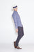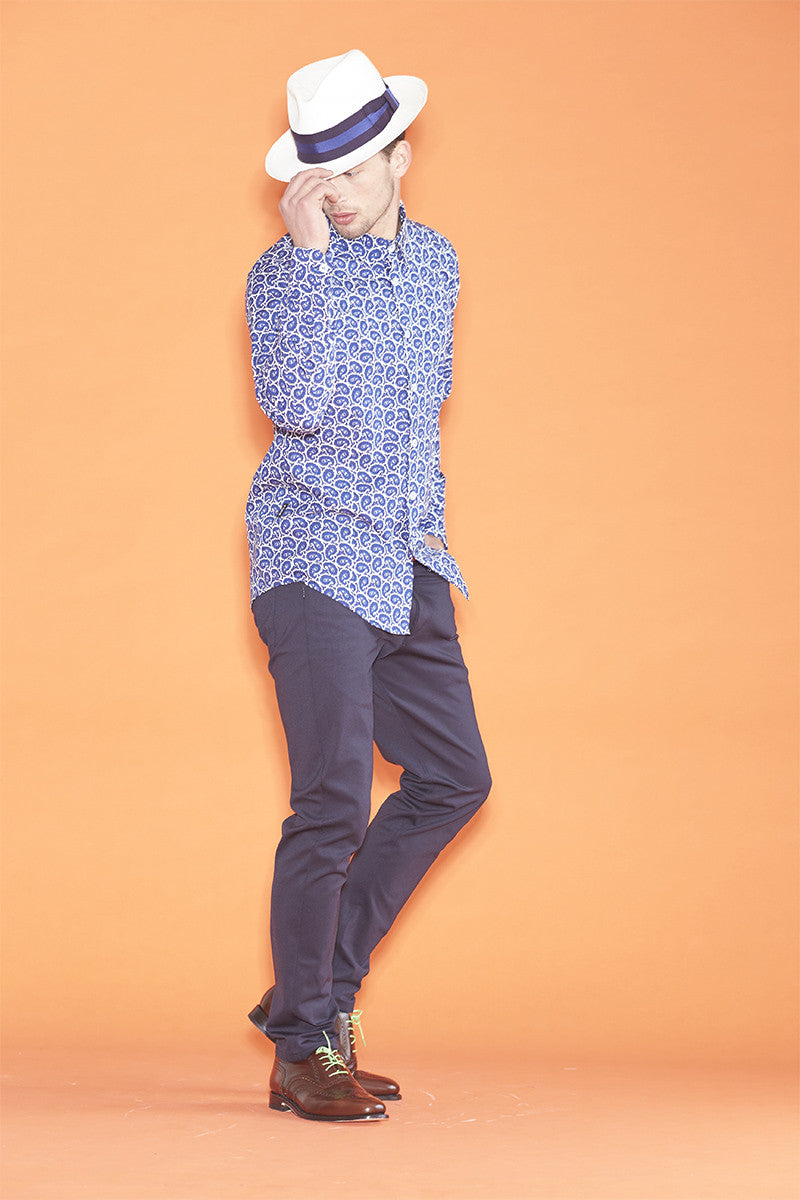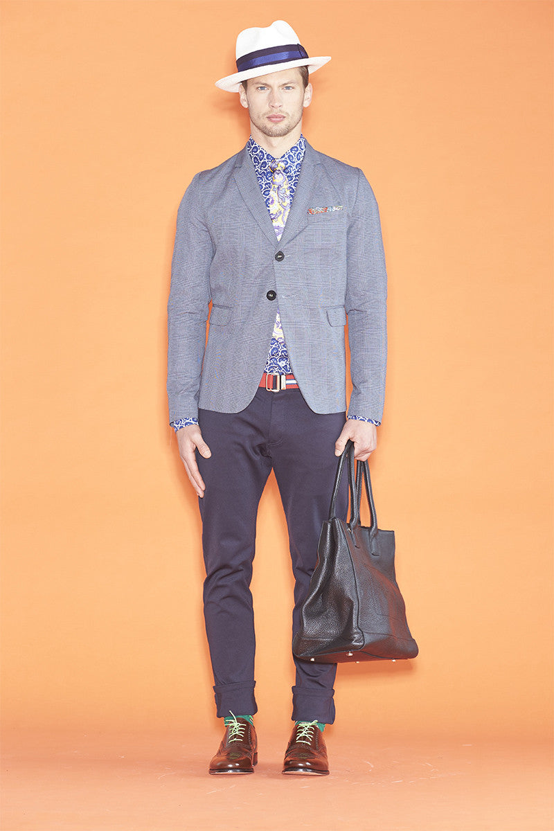 Going postal is an example of American slang which was used when someone starts to become extremely and uncontrollably angry, often to the point of violence and, usually in a workplace environment. The WORLD Going Postal jean is a slim fitting dressed up jean in a stretch cotton drill Olive and a weight navy knit fabrication.
