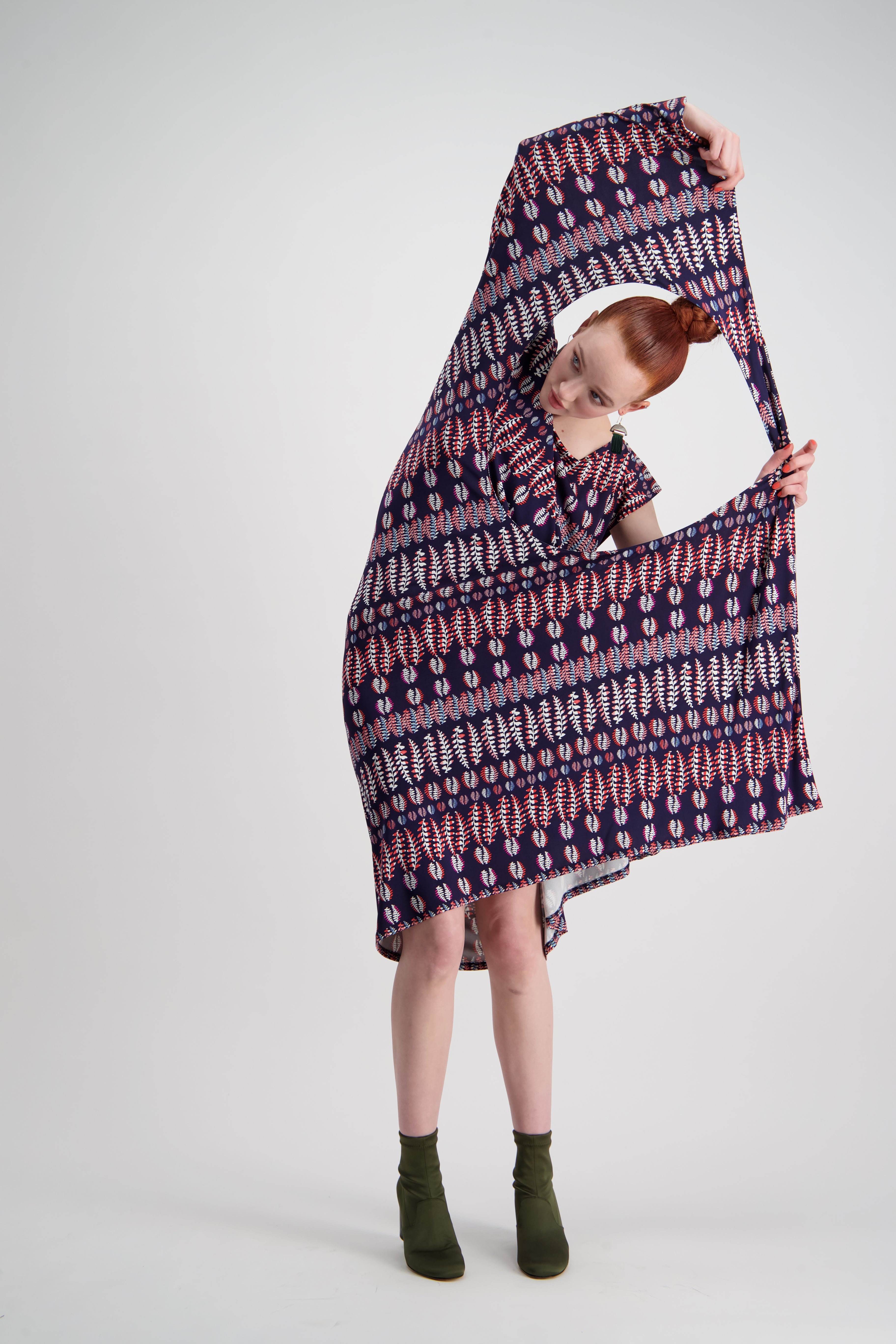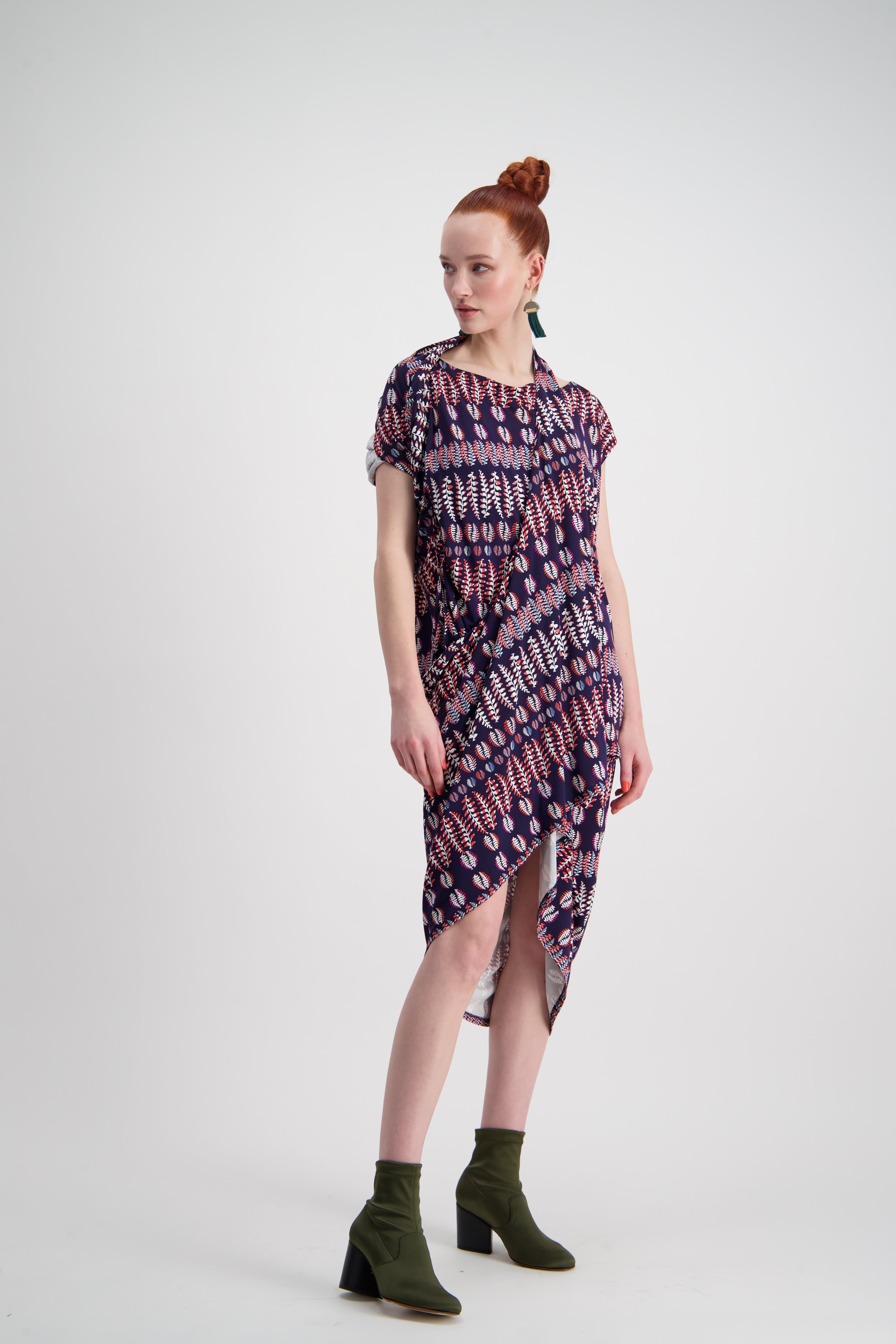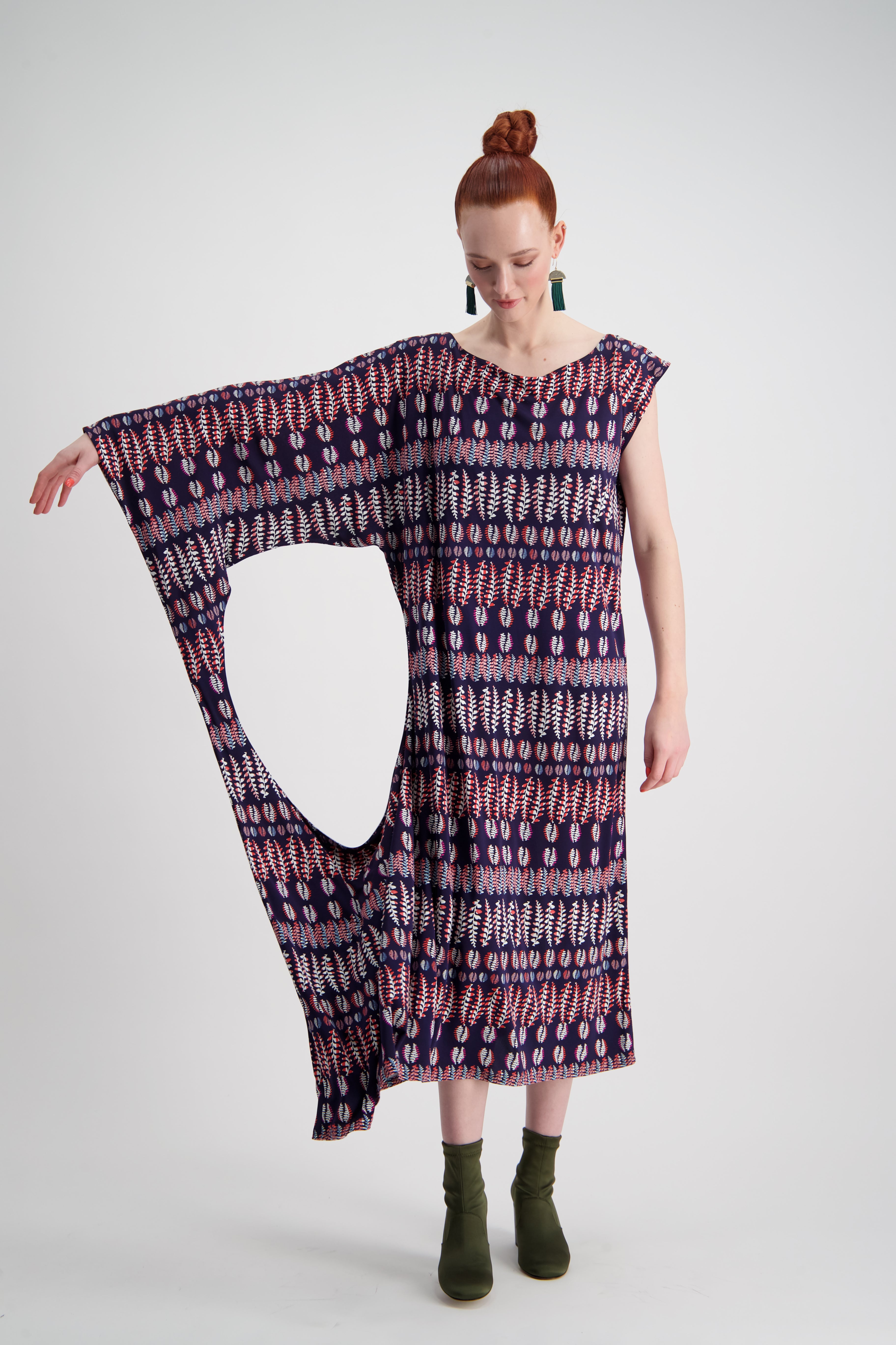 A WORLD concept piece classic. A dress that wears in two playful ways. Wear as a one sleeve draping shapeless dress, or hoop the circle over your head to create a grecian styled short gown. The knit fern fabrication provides a playful day dress that can easily turn to a elegant evening silhouette.