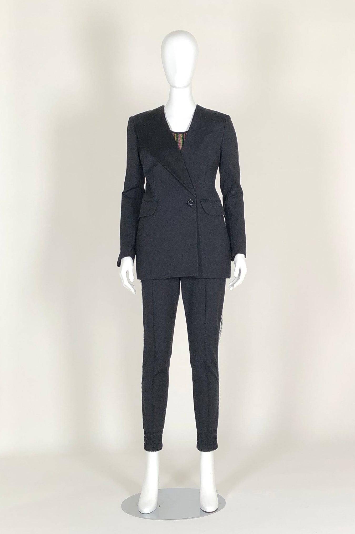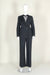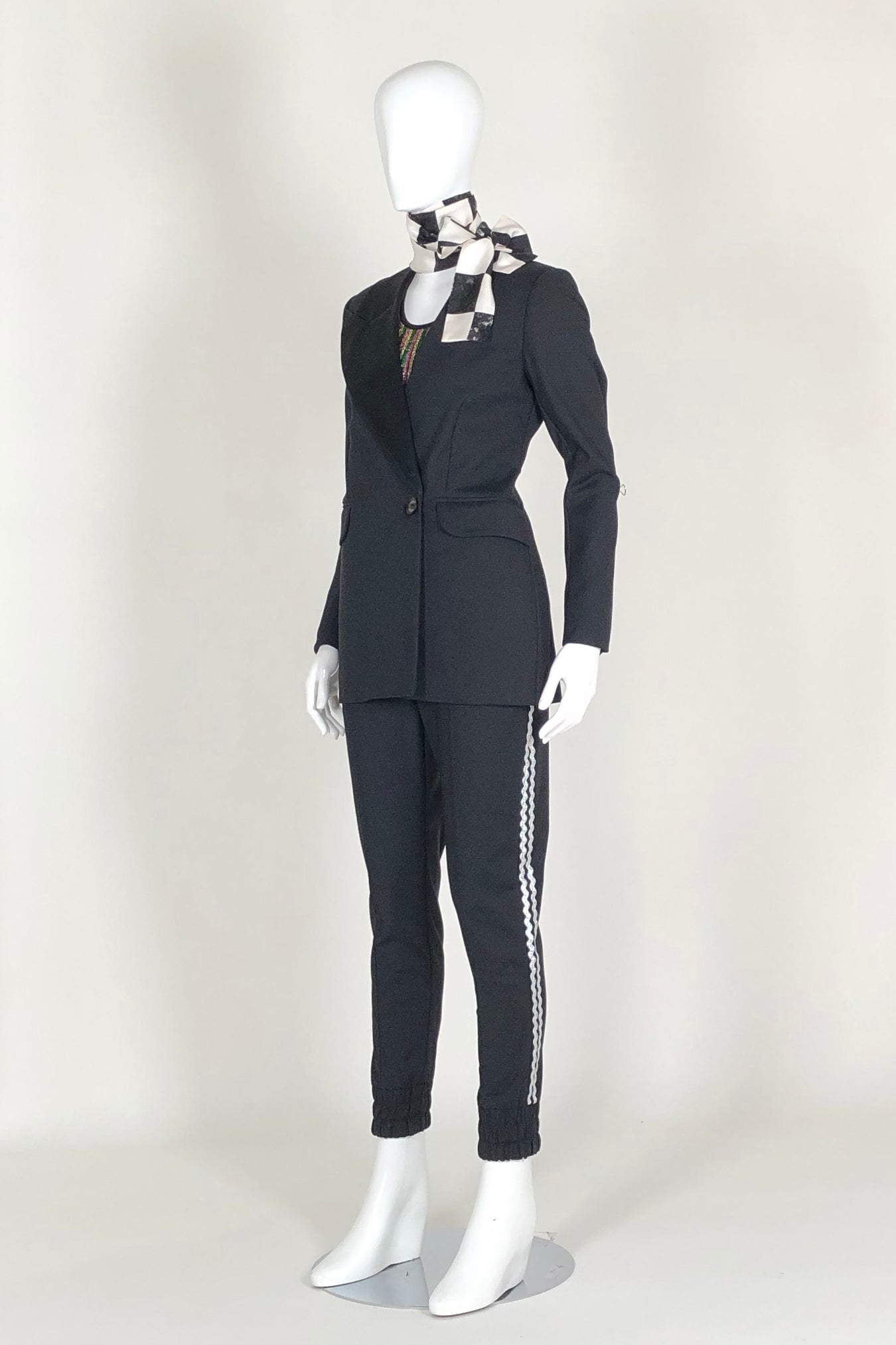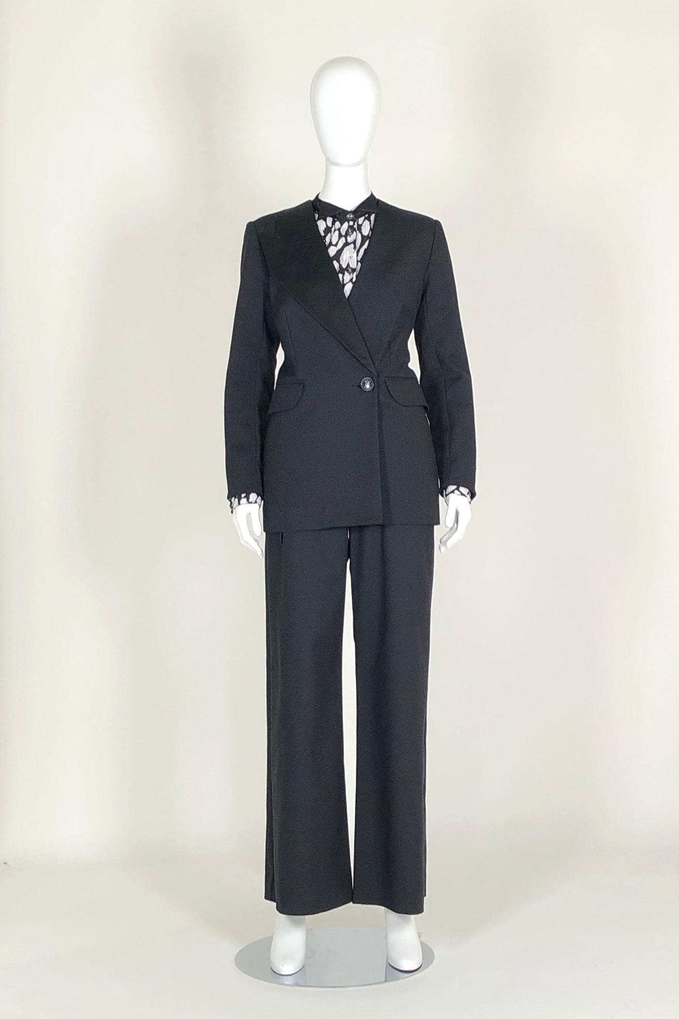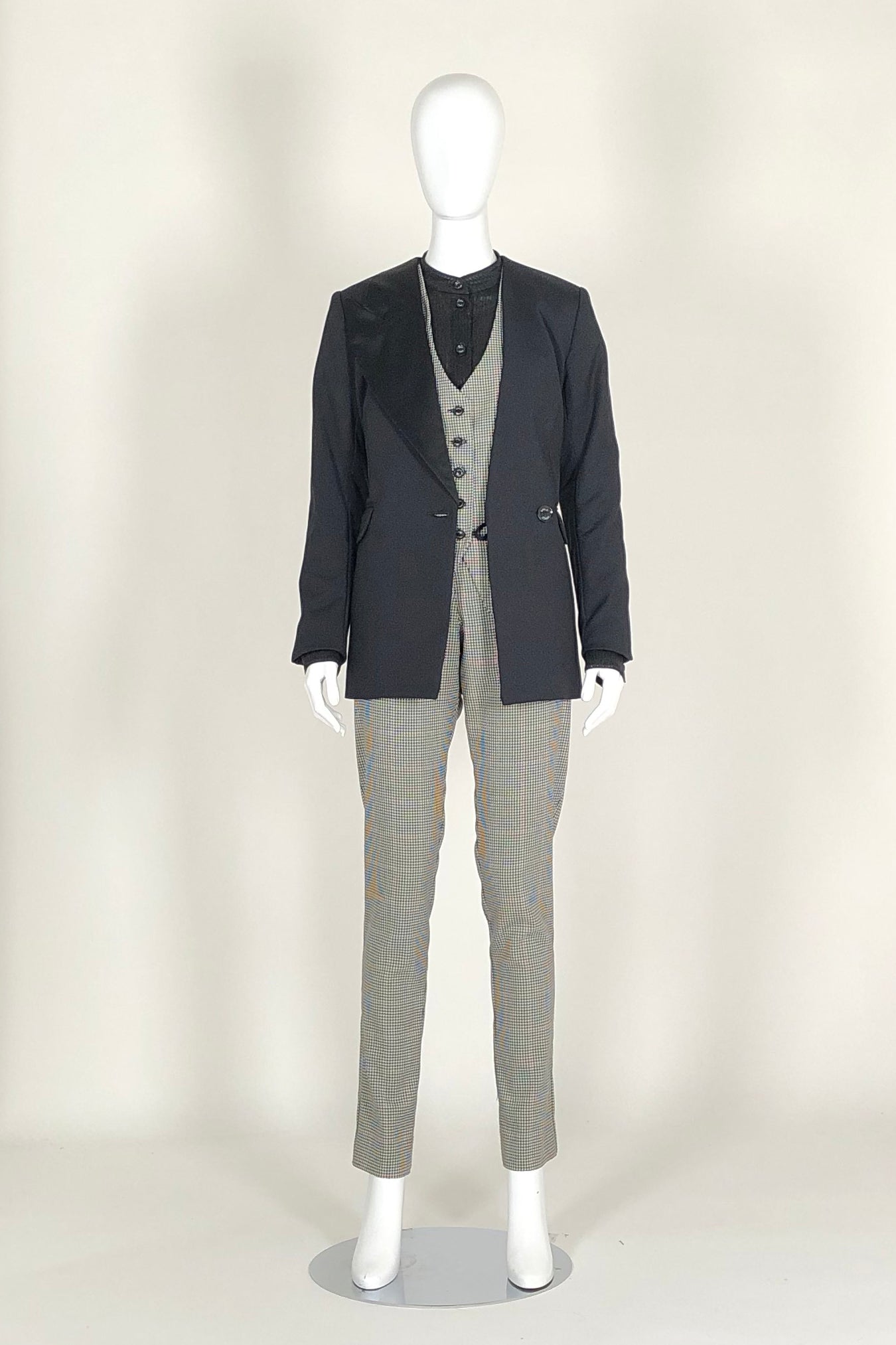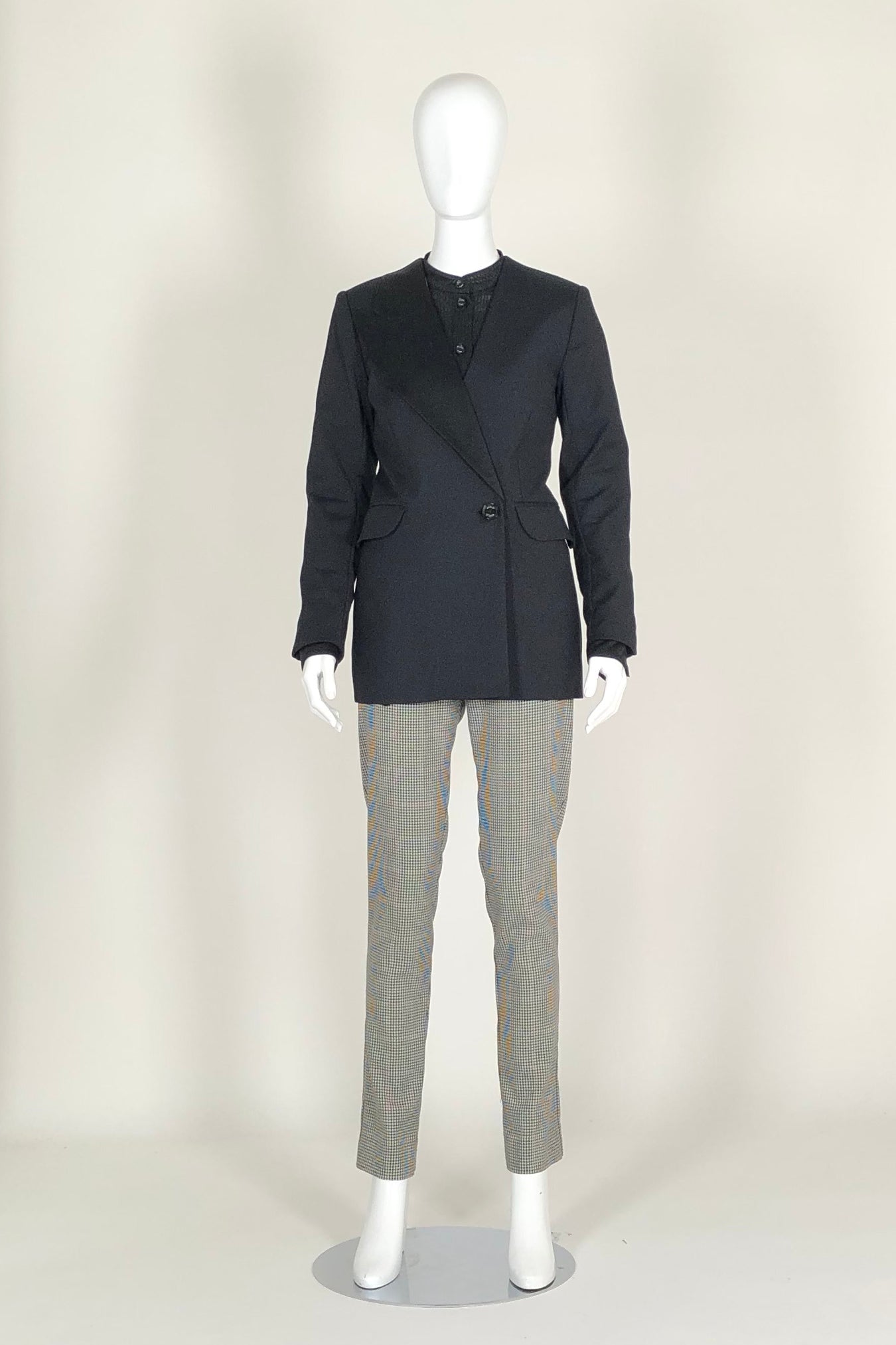 Style: Double breasted asymmetric blazer, one peak contrast satin lapel with interior tie.