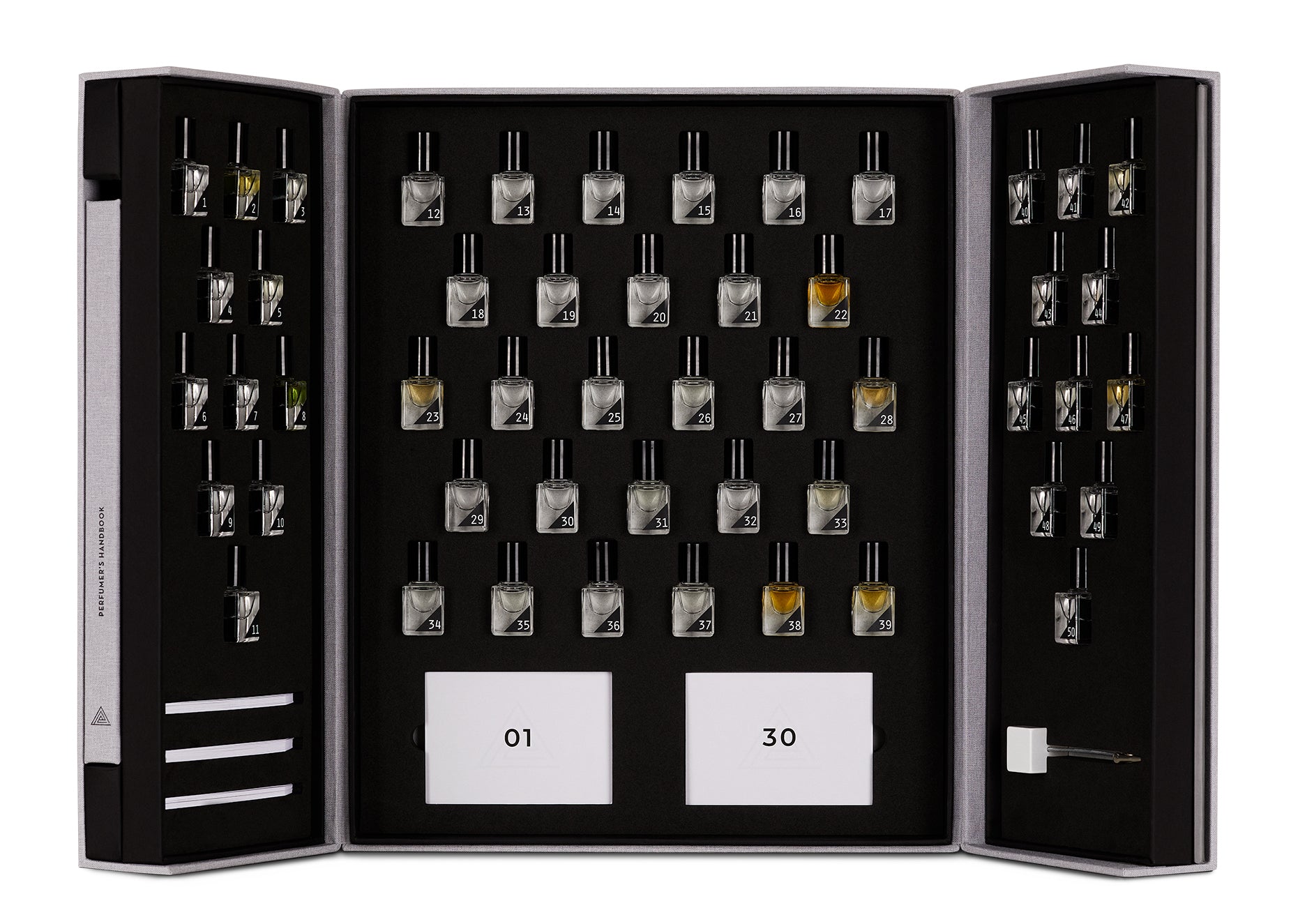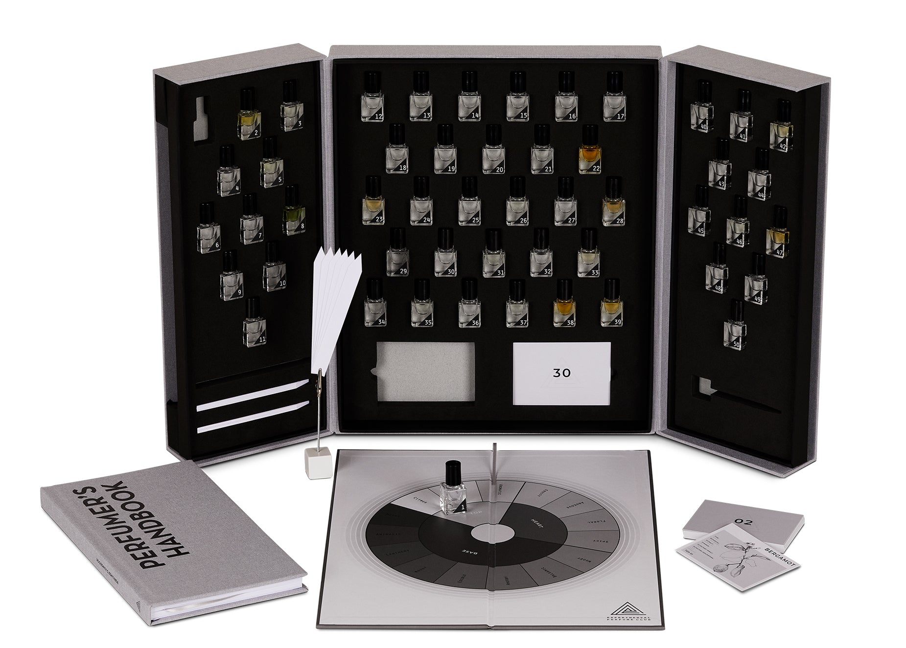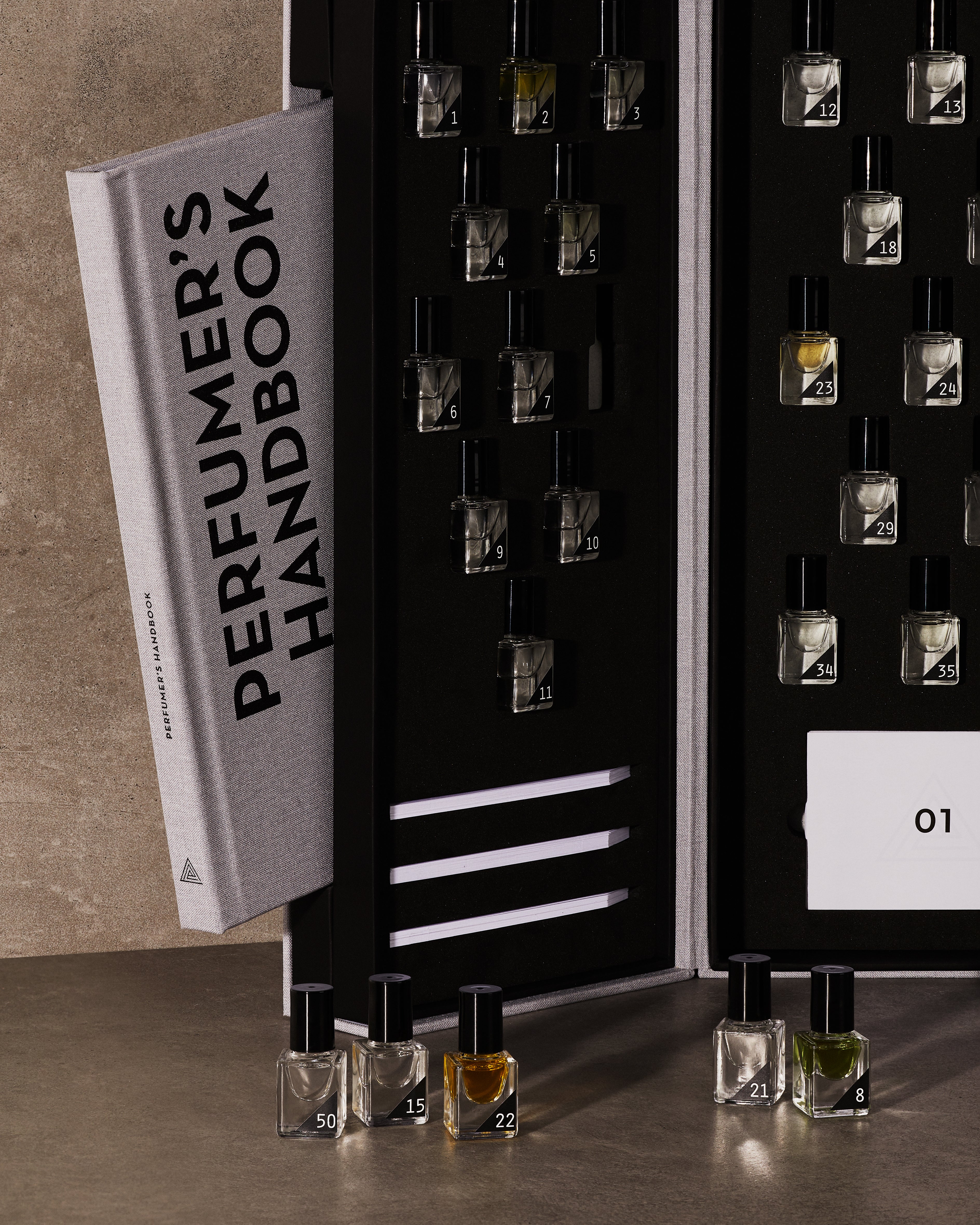 Each box contains a curated selection of 50 of the finest and most commonly used perfumery ingredients, ranging from natural ingredients such as bergamot oil, rose absolute and vetiver oil, aroma-chemicals such as Iso E Super and Calone to famous compositions such as Prunella and Amber 83.