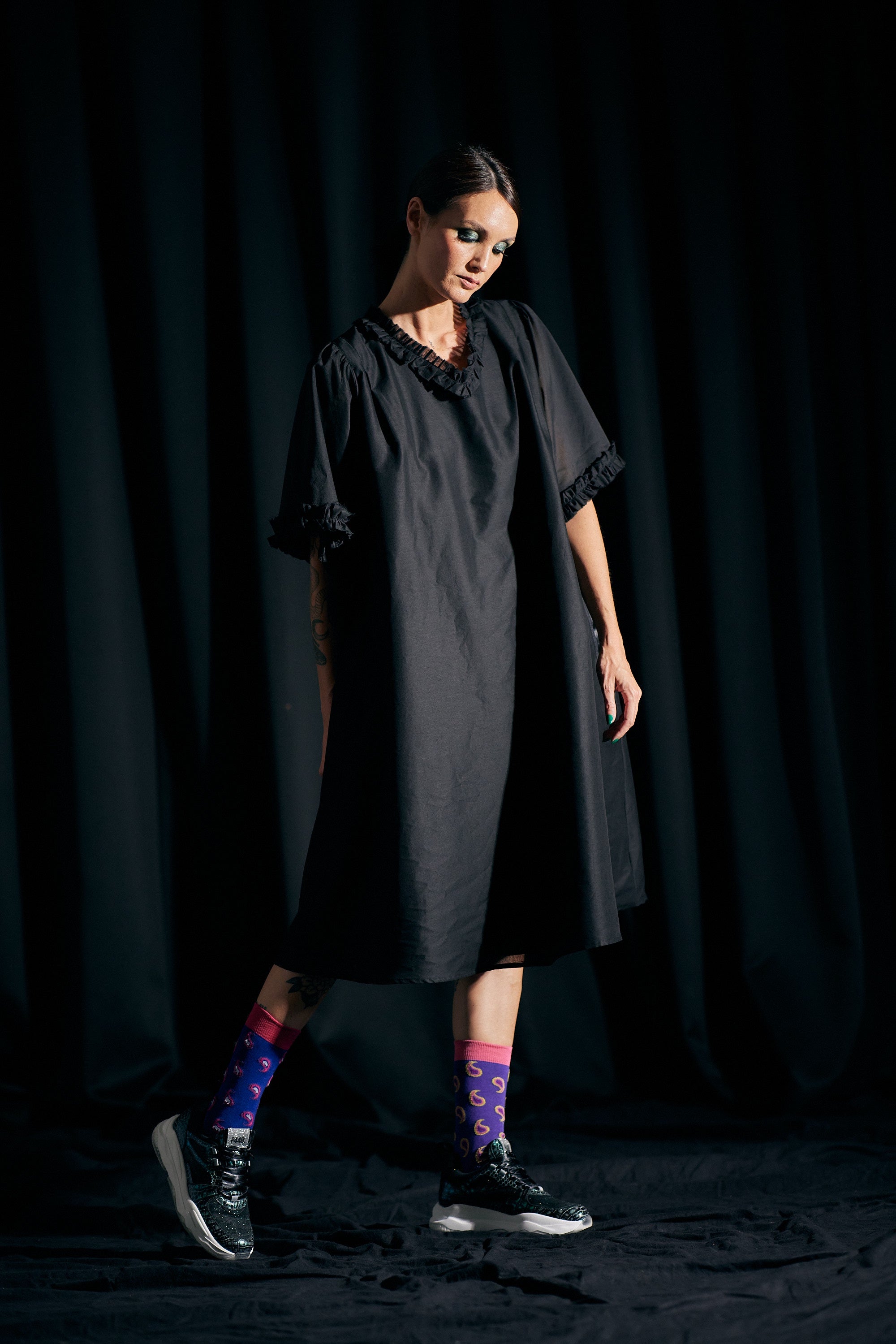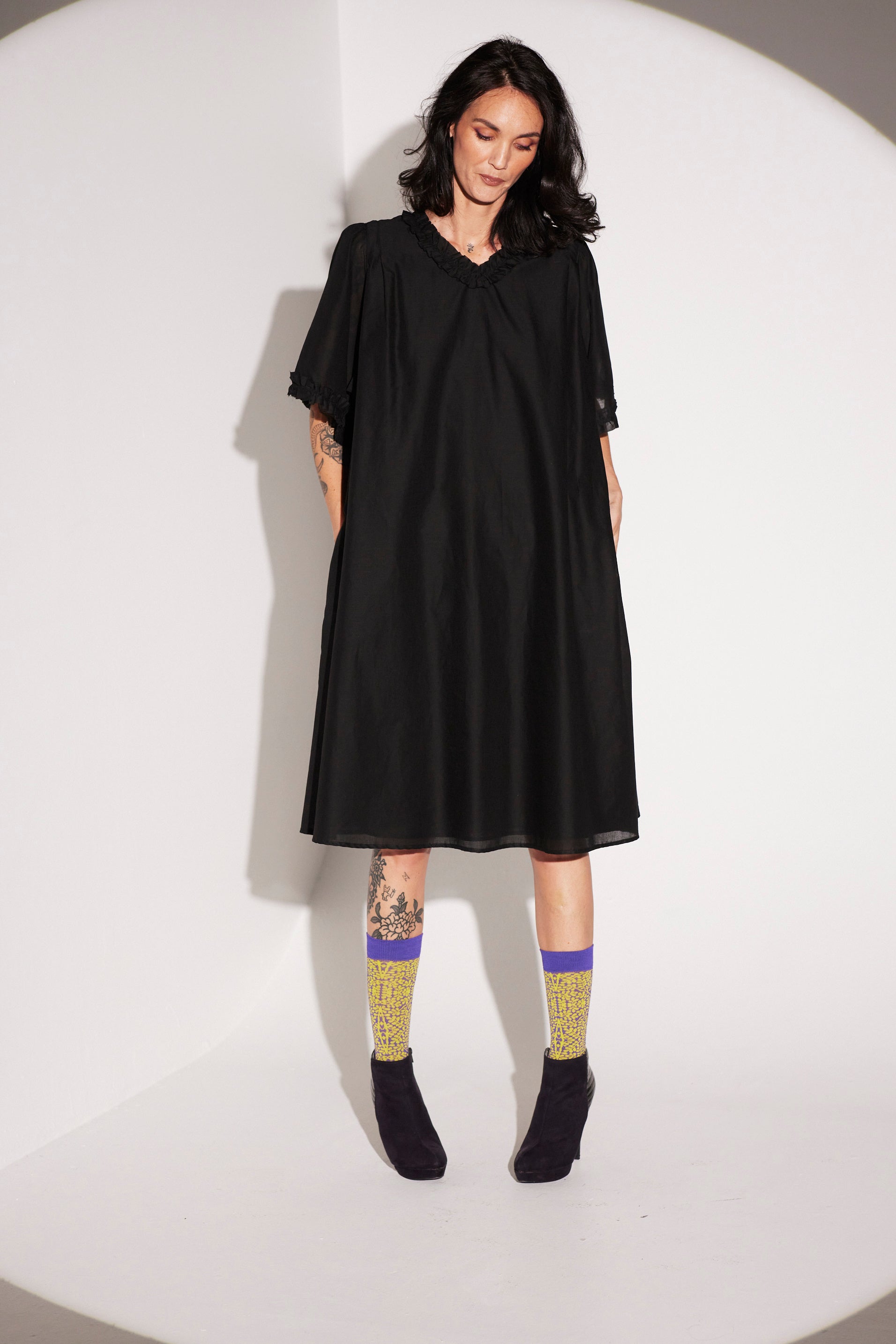 Style: Relaxed, v-neck, short sleeved smock dress, made shapeless for easy wear. Throw on during the warmer months our layer as it cools down.