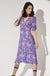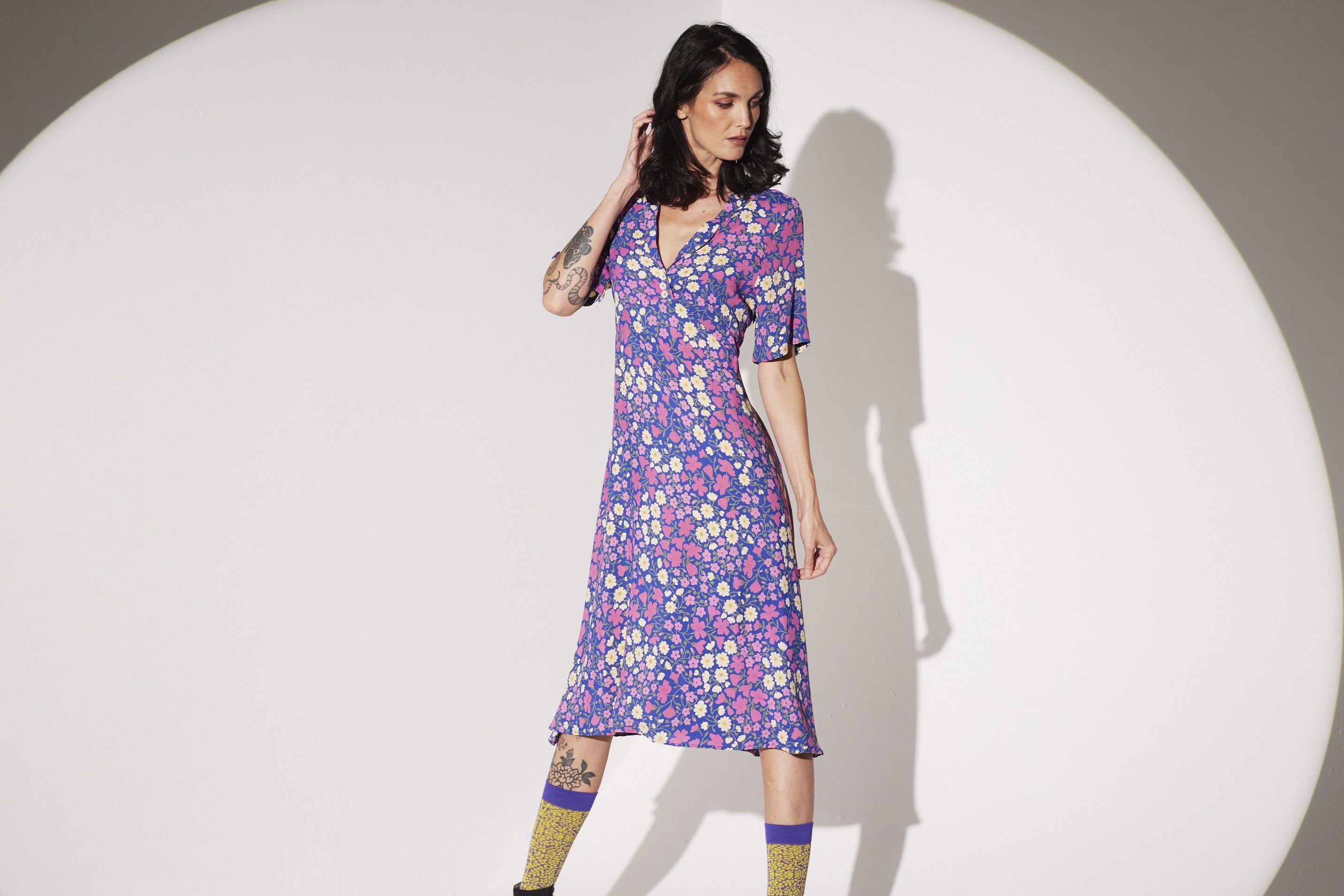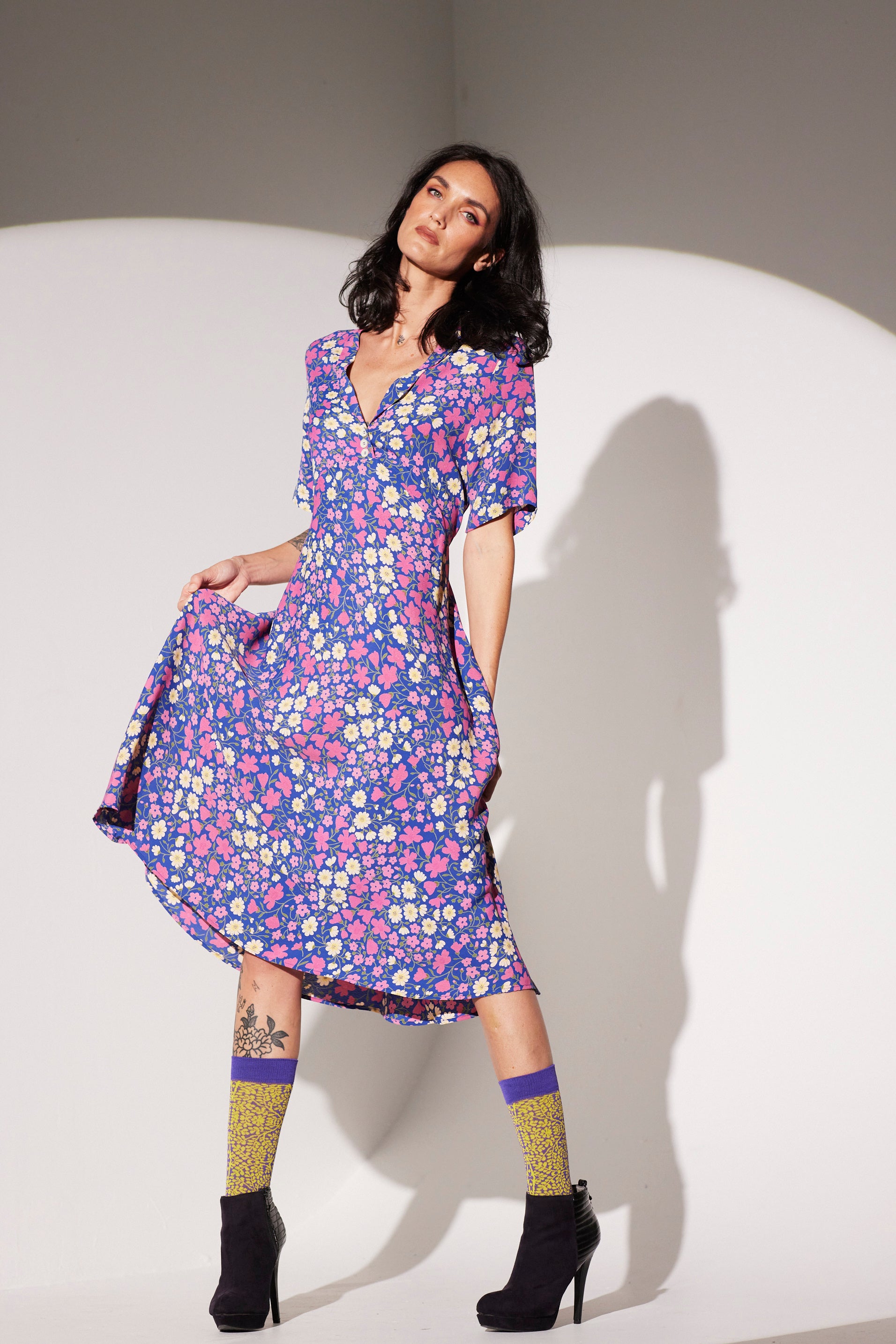 Style: Fitted V-Neck top with fine lapel, flowing skirt draping below the knee, shaping down empire line from the front to an elasticated back panel offering more comfort