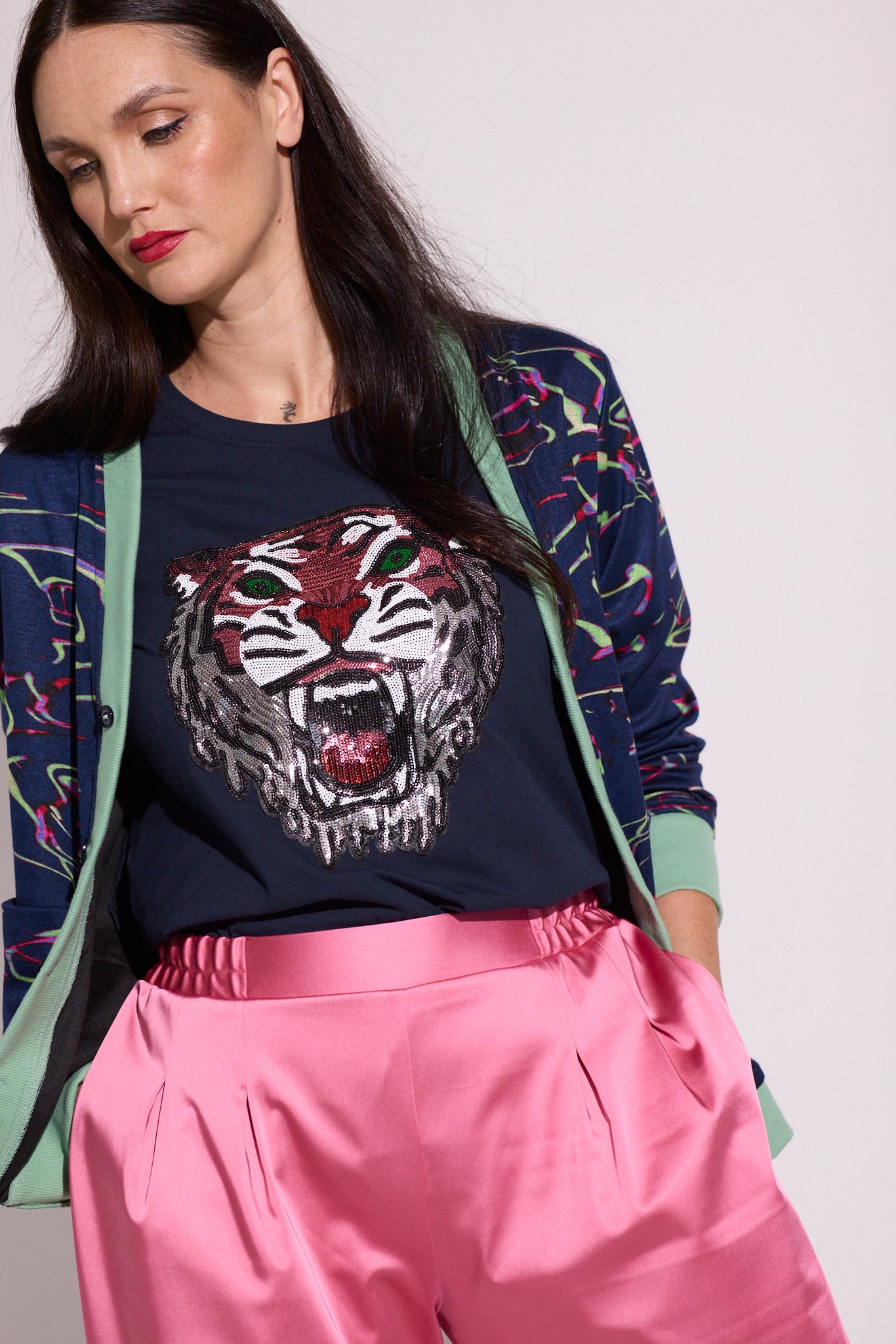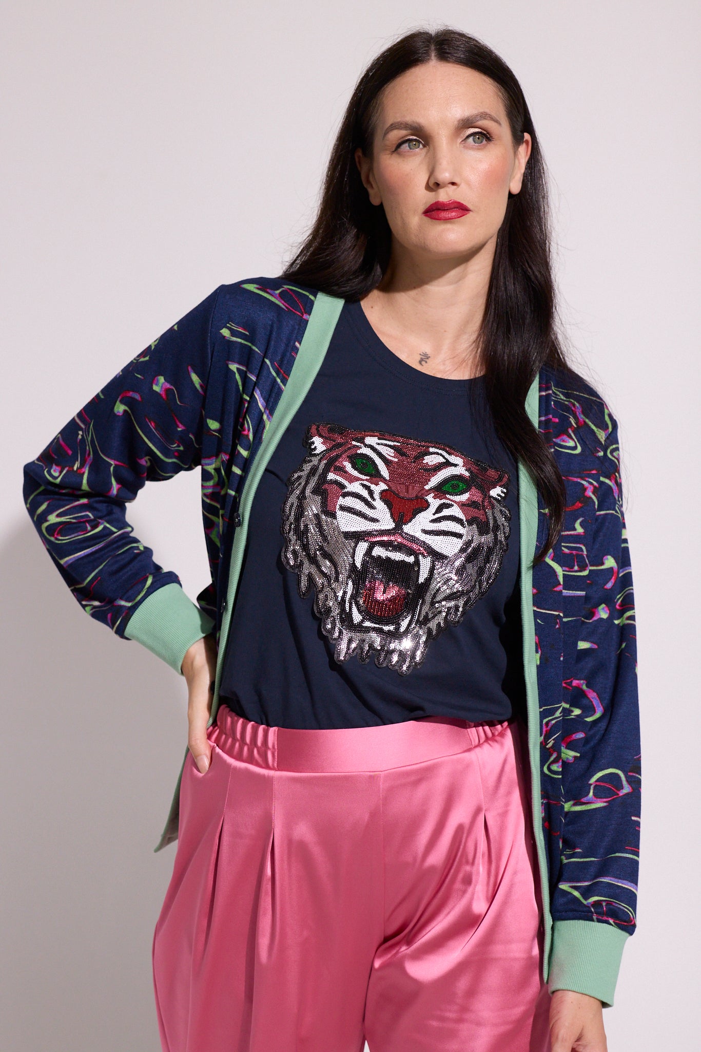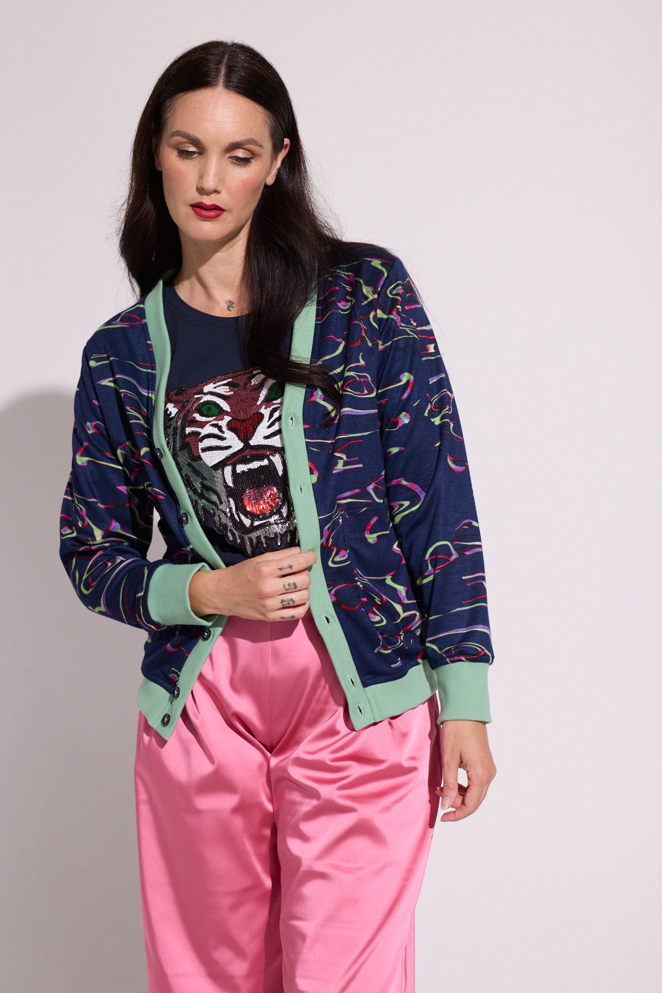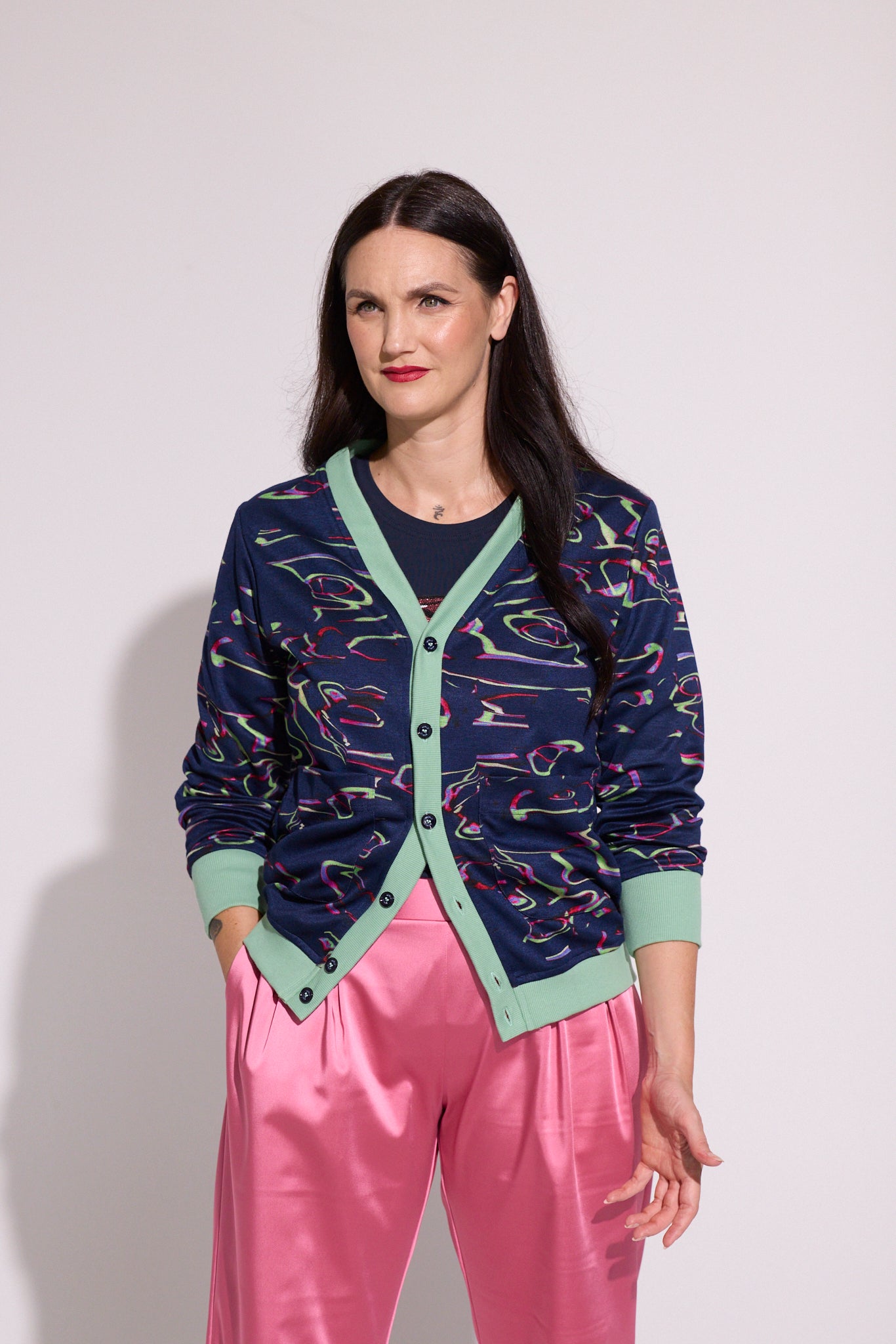 Style: Cardigan, relaxed in shape and woven in a soft sweatshirting knit and a contrast cotton rib.