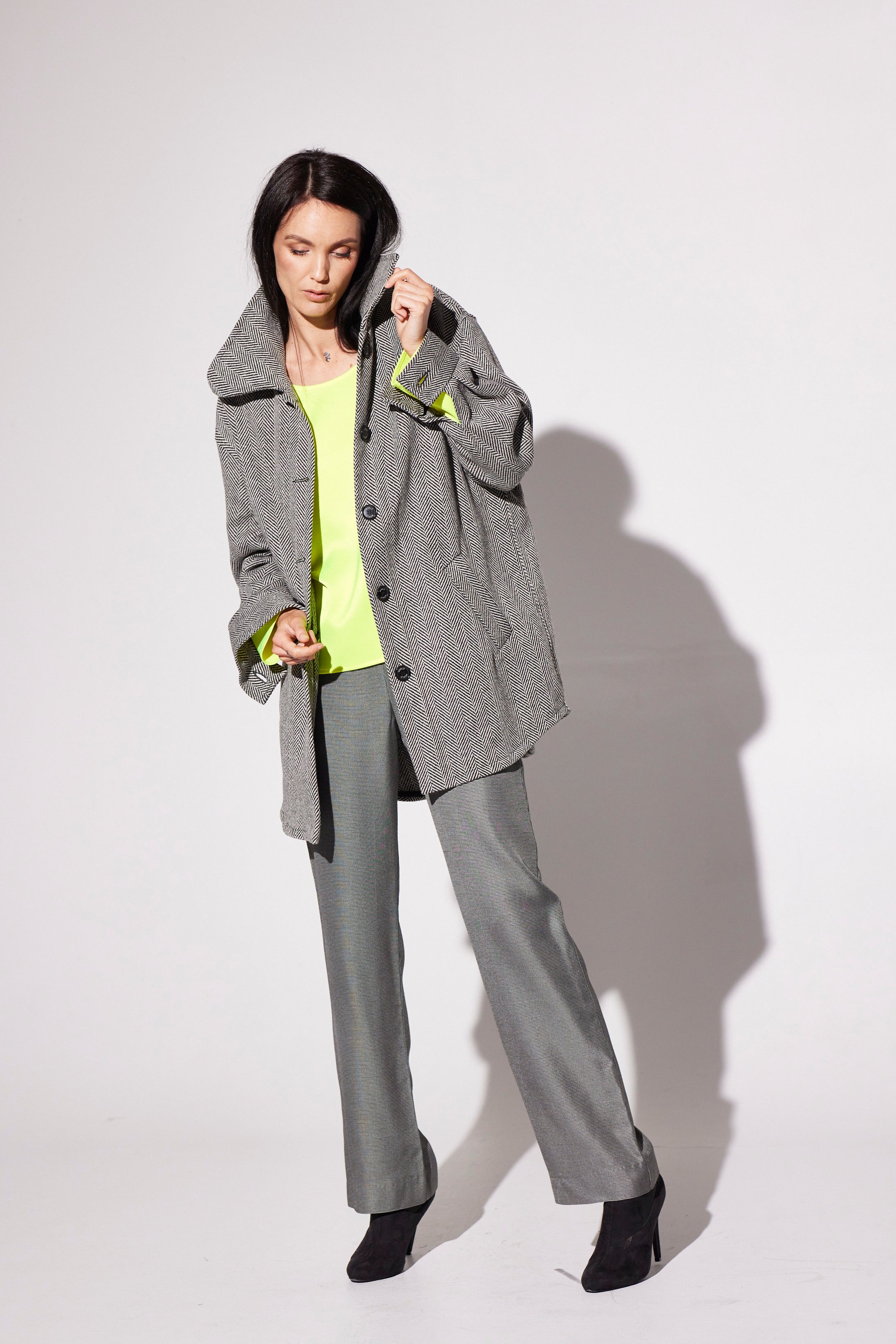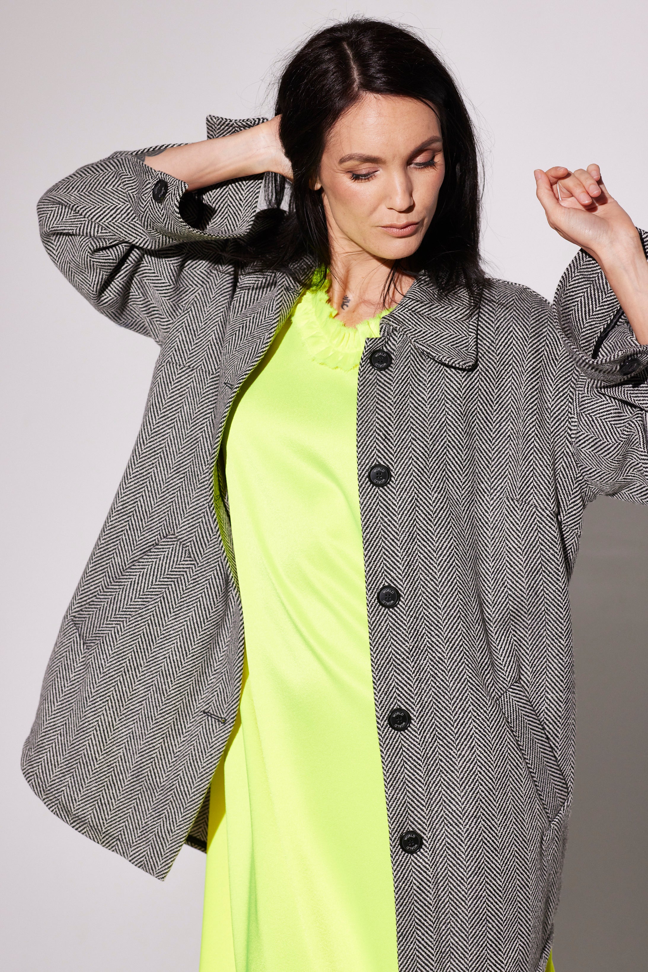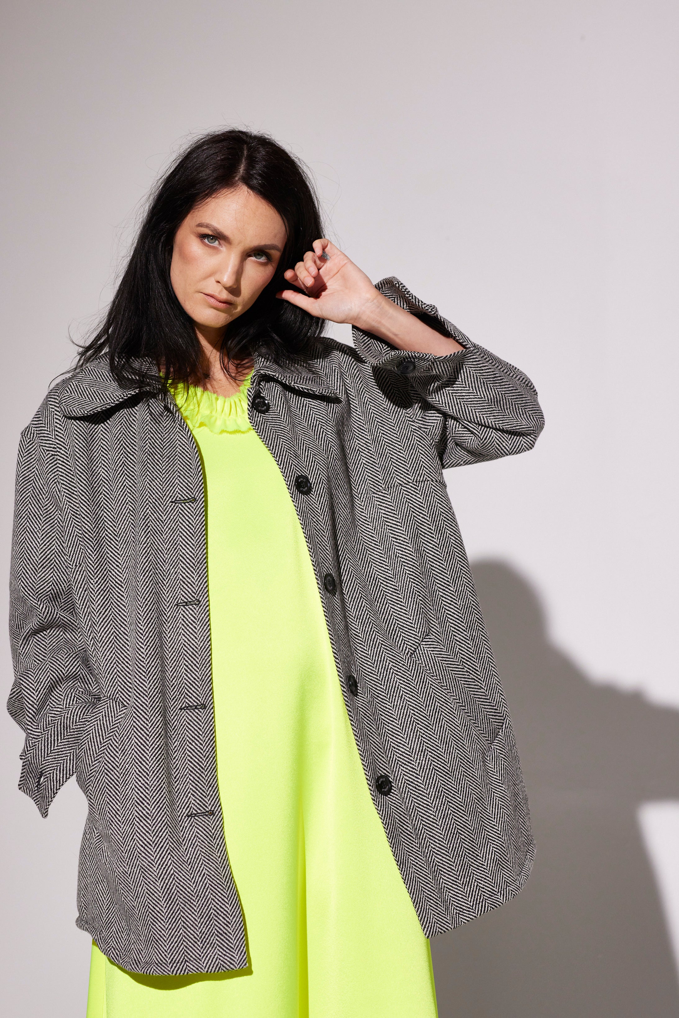 Style: A shirt-styled relaxed wool coat. An unlined and button-up slouched piece with an exaggerated shirt collar and cuff.