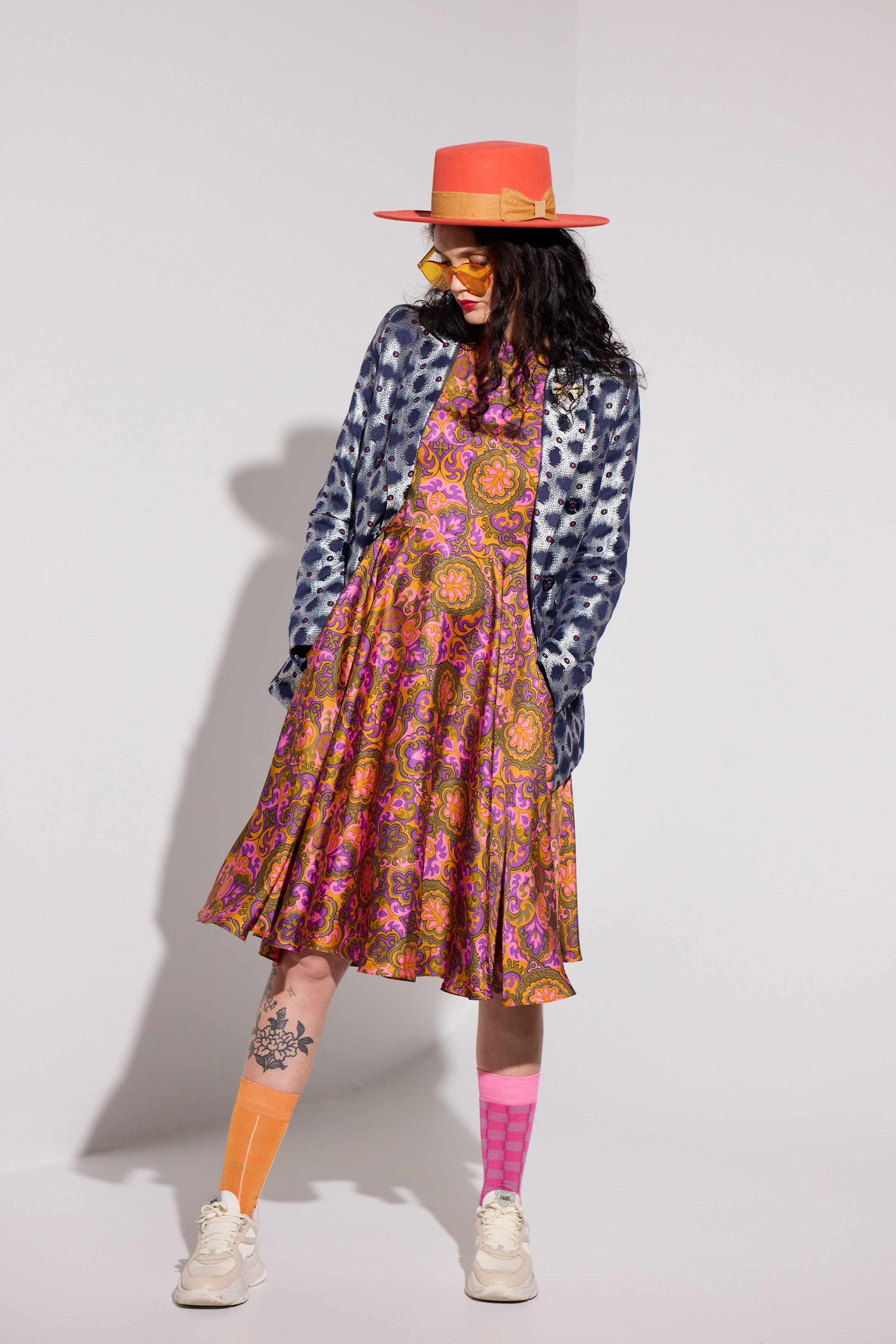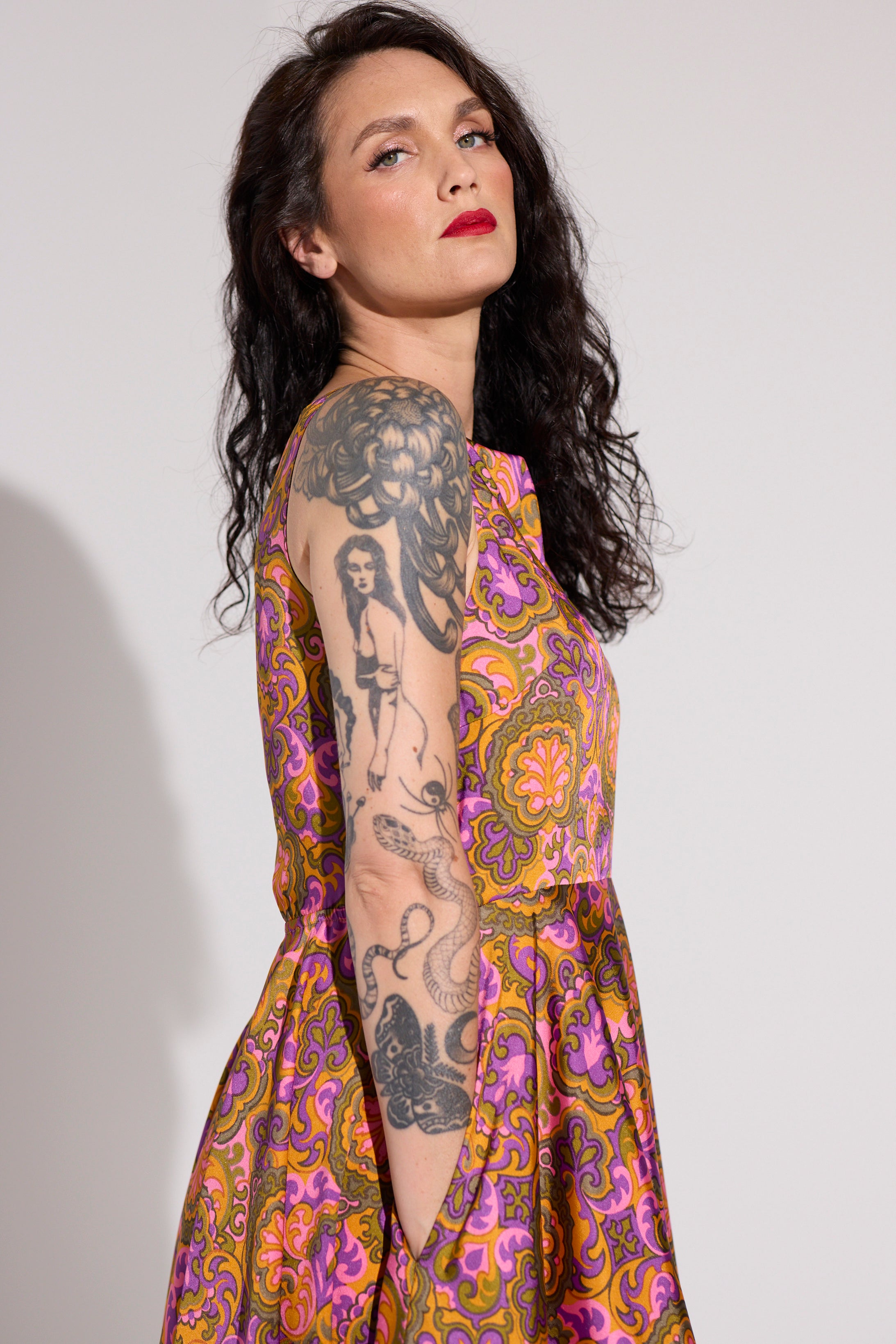 Style: Cut from a one of a kind silk twill print this 50's waisted dress with an almost sailor collar baby doll top and a swinging skirt allows a draping and an easy elegant wear with shape and structure..
