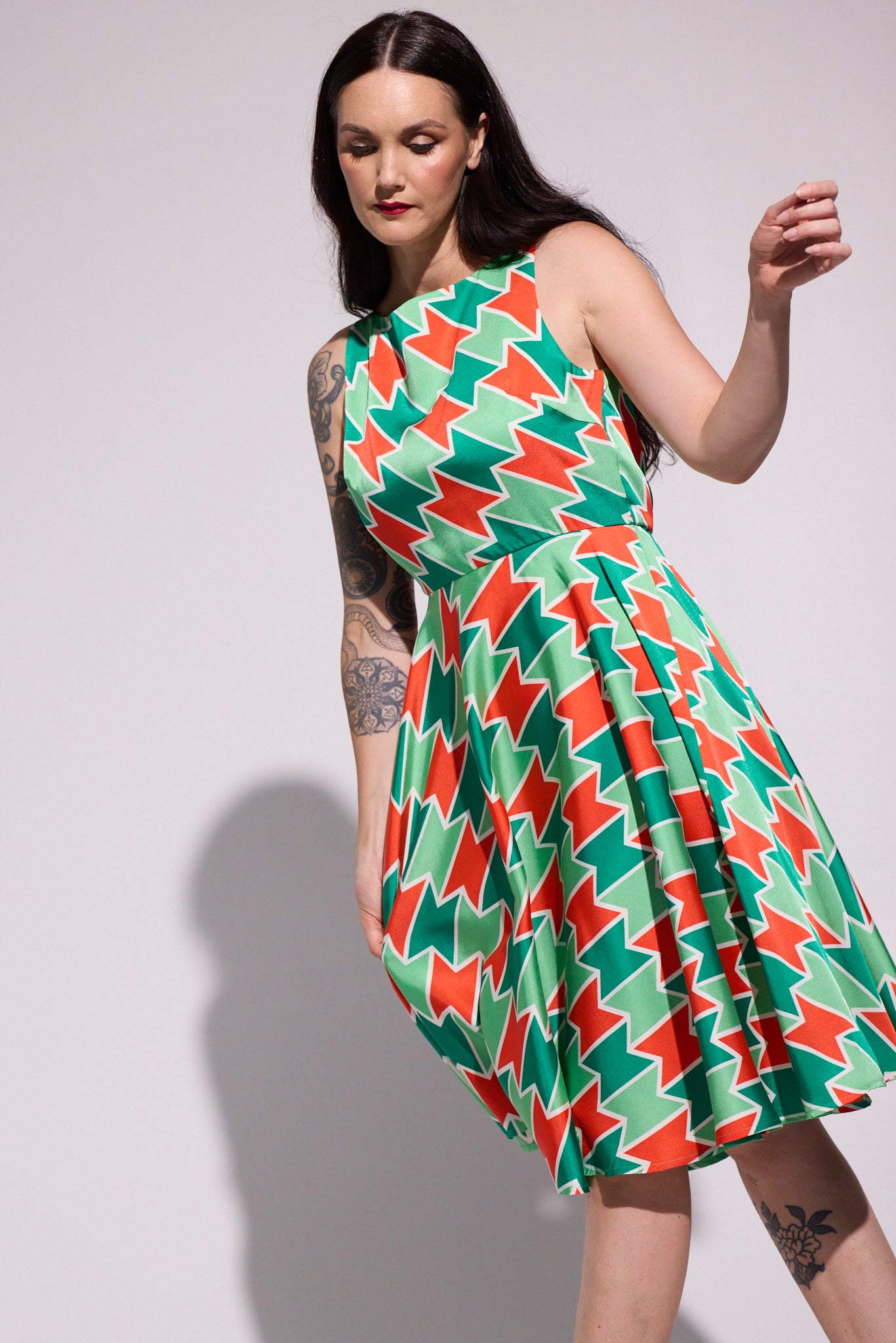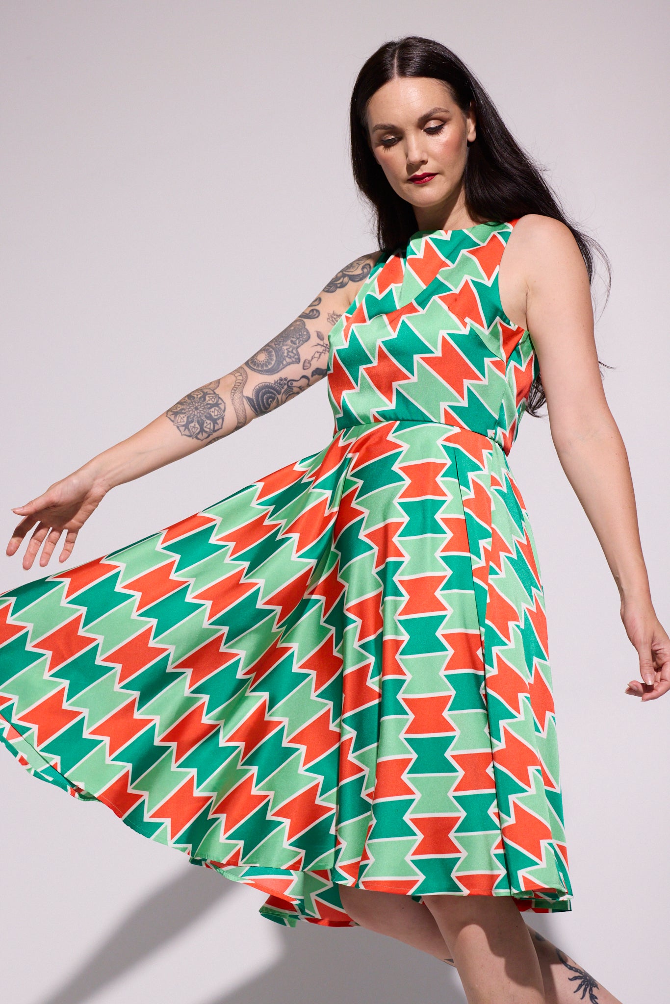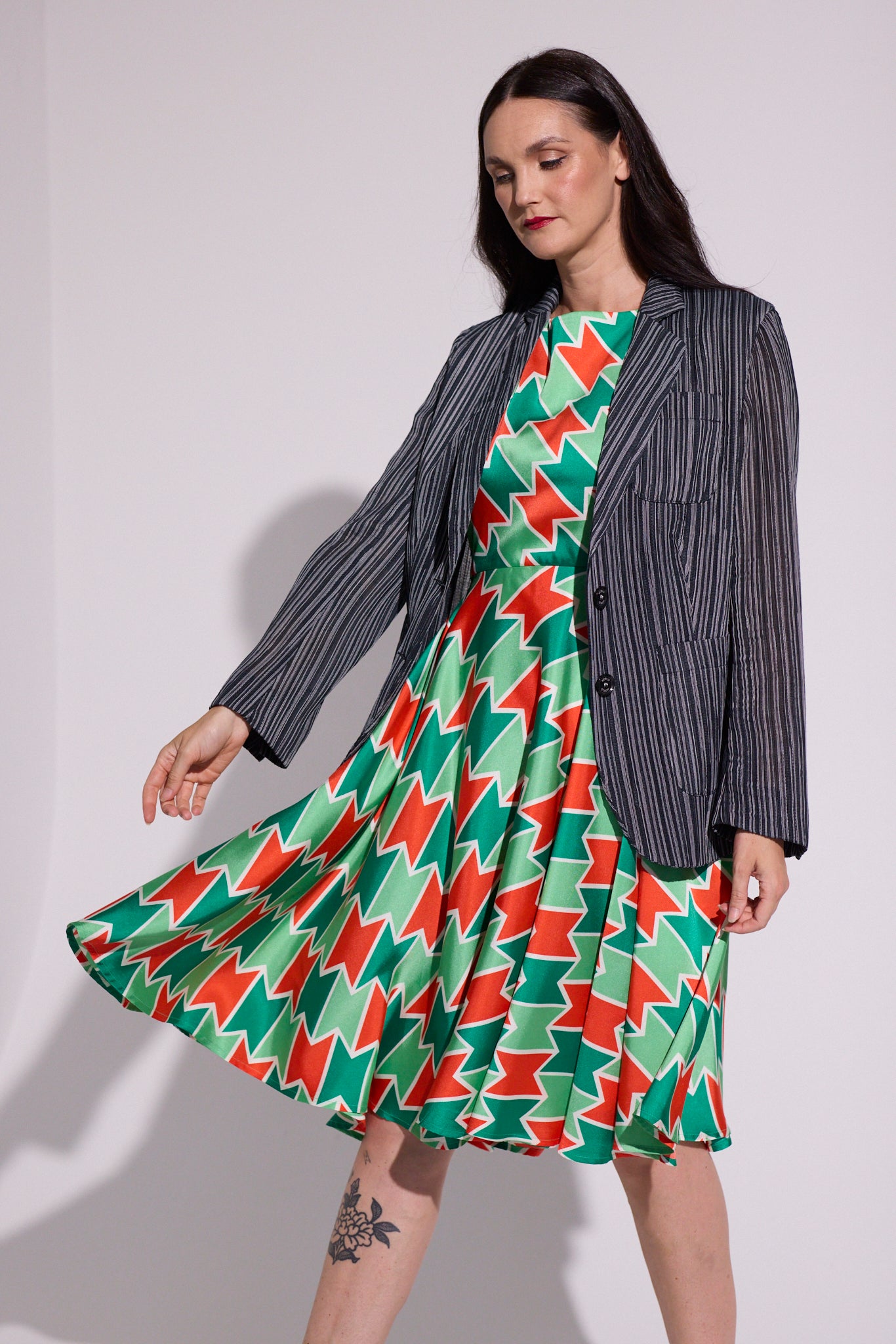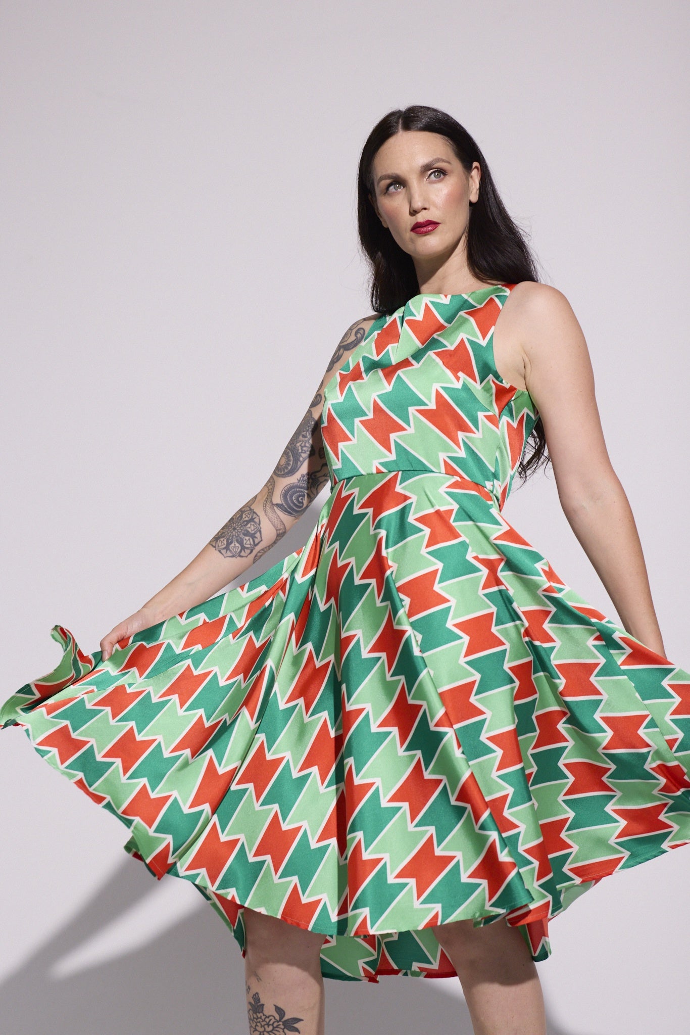 Style: Cut from a one of a kind silk twill print this 50's waisted dress with an almost sailor collar baby doll top and a swinging skirt allows a draping and an easy elegant wear with shape and structure.