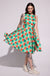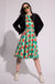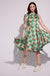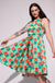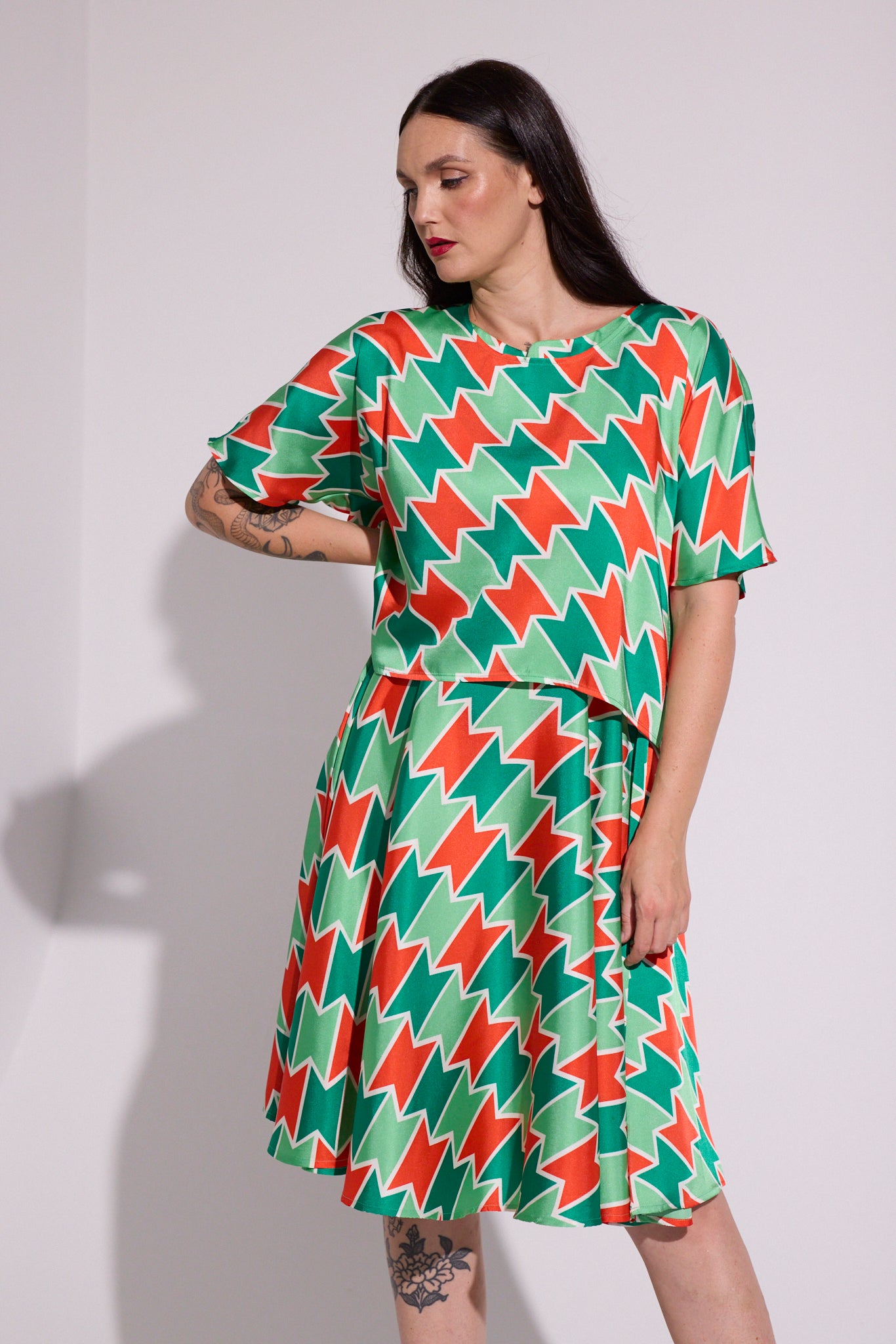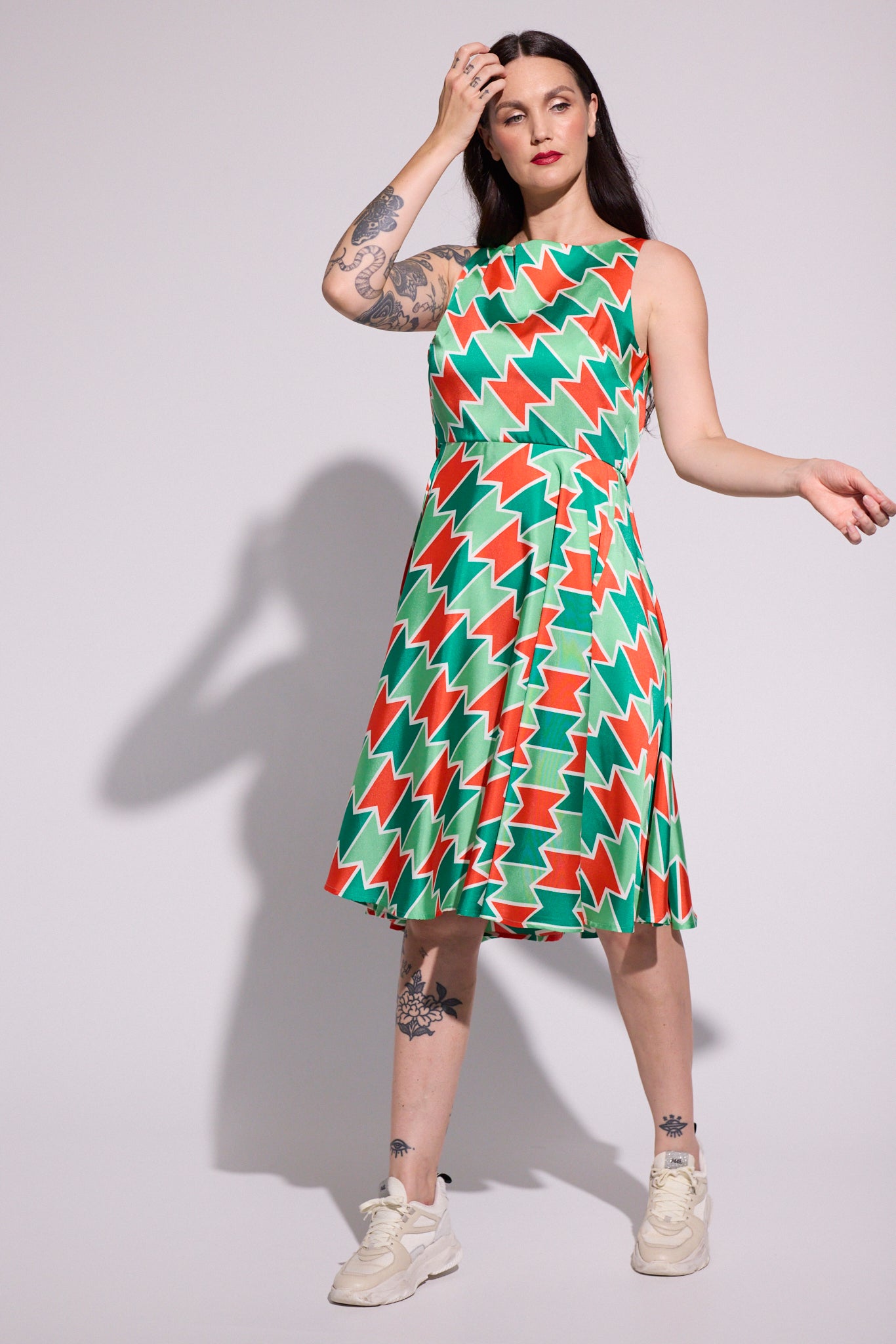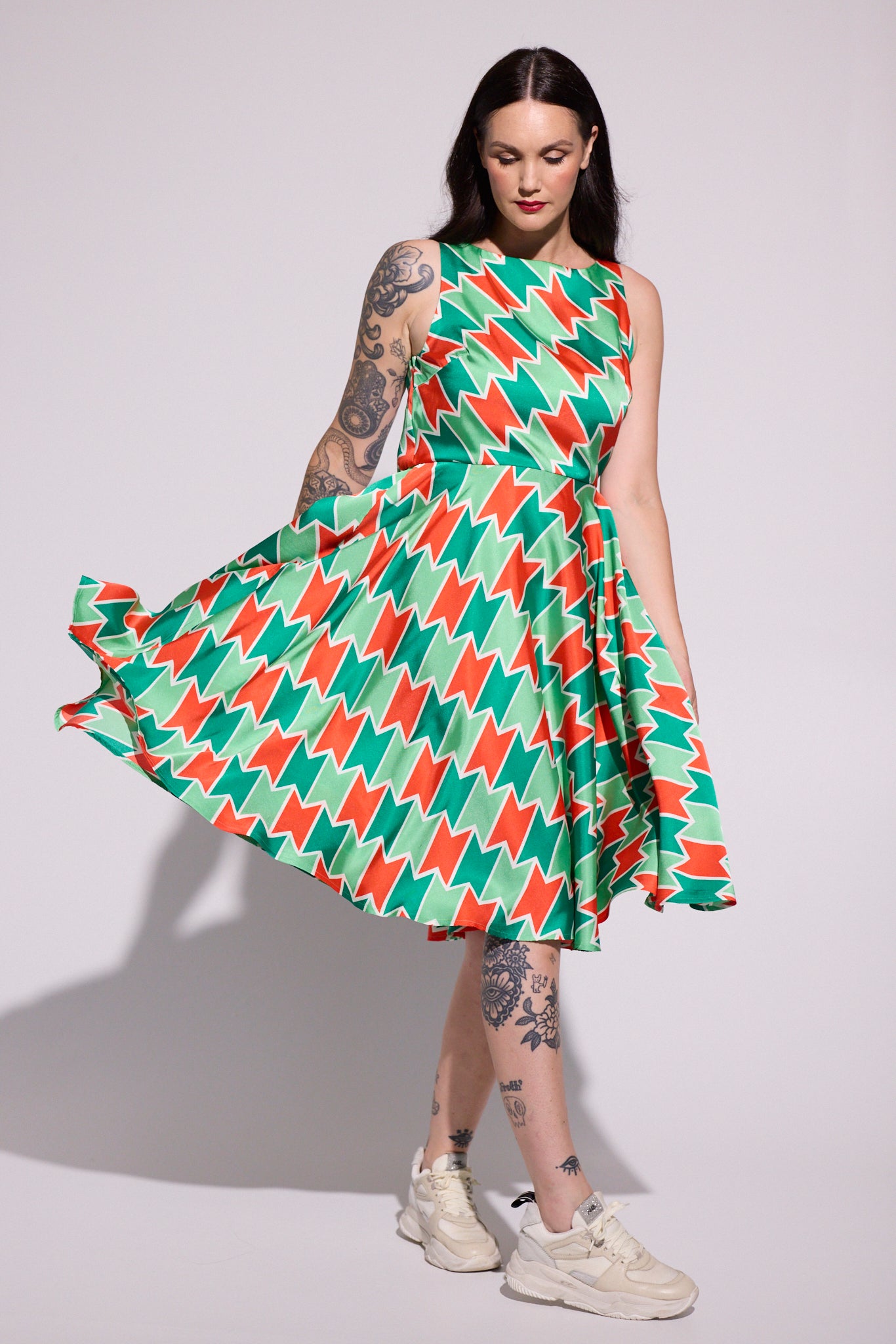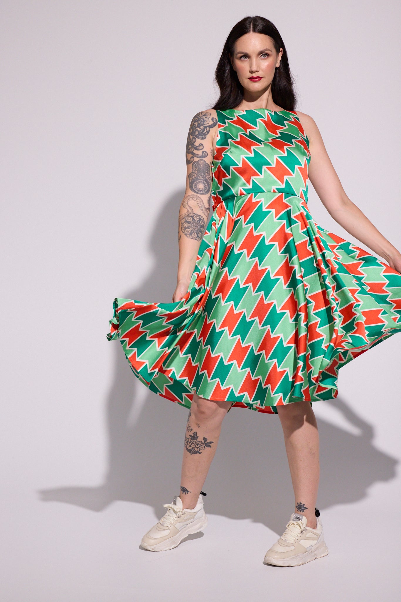Style: Cut from a one of a kind silk twill print this 50's waisted dress with an almost sailor collar baby doll top and a swinging skirt allows a draping and an easy elegant wear with shape and structure.