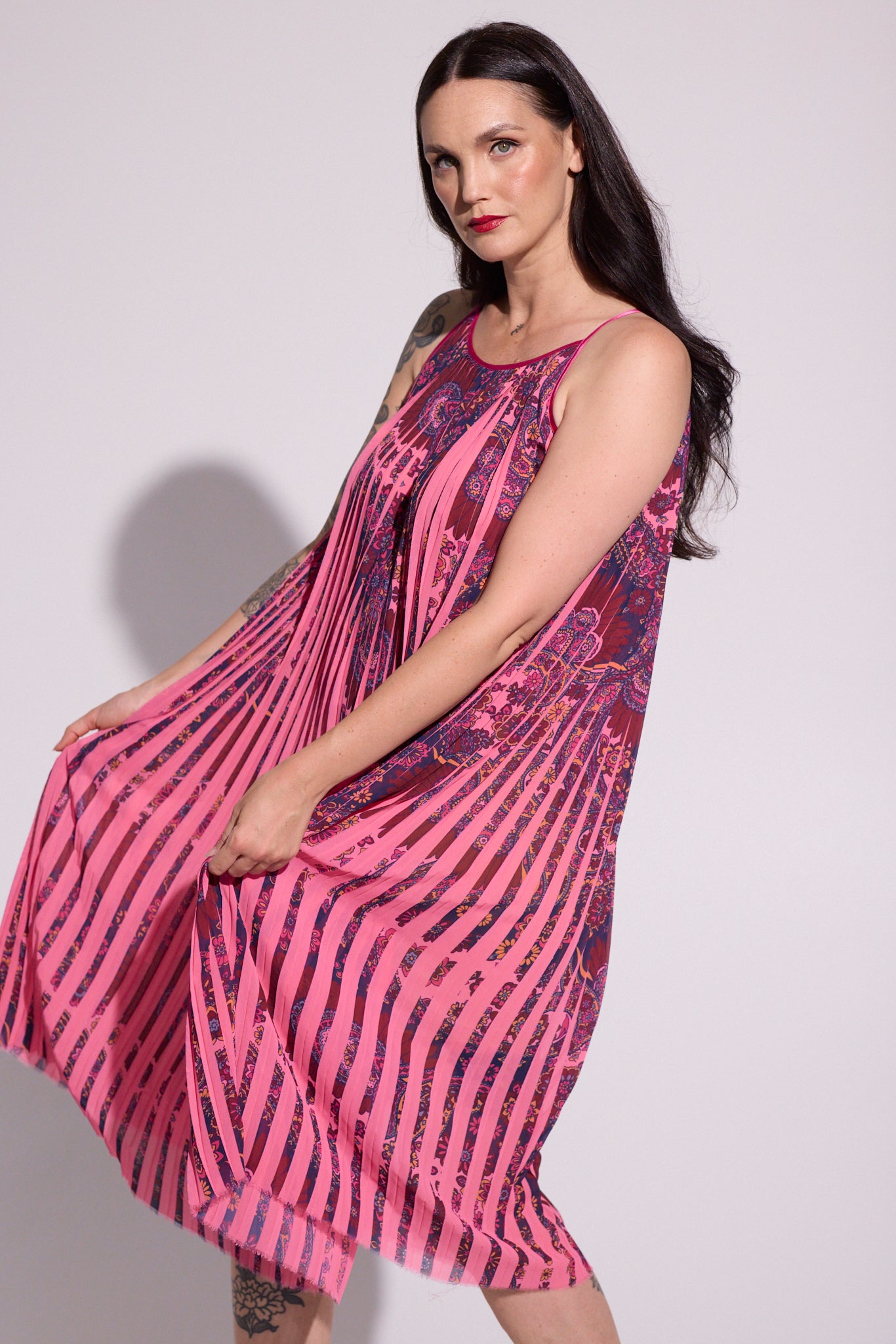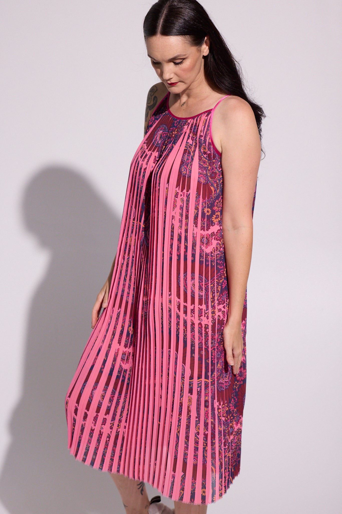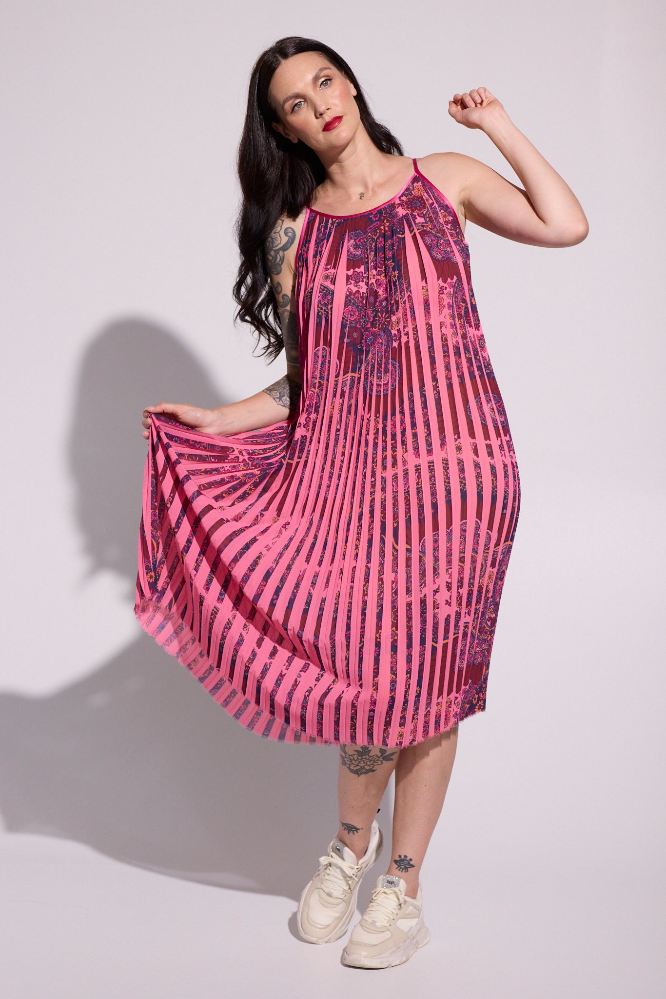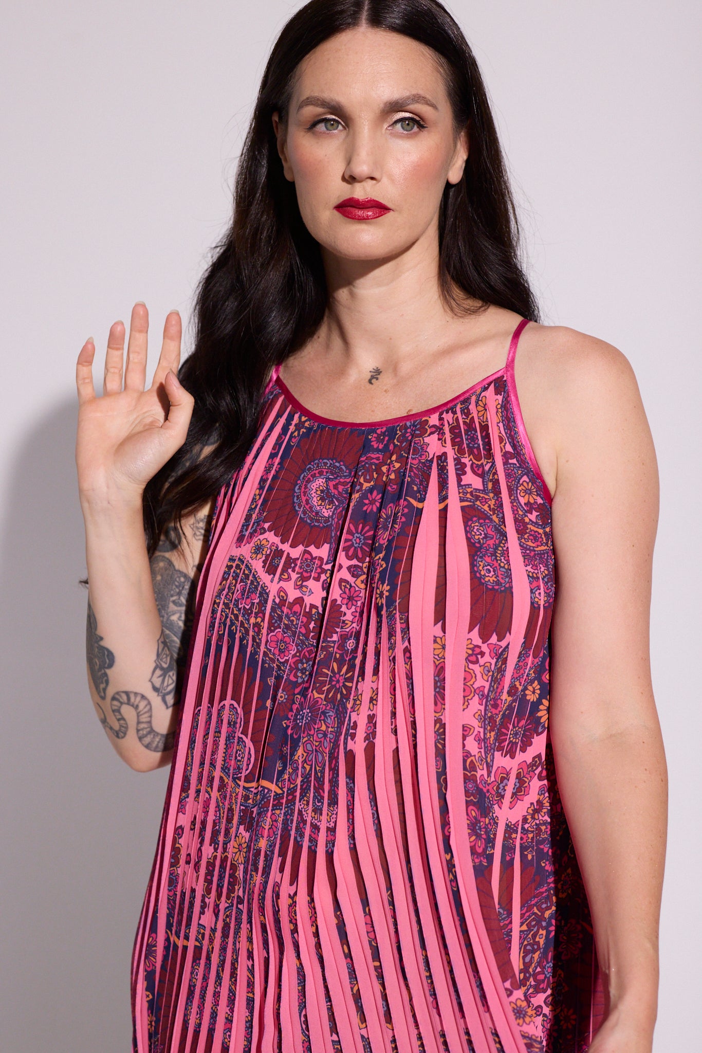 Style: Cut from a one-of-a-kind pleat-printed chiffon, this spaghetti strap swing dress is a full-flowing & draping dress with a raw hem. A gorgeously weighted high summer dress.