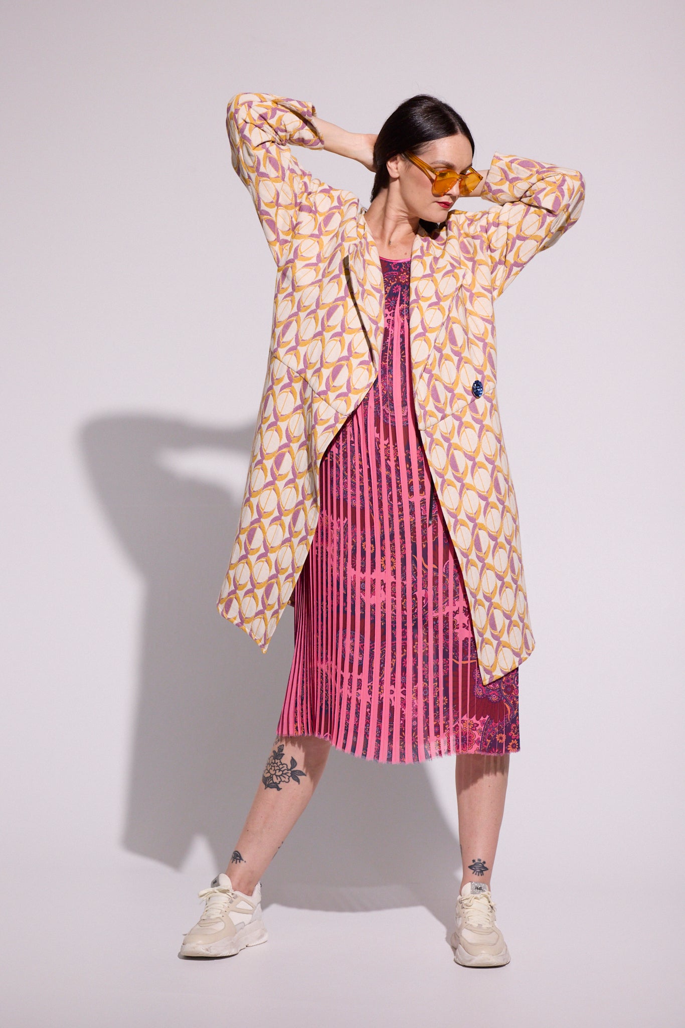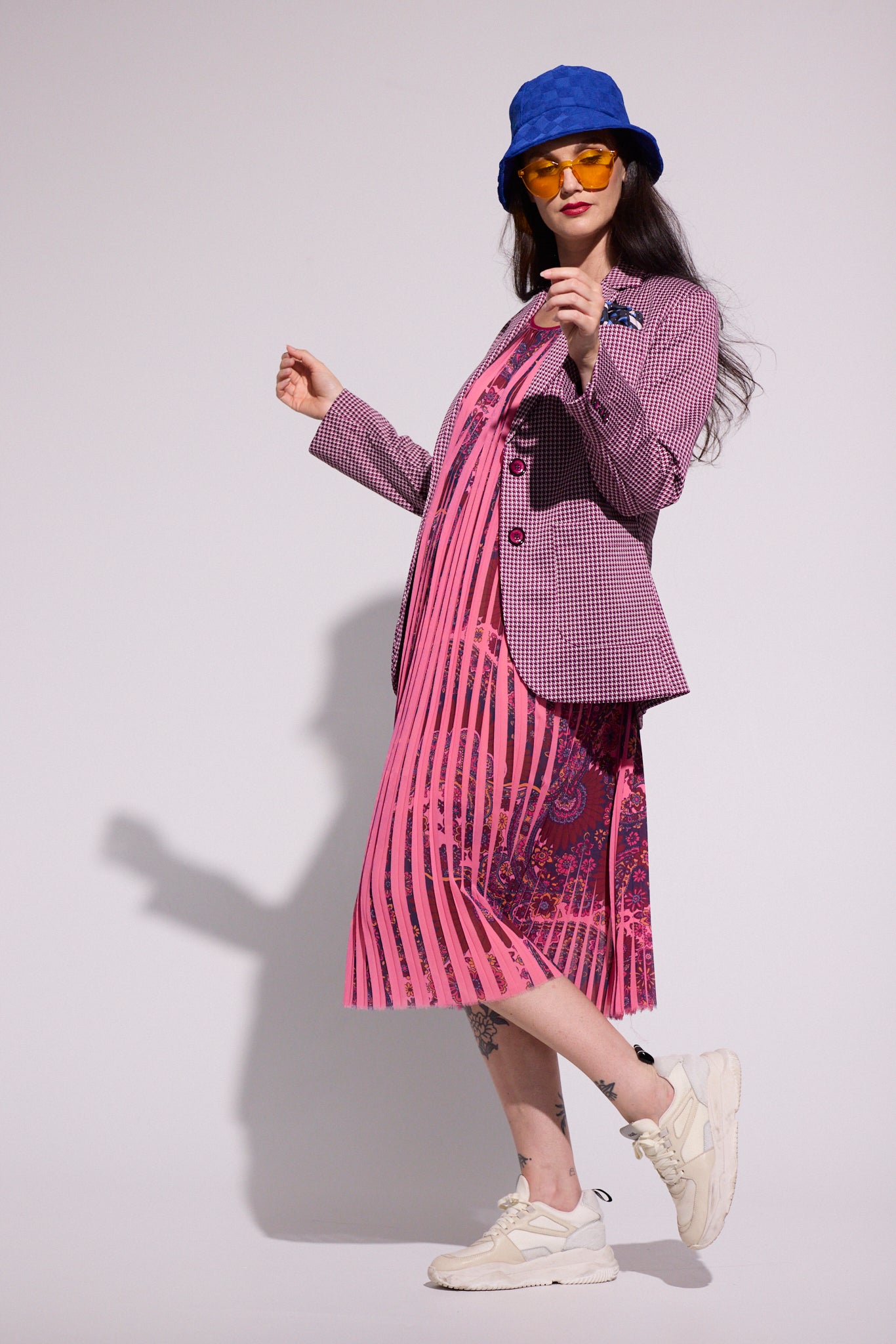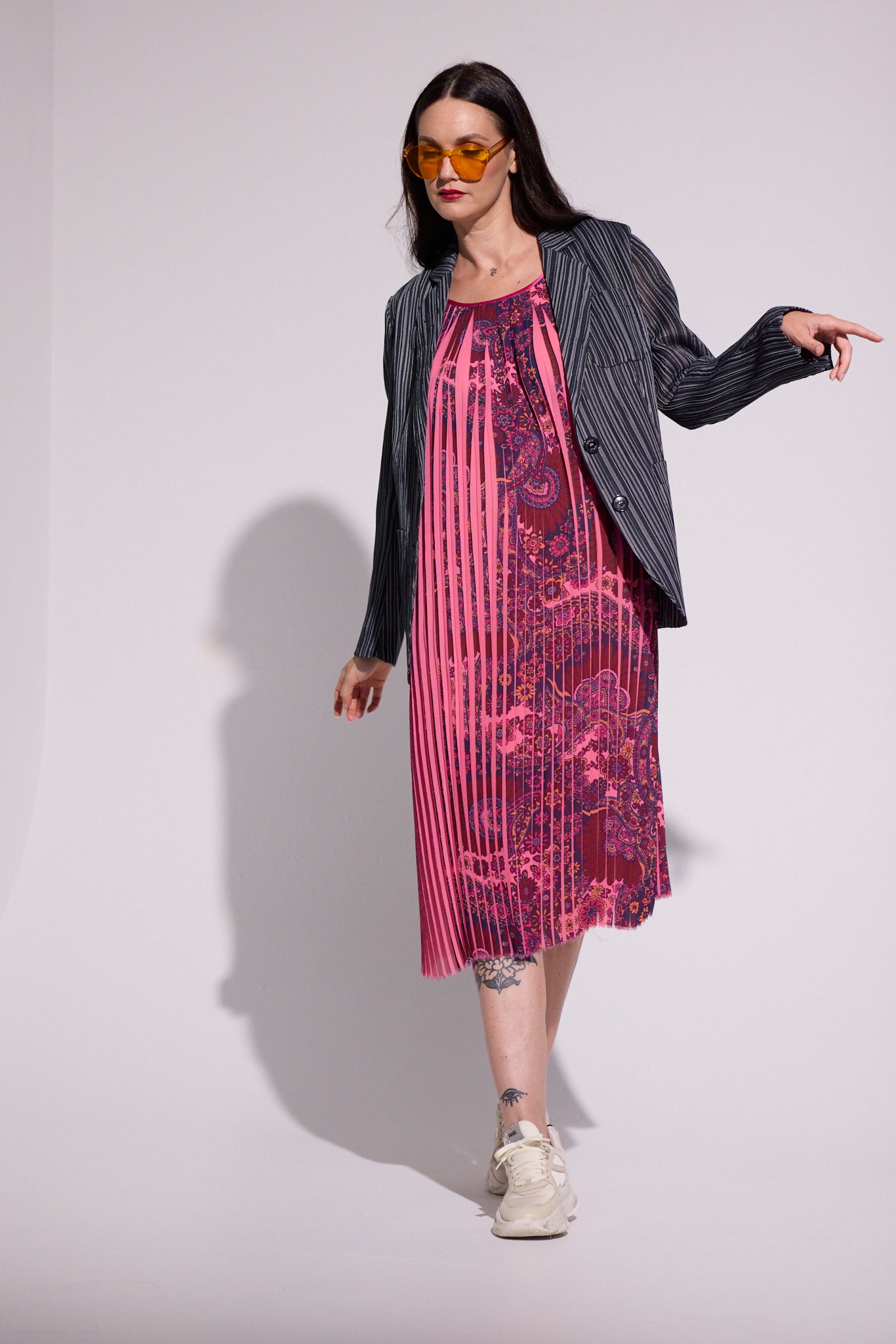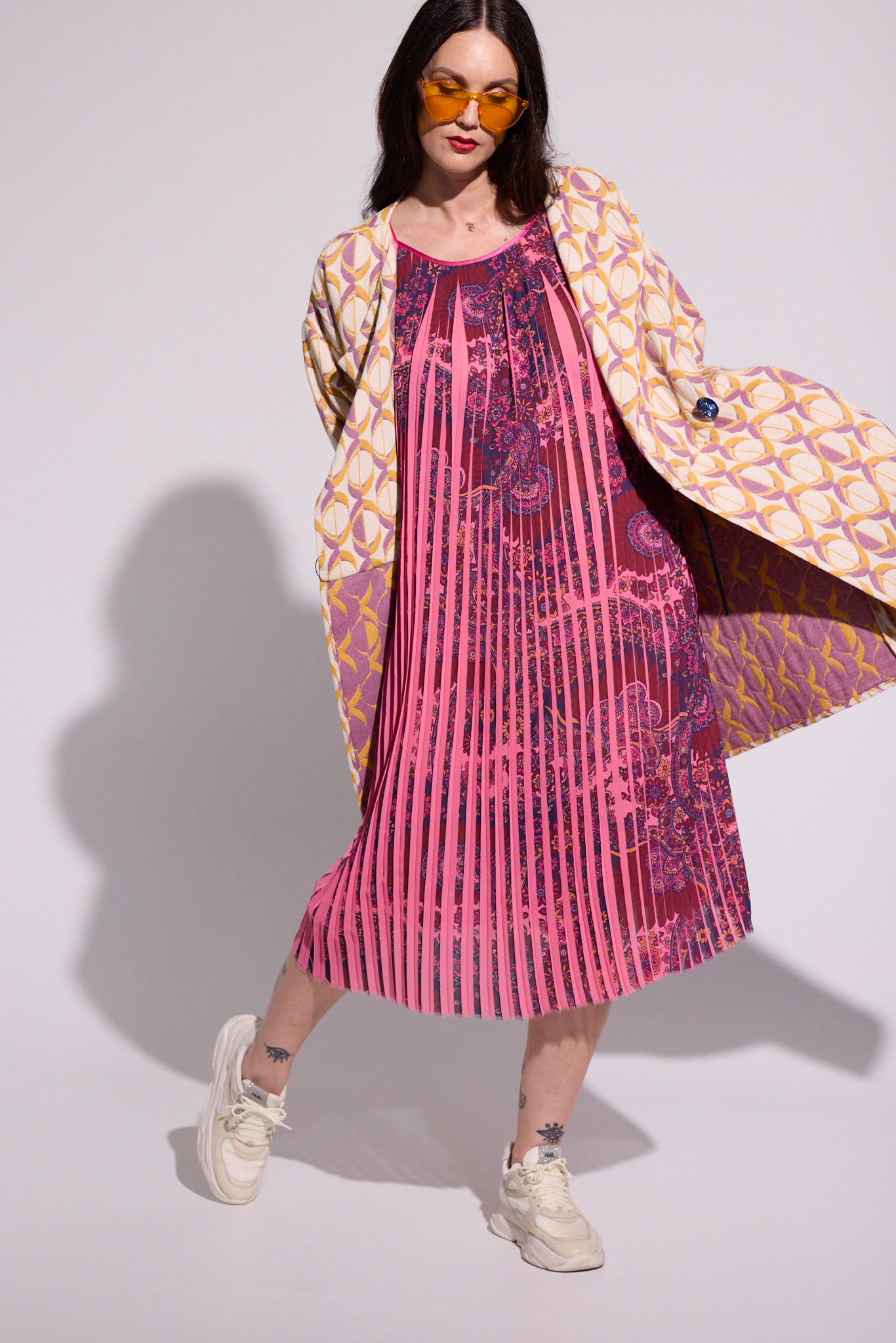 Style: Cut from a one-of-a-kind pleat-printed chiffon, this spaghetti strap swing dress is a full-flowing & draping dress with a raw hem. A gorgeously weighted high summer dress.