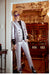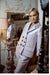 Style: Square and structured double breasted Jacket. Sleek wide lapels, a short single vent and welt flap pockets, cut from a light lurex twill suiting, with a cropped length and 3/4 sleeve